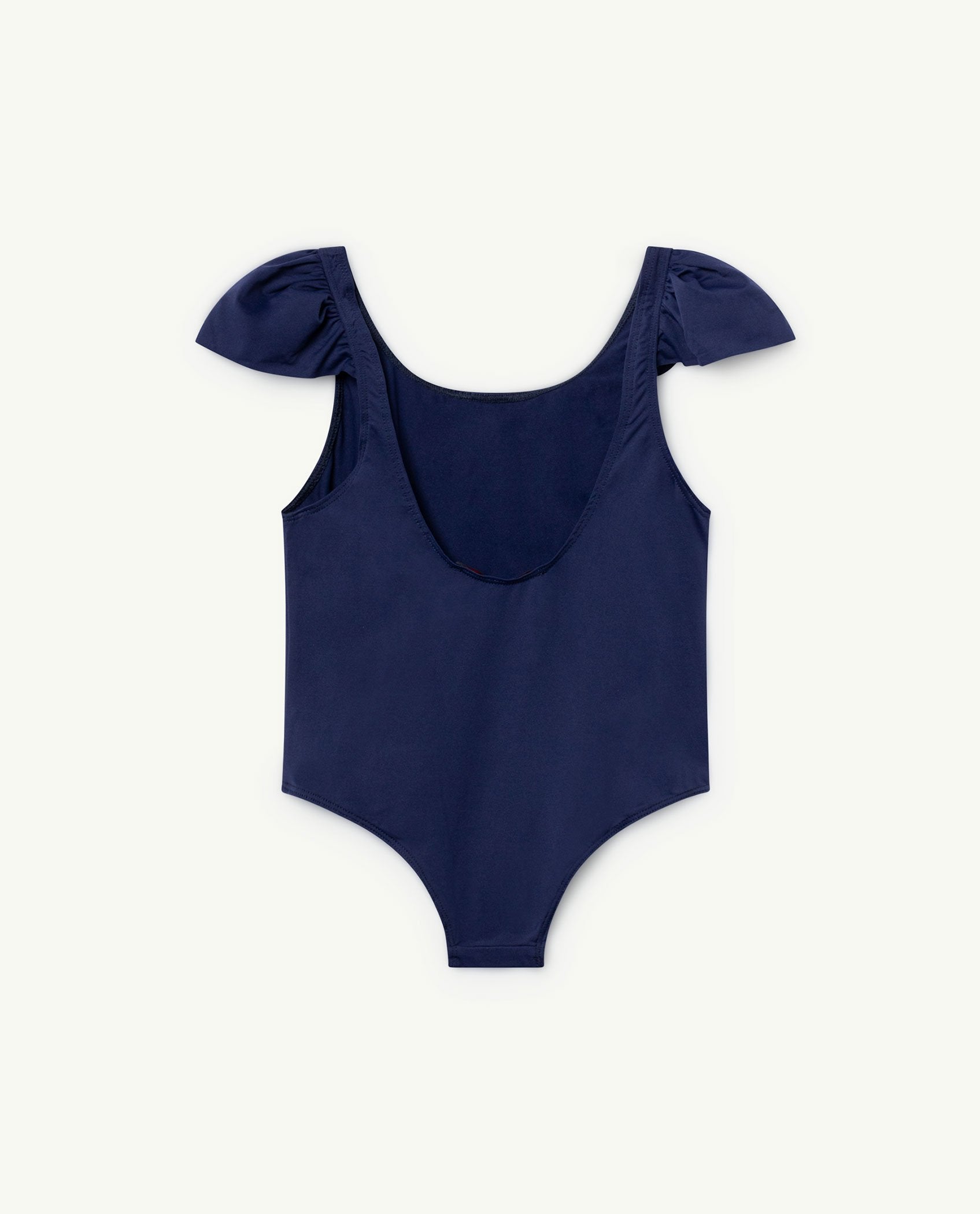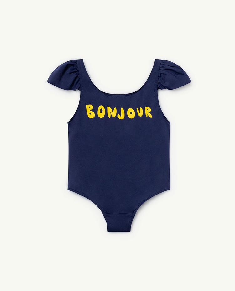 Blue octopus swimsuit, a design with a classic touch, bold colours and hand-written printed lettering. The soft, stretchy fabric also has 50+ uv protection.