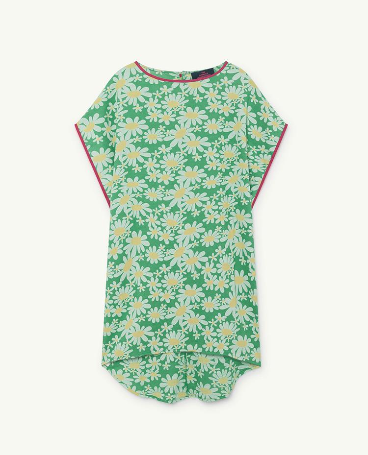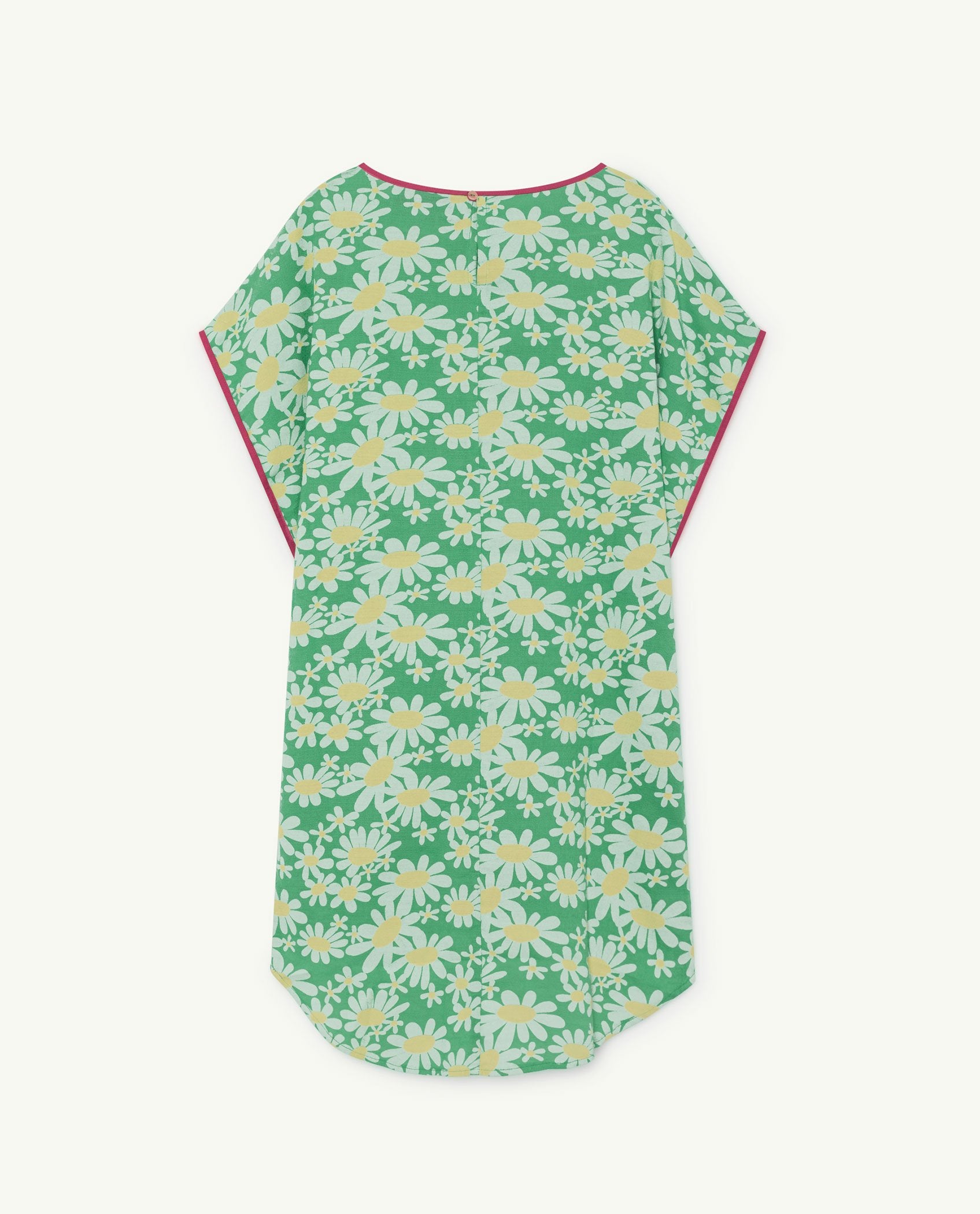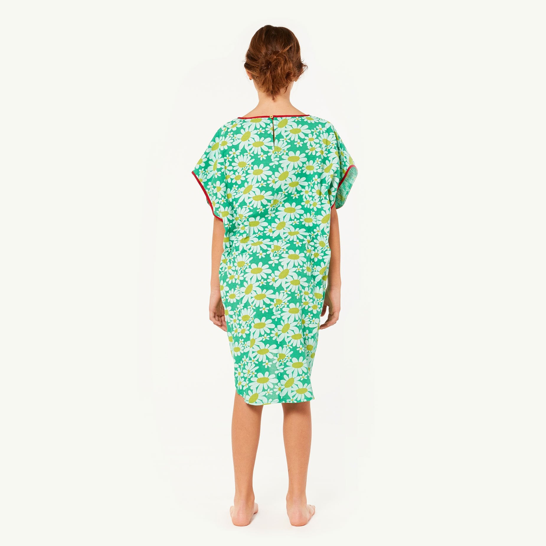 Green hummingbird dress, in ethereal cotton and summery prints, this design features diagonal sleeves for enhanced comfort and coolness. Sleeves and neckline embroidered in red.