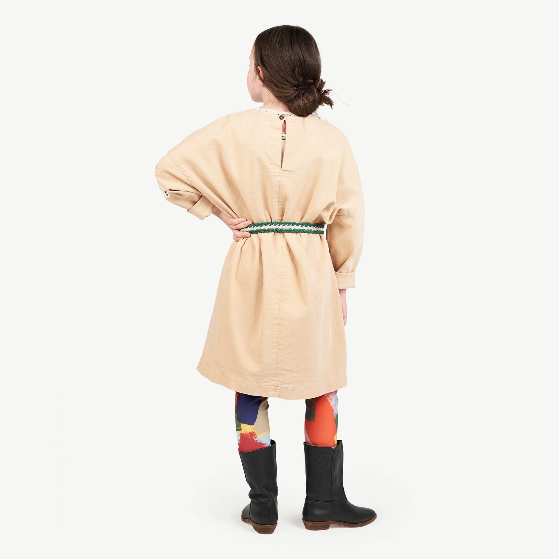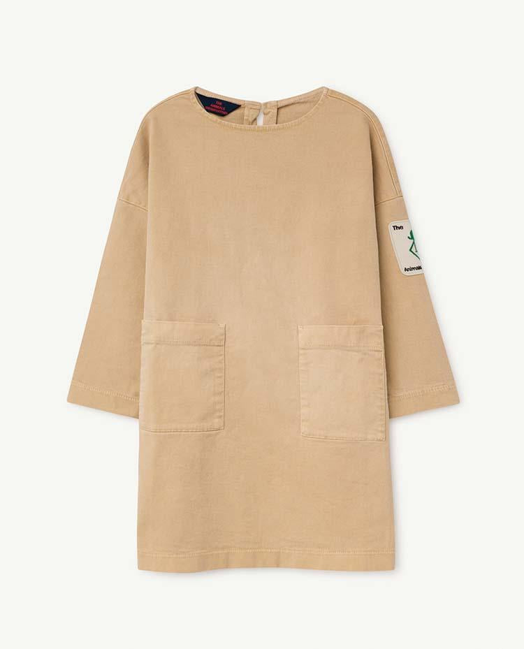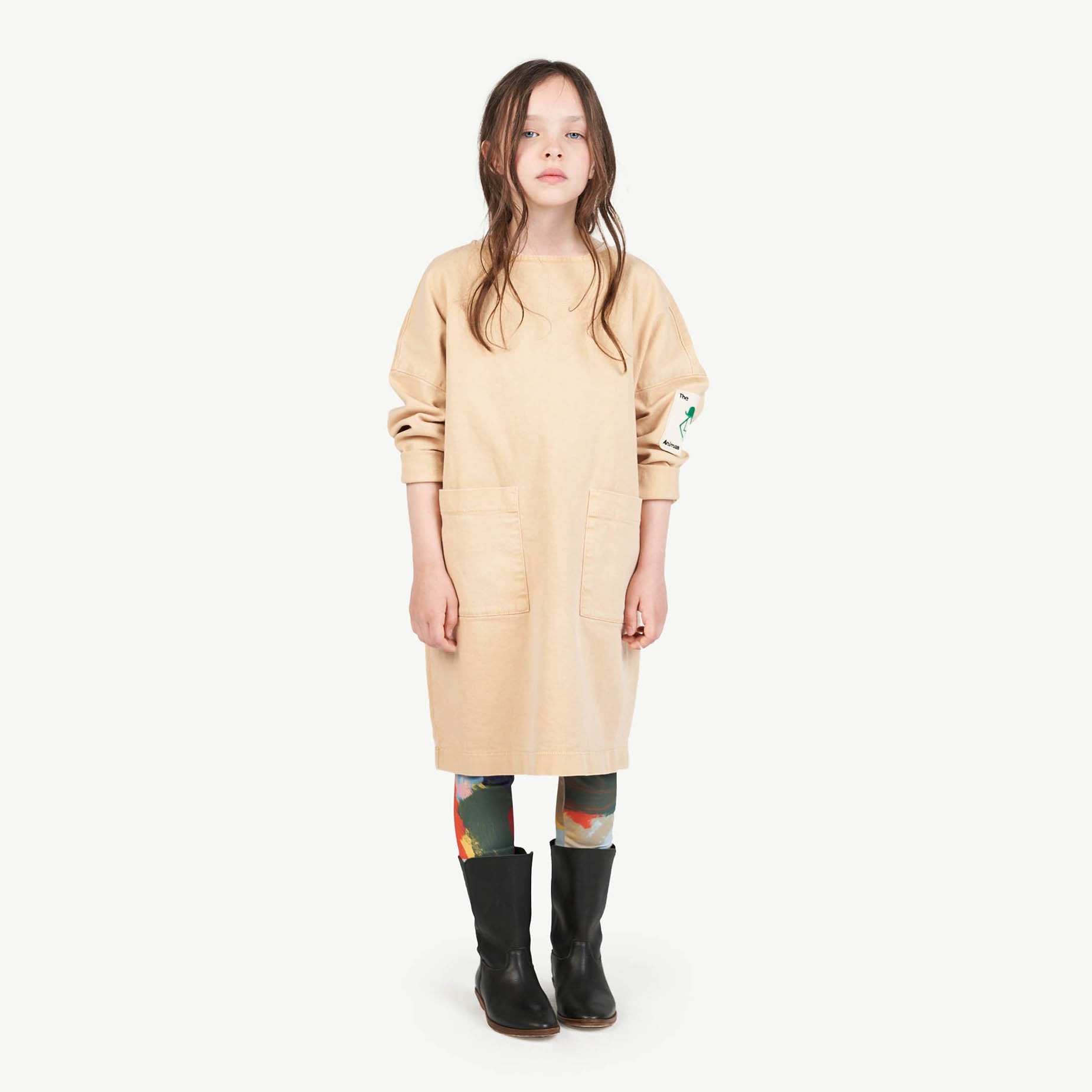The Beige Swallow Dress is easy and effortless. This relaxed midi-legth dress with drop shoulder, 3/4 length sleeves, and two oversized front pockets make this a closet staple. Back button closure, 70% cotton, 29% recycled cotton, 1% elastane.