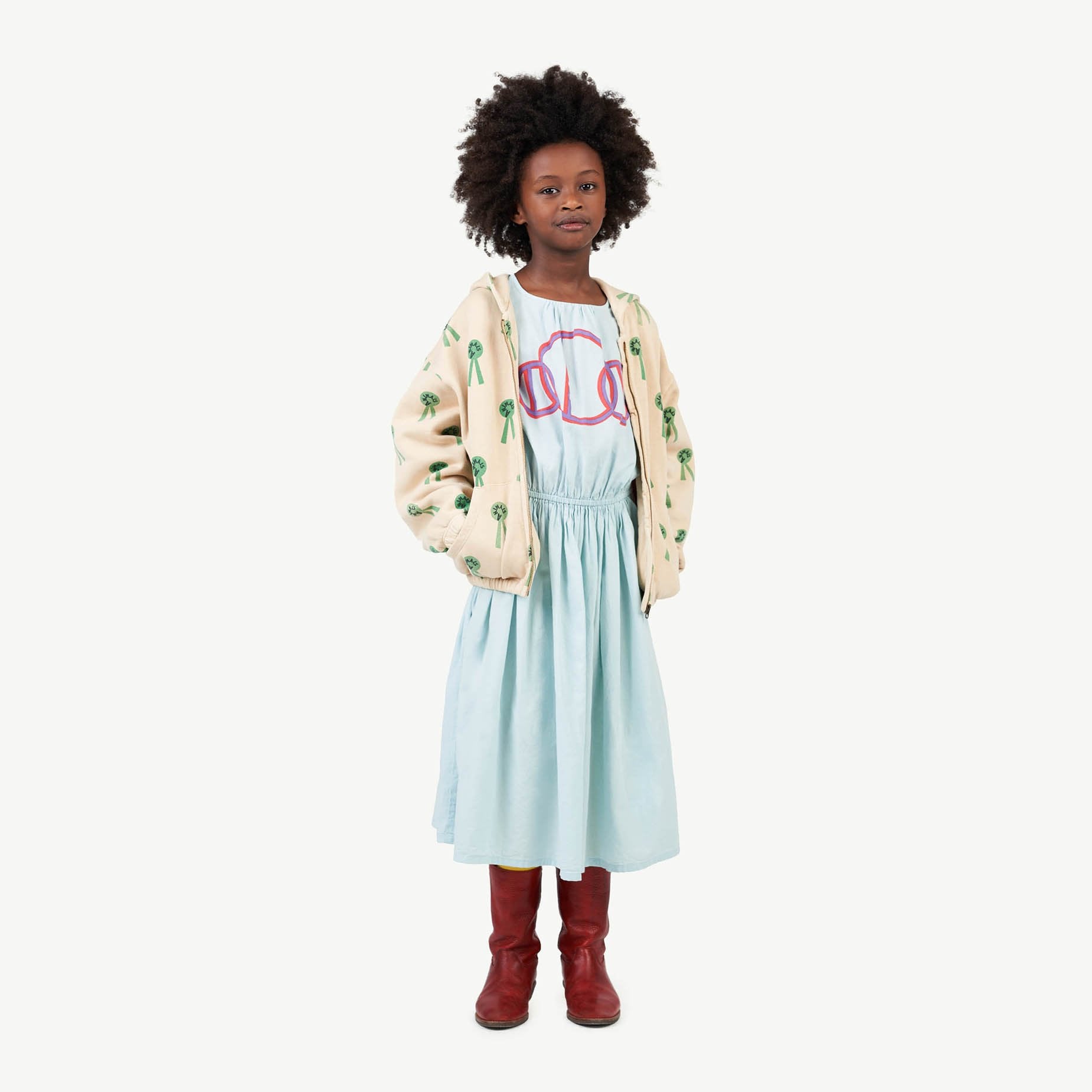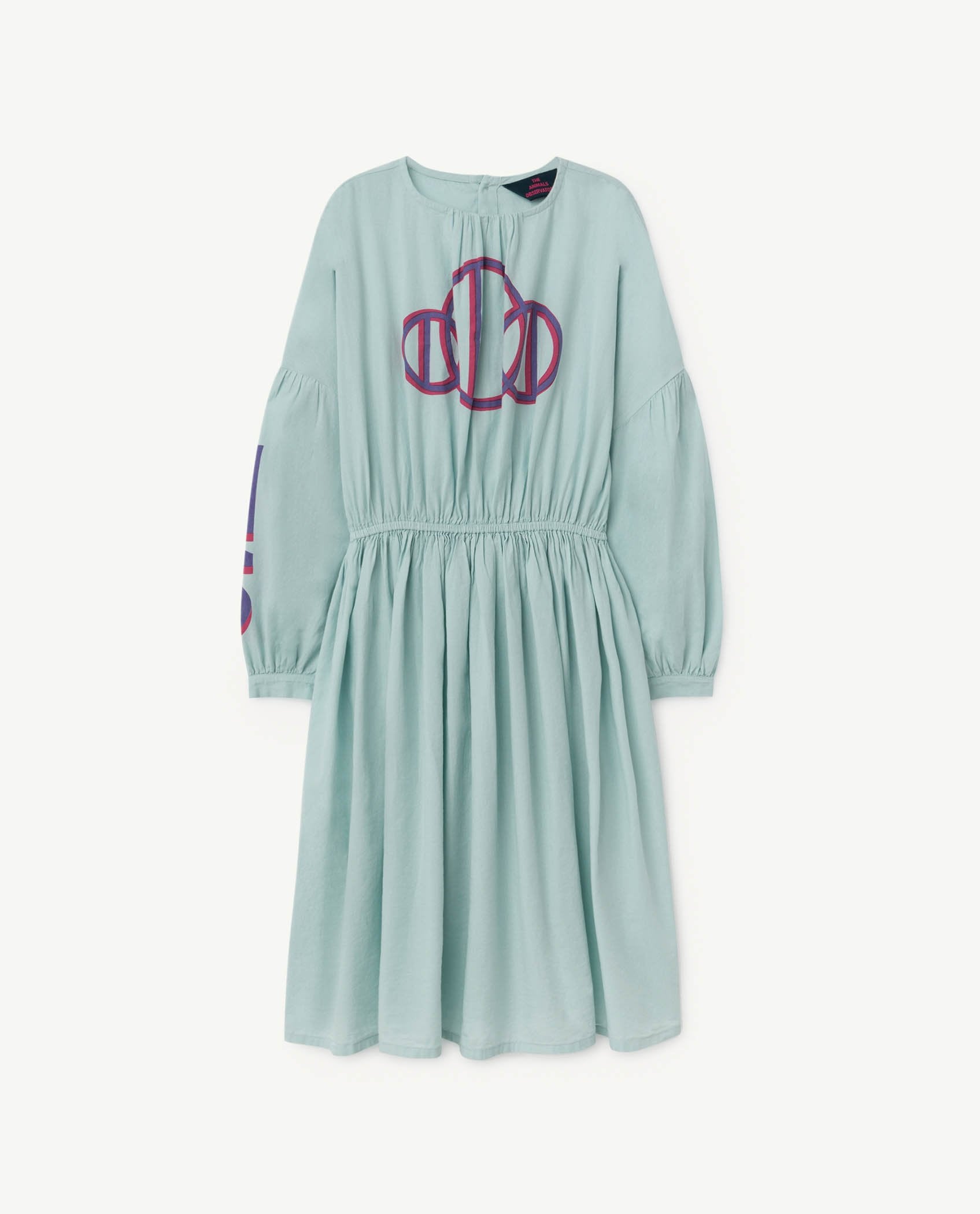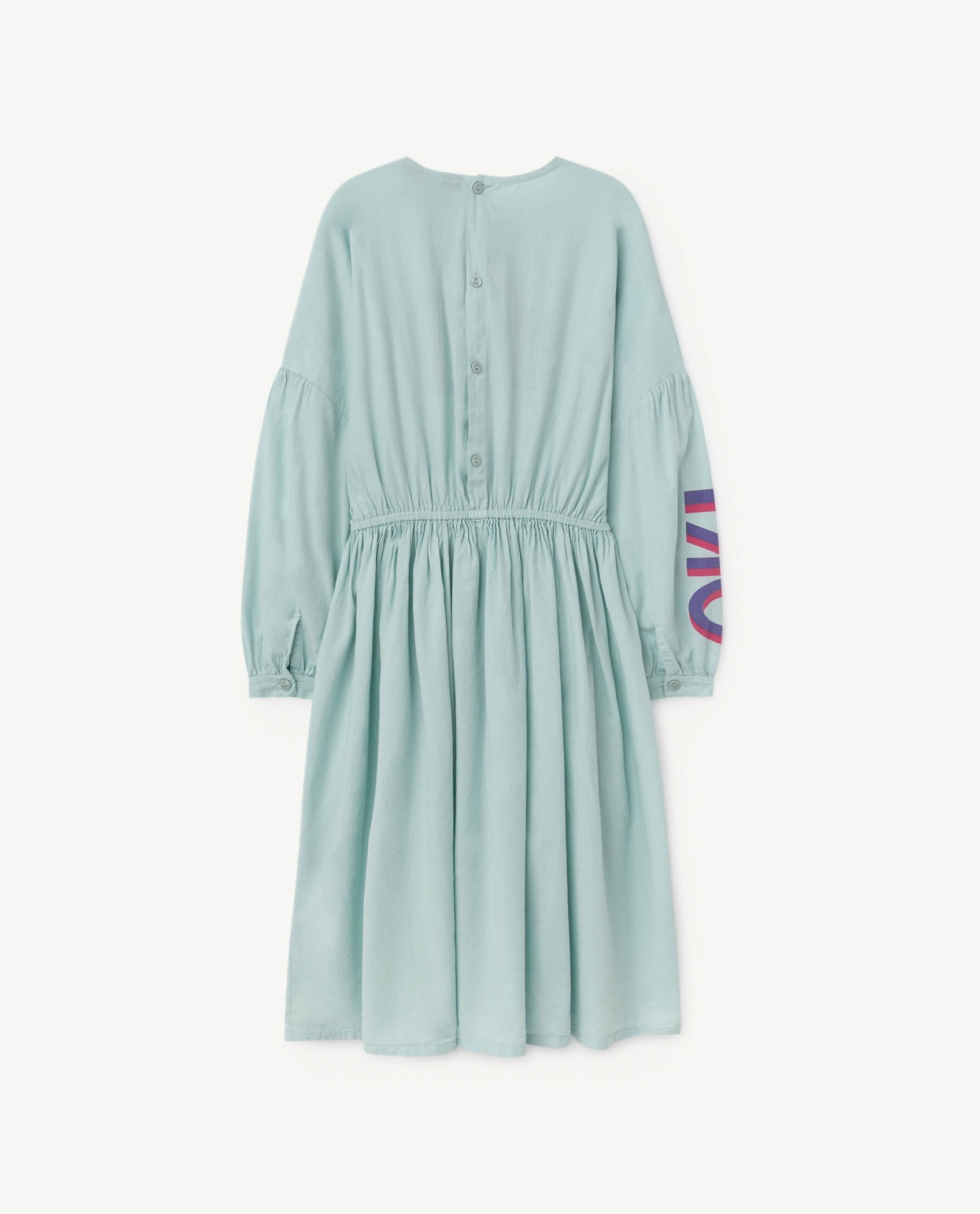 The Blue Tortoise Dress has a poetic elegance with its gathered skirt and blouson sleeve with large central print and sleeve. Midi length. 100% cotton.
