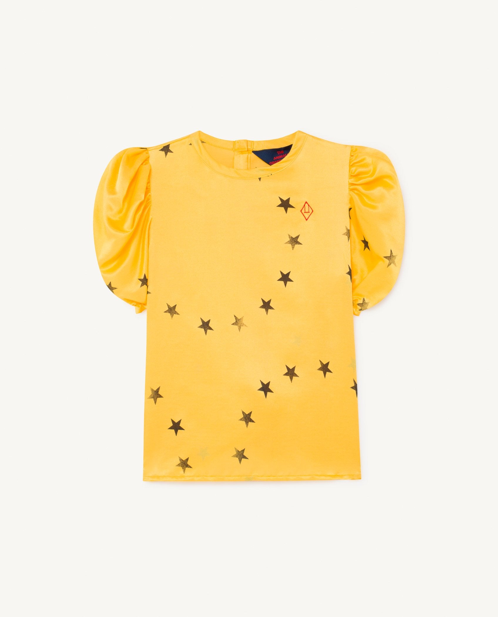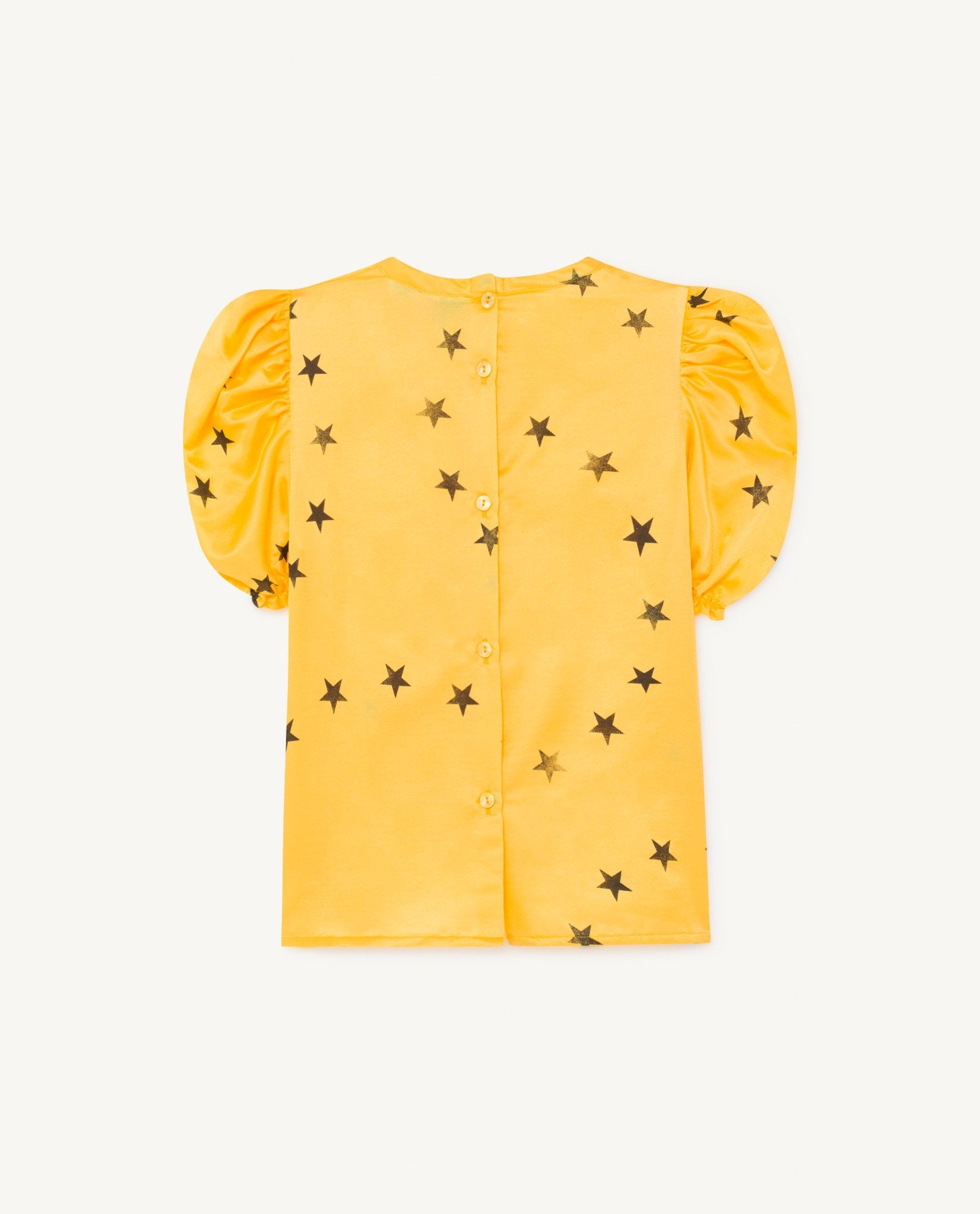 The Yellow Canary Blouse made from silk and cotton is a star piece with puffy sleeves, buttons and a graphic print.