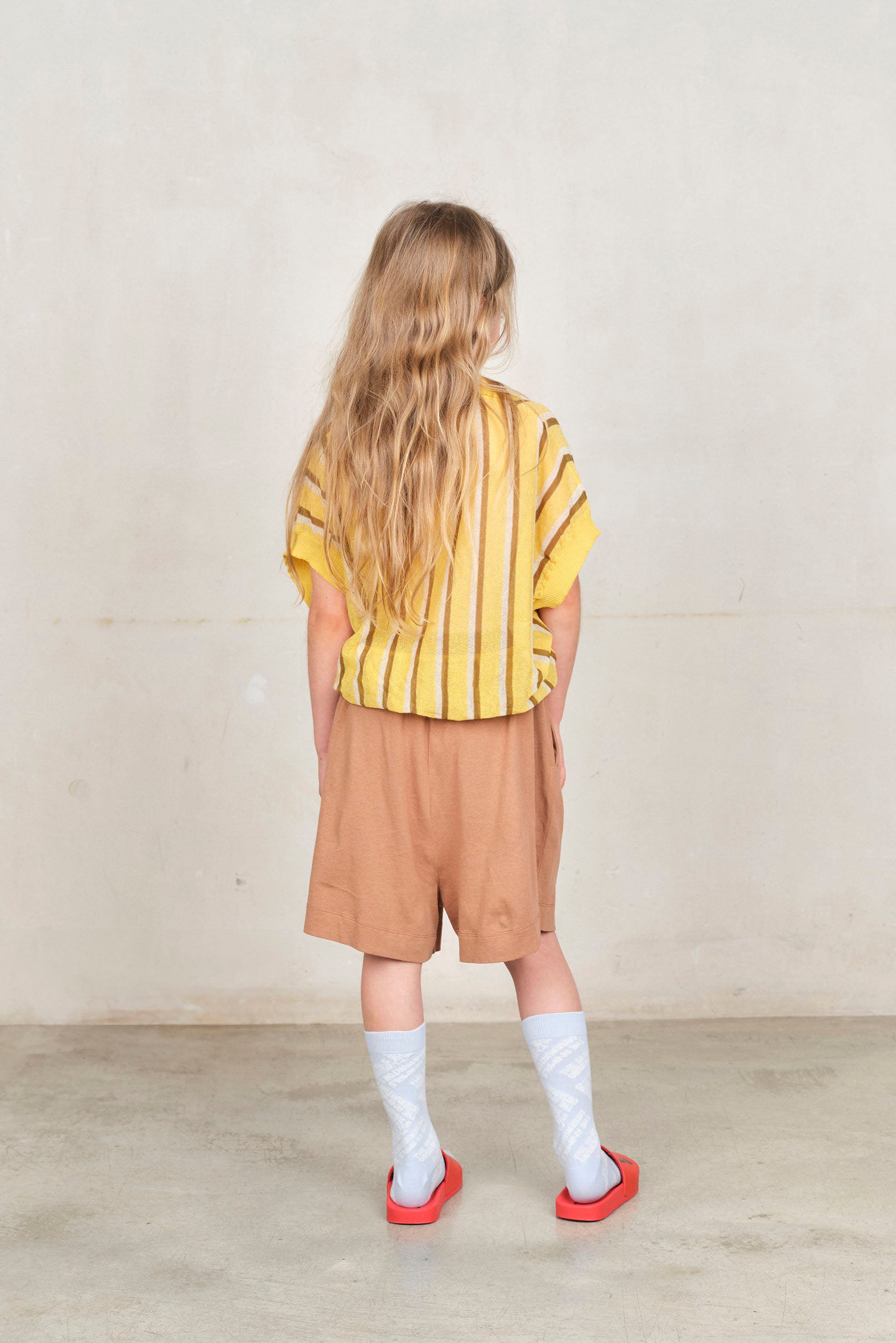 Quant à nos livraisons, nous utilisons des étiquettes volantes fabriquées avec du papier recyclé. Nos emballages sont fabriqués avec des sacs en papier kraft (qui utilisent moins de produits chimiques de blanchiment pendant le processus de production). Nous avons également du ruban adhésif d'emballage en papier. Les sacs plastiques qui maintiennent les vêtements dans l'emballage sont recyclés et recyclables.