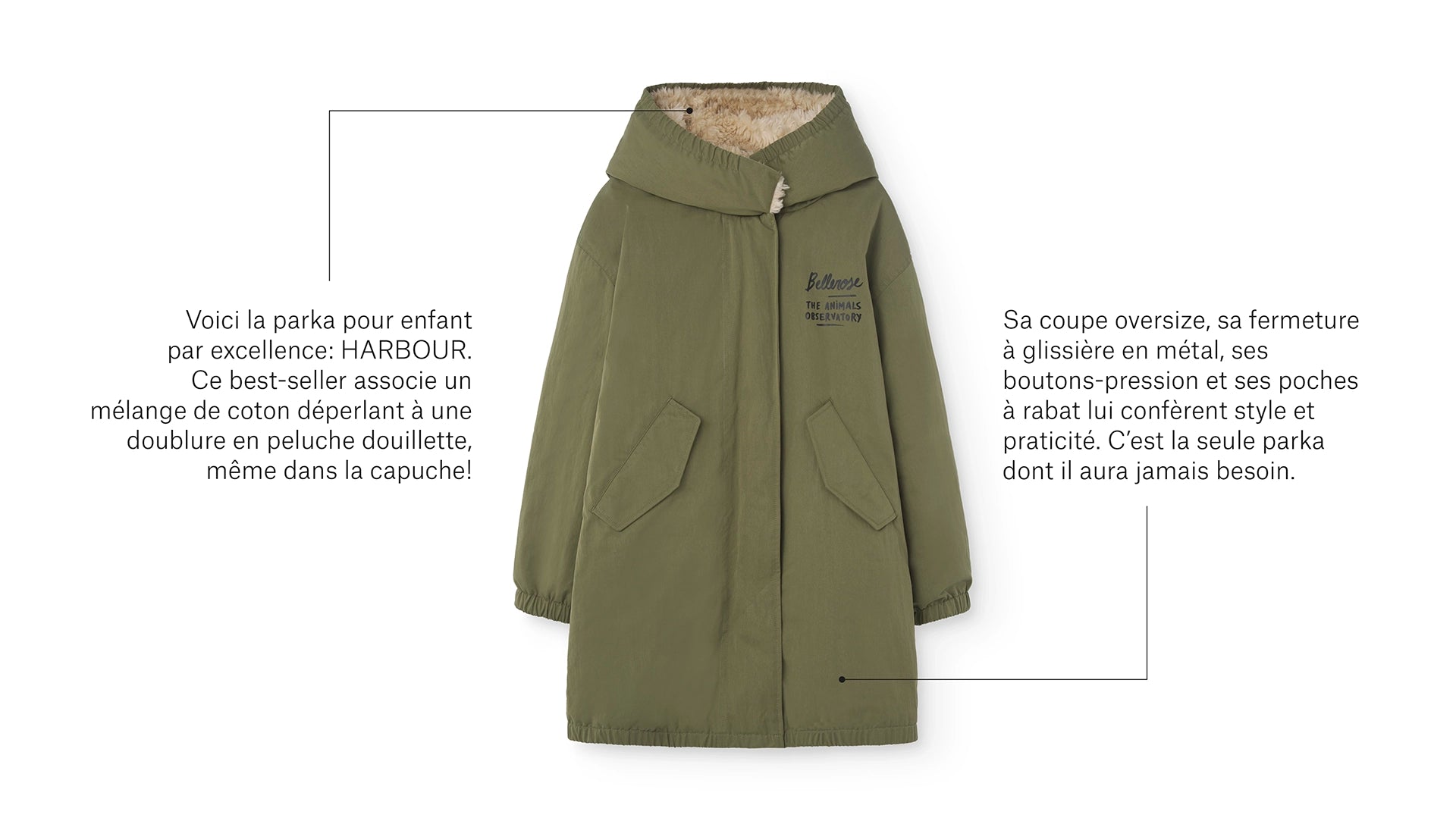 Voici la parka pour enfant par excellence : HARBOUR. Ce best-seller associe un mélange de coton déperlant à une doublure en peluche douillette, même dans la capuche ! Sa coupe oversize, sa fermeture à glissière en métal, ses boutons-pression et ses poches à rabat lui confèrent style et praticité. C’est la seule parka dont il aura jamais besoin.