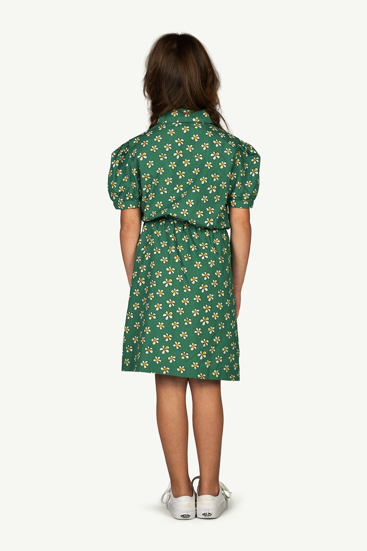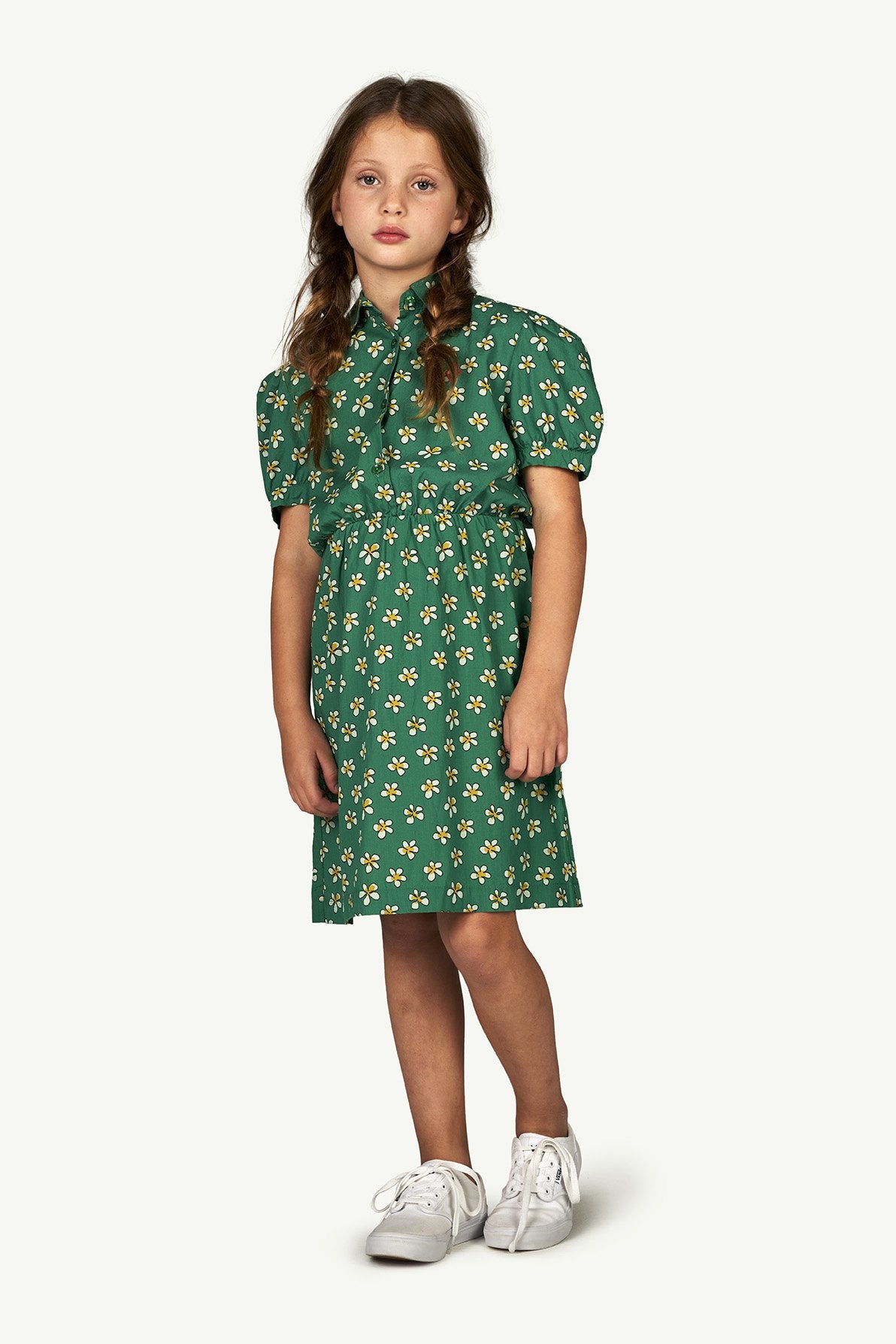 Flower power is in the spirit of this short sleeve Green Flowers Pigeon Dress. Fresh and ready to go for a walk in the afternoon or a day full of scholarly activities. With an elastic waist, époque collar and purple The Animals Observatory logo. The model's height is 130 cm and is wearing size 8 years.