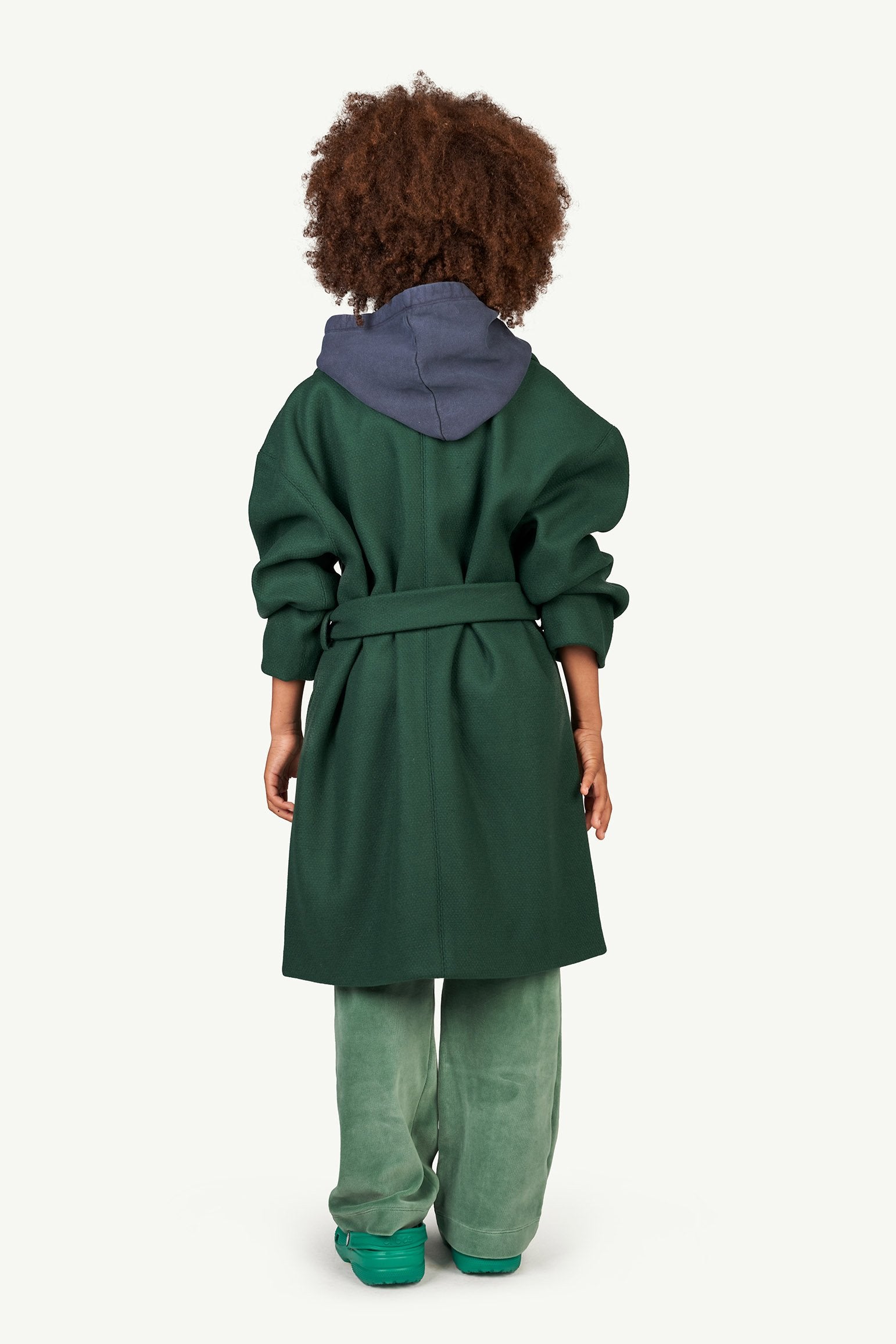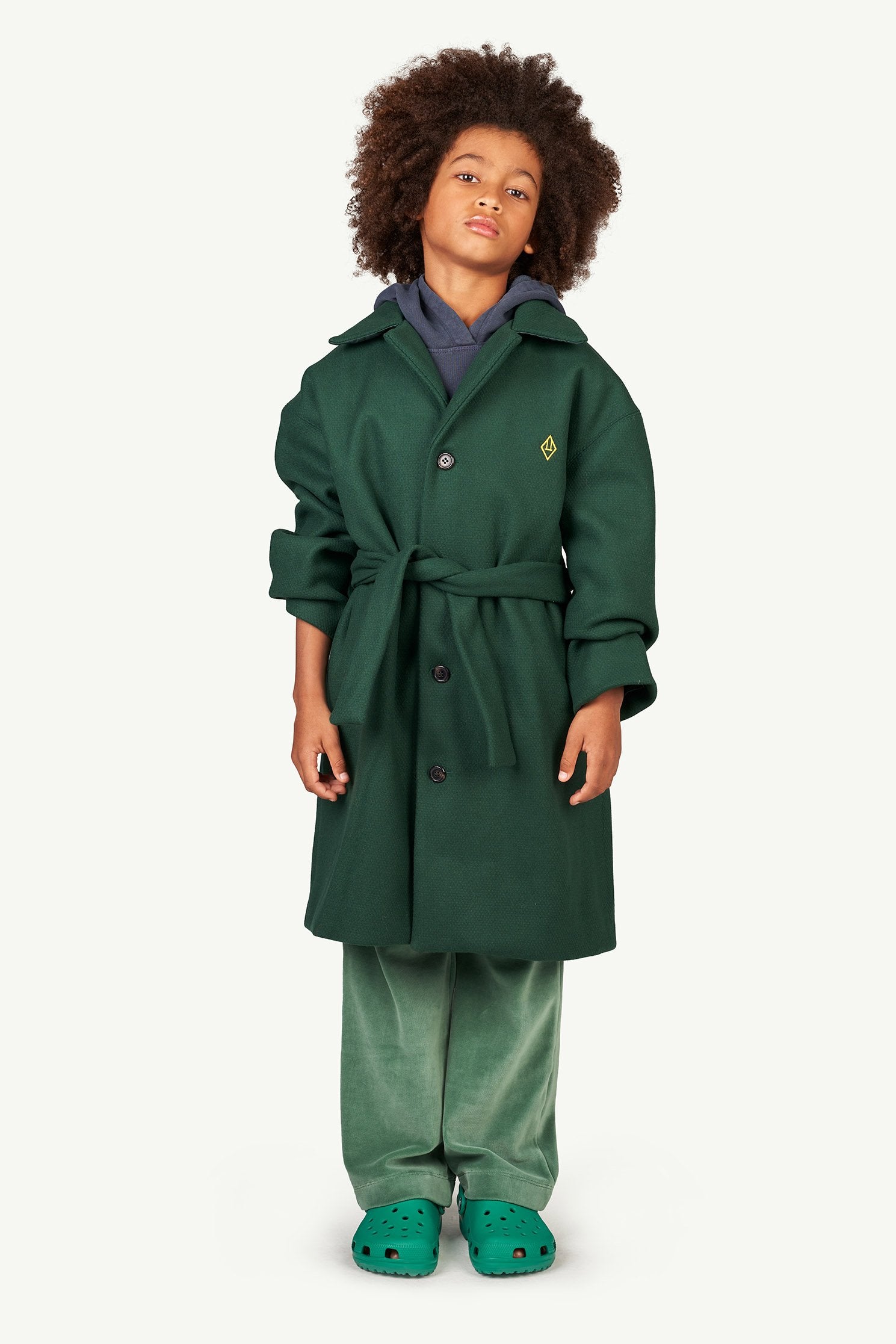 This Green Jaguar Kids relaxed fit Jaquet resembles a Chesterfield coat that buttons up in the front and has a small The Animals Observatory logo on the upper-right side. It is lined and has a belt at the waist. The model's height is 131 cm and is wearing size 8 years.