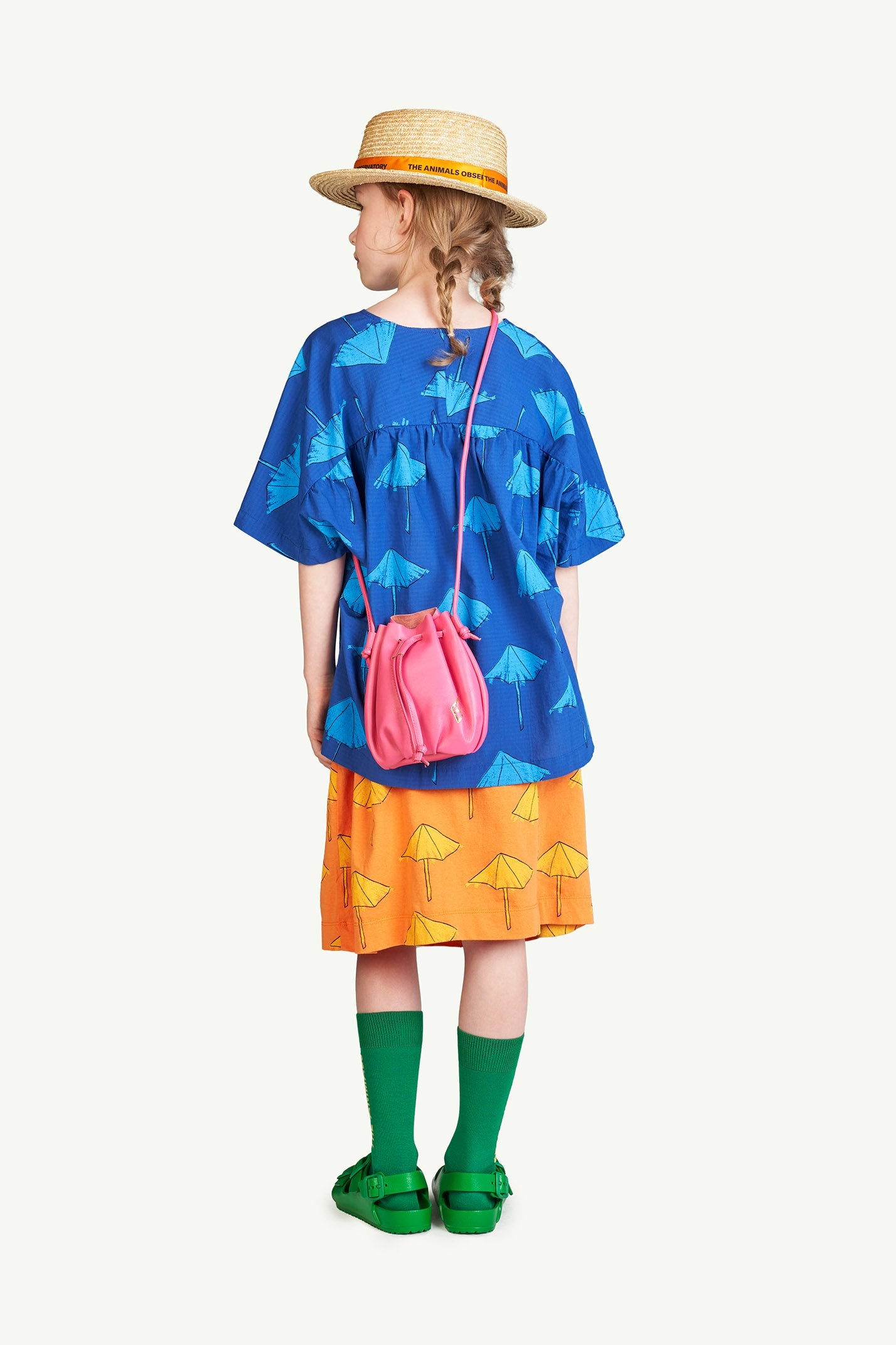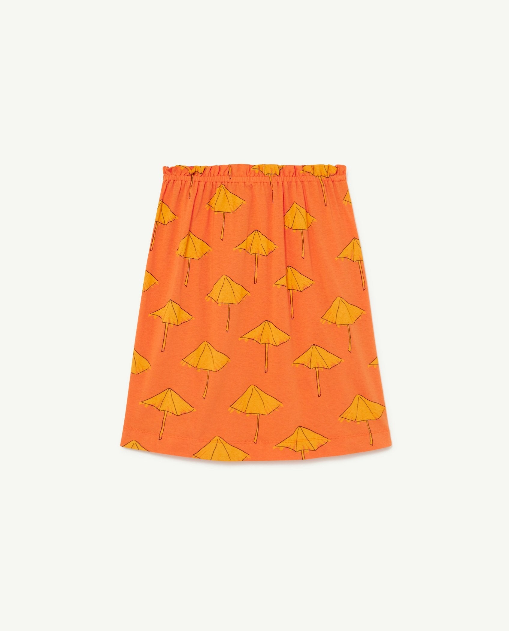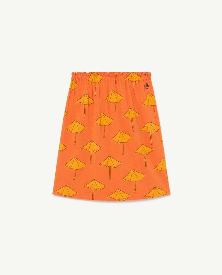 The Orange Umbrellas Kitten Skirt is an above-the-knee length long skirt with an elastic waist and fully cotton made. The skirt features yellow umbrellas all over it. The model's height is 130 cm and is wearing size 8 years.