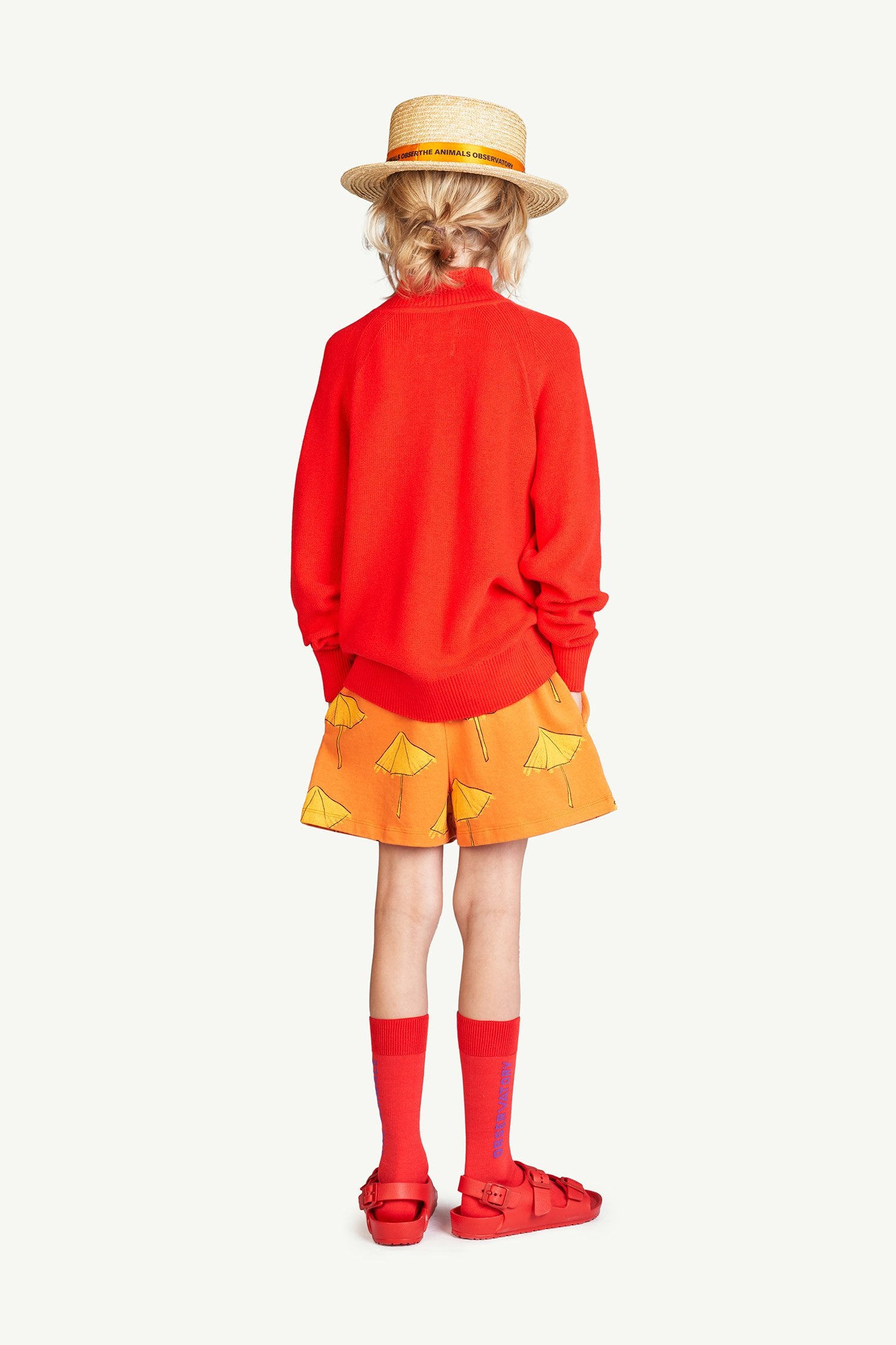 The Orange Umbrellas Poodle Pants are perfect to combine with a Rooster T-Shirt. Fresh and comfortable, this shorts feature yellow umbrellas all over them. The model's height is 132 and is wearing size 8 years.