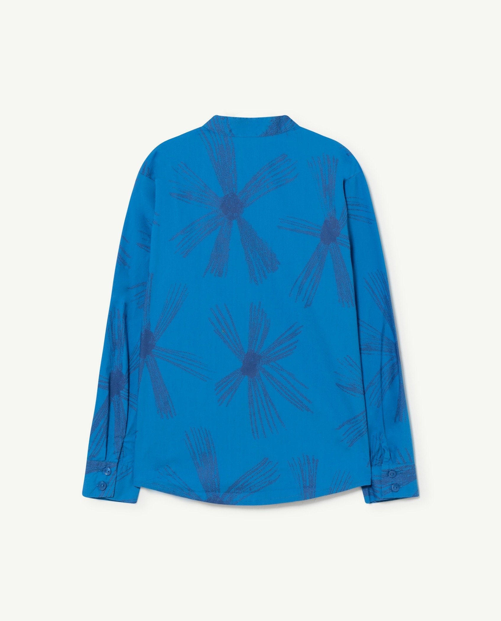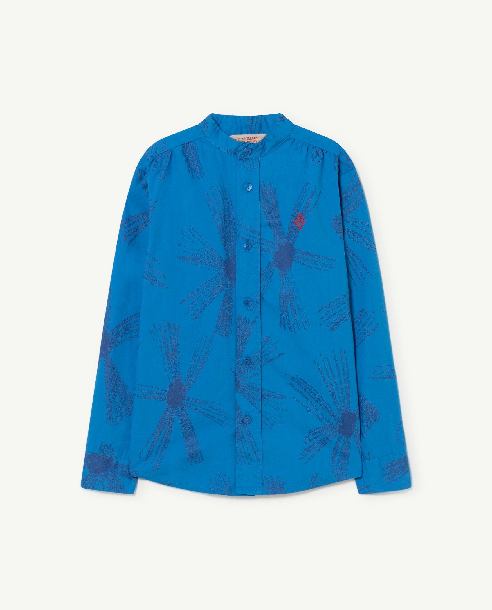 This Blue Scorpion Kids regular fit Shirt original deep blue prints all over. With button cuffs, a Mao collar and a small The Animals Observatory logo on the front side. The model's height is 131 cm and is wearing size 8 years.