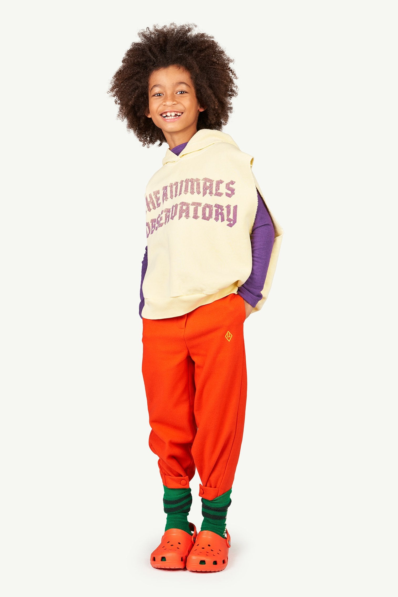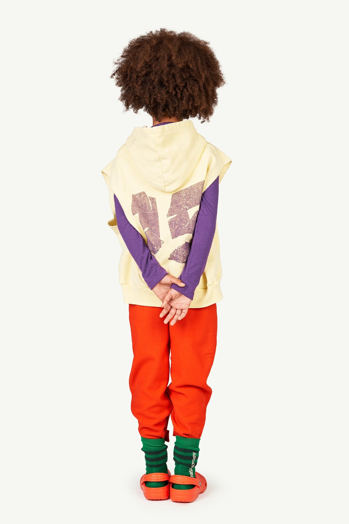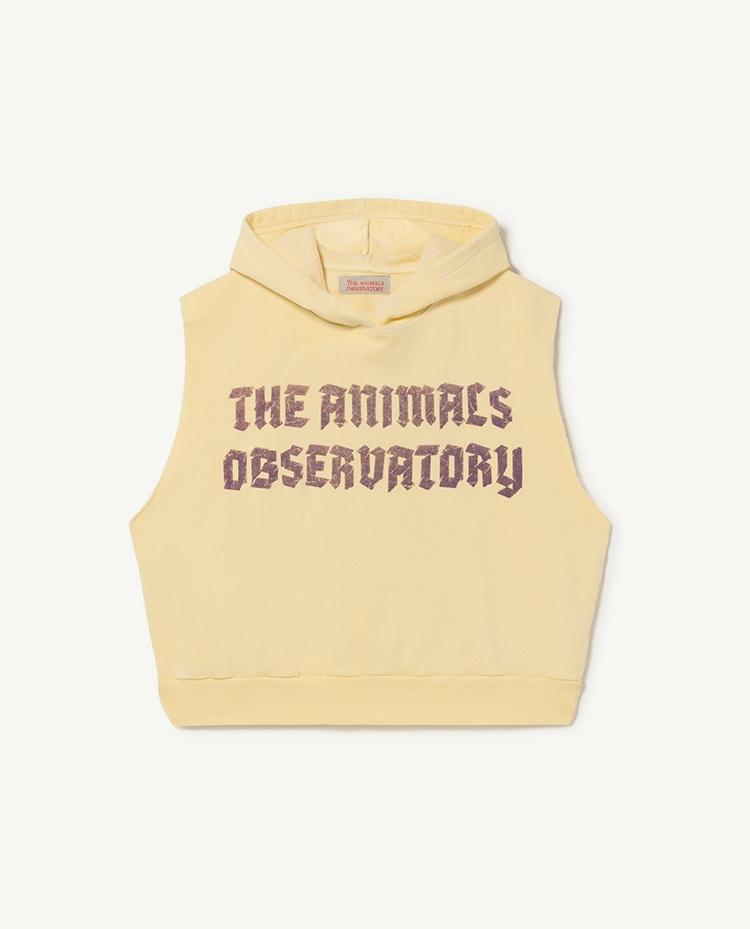 This Yellow Whale Kids relaxed fit Sweatshirt hooded vest has a vivid punk vibe. The Animals Observatory capital letters cross chest on the front side and number 15 presides the back side. With unravelling armsyces and 100% cotton made. The model's height is 131 cm and is wearing size 8 years.