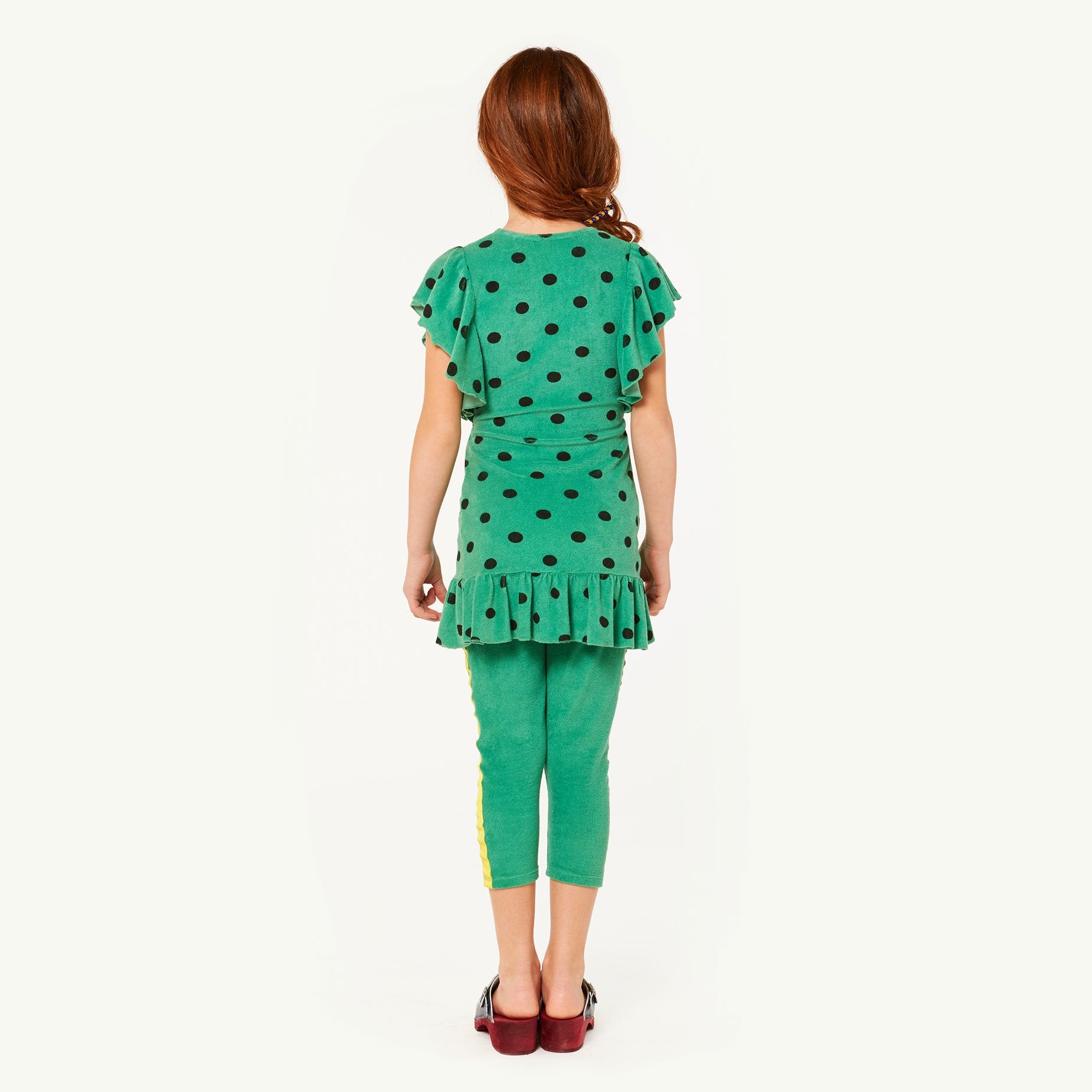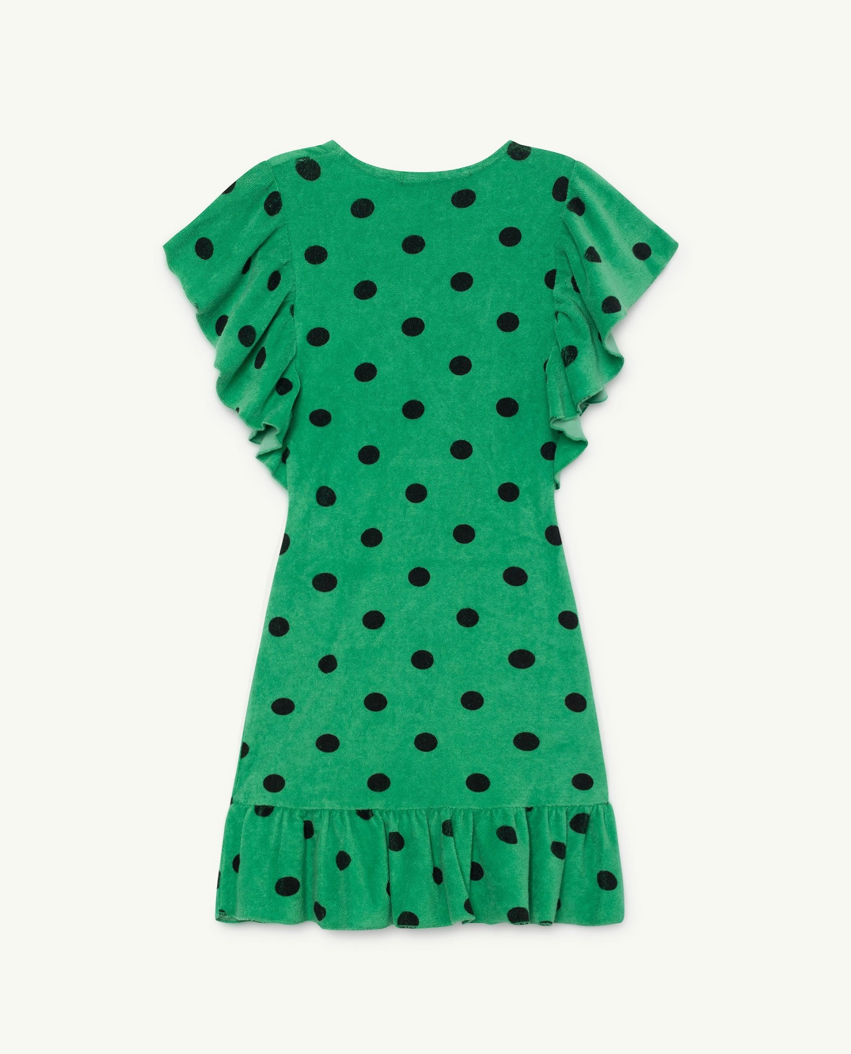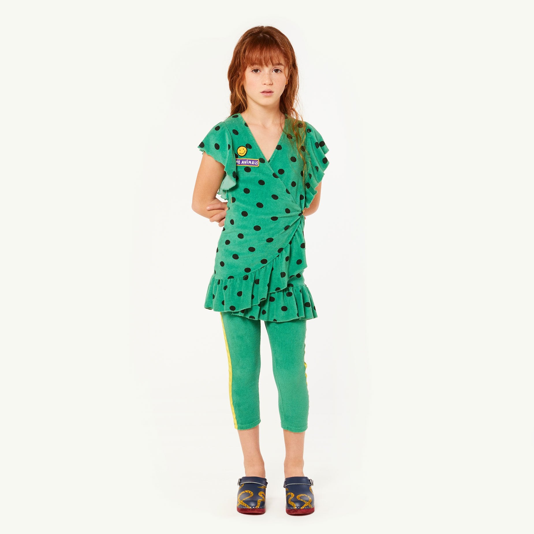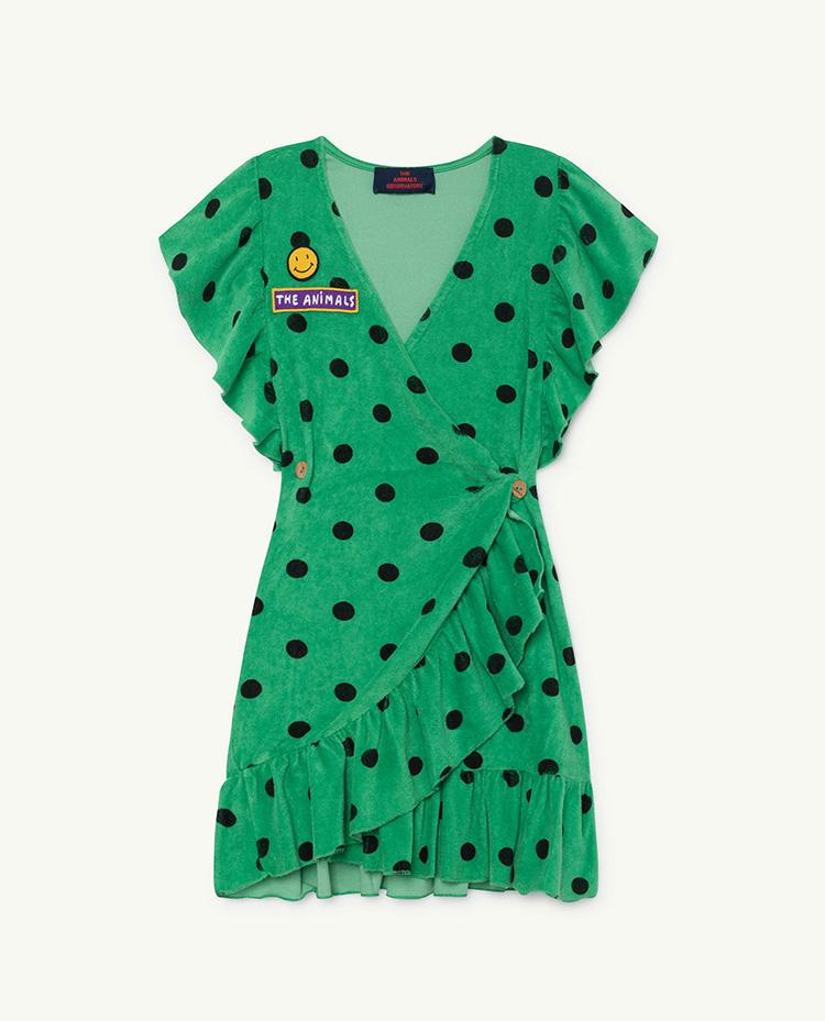 Green whale dress, a fresh combination of cool fabrics, a flirty wrap cut and boldly stylish prints and colours.