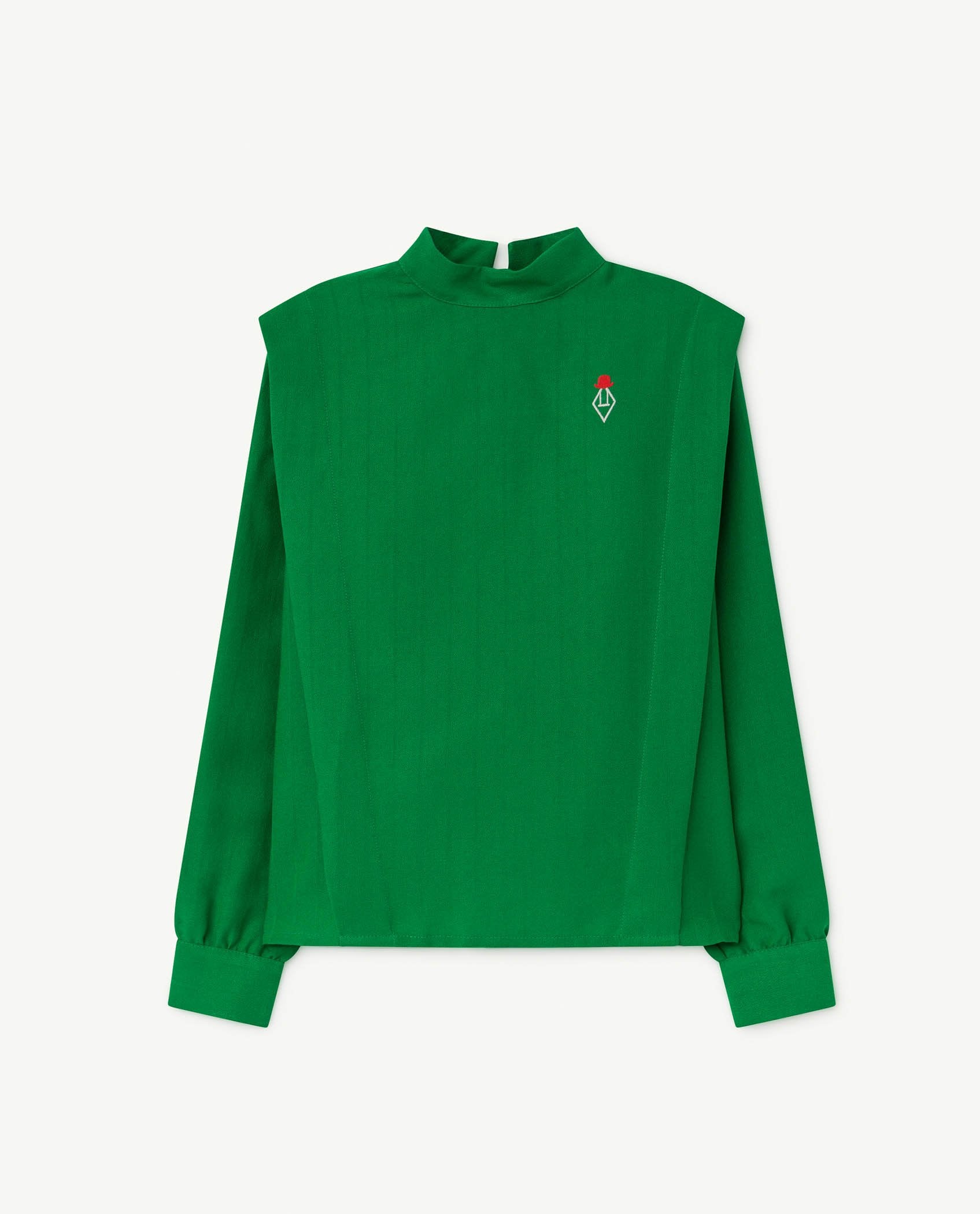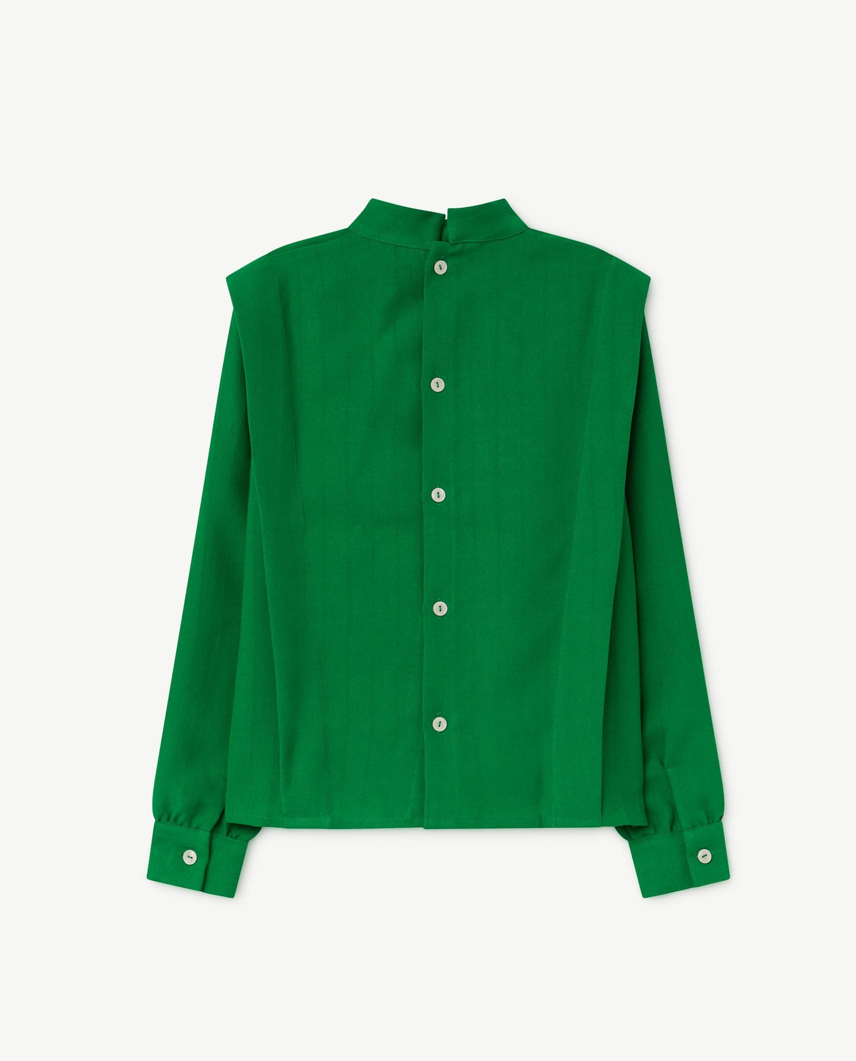 The Green Grass Cuckoo Shirt features a ruffled front yoke, banded collar, charming all-over print, long sleeves that are slightly gathered at the cuff, and a back button closure. 100% cotton.