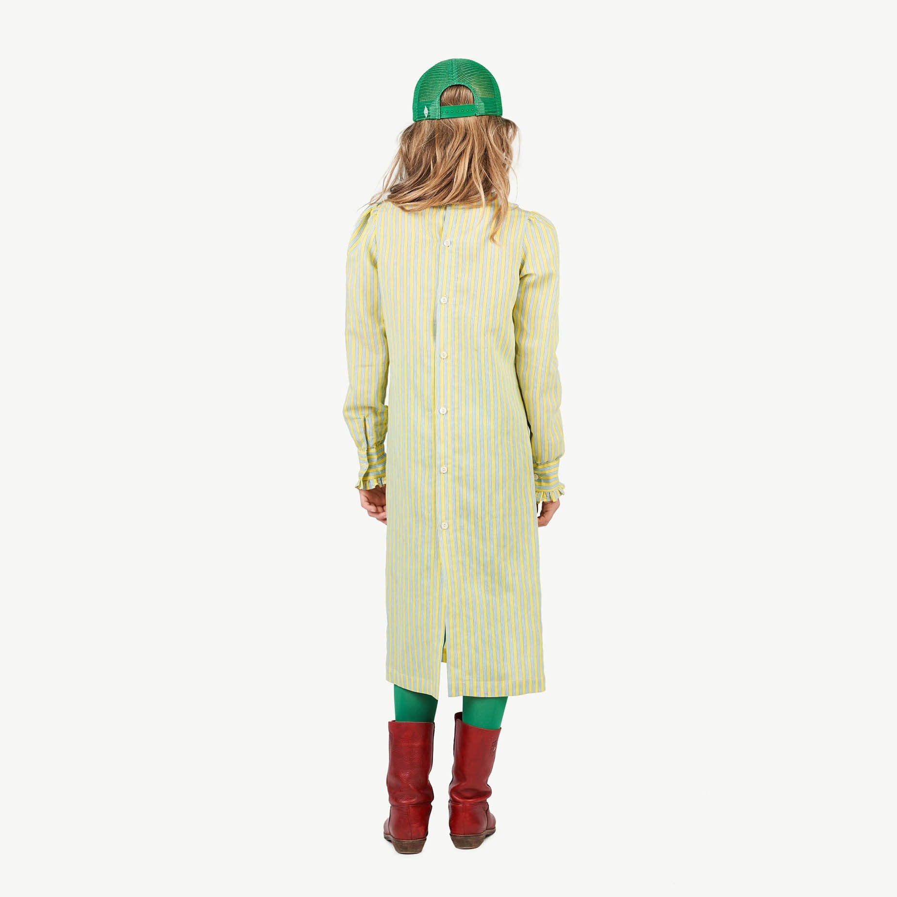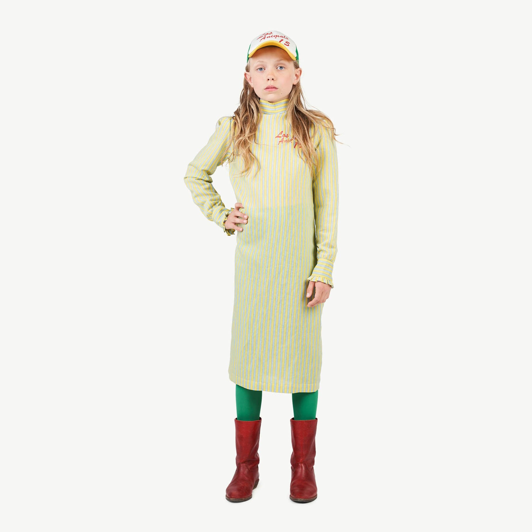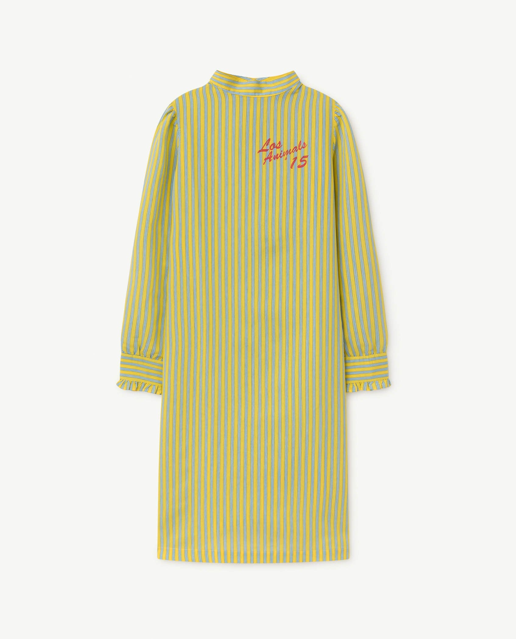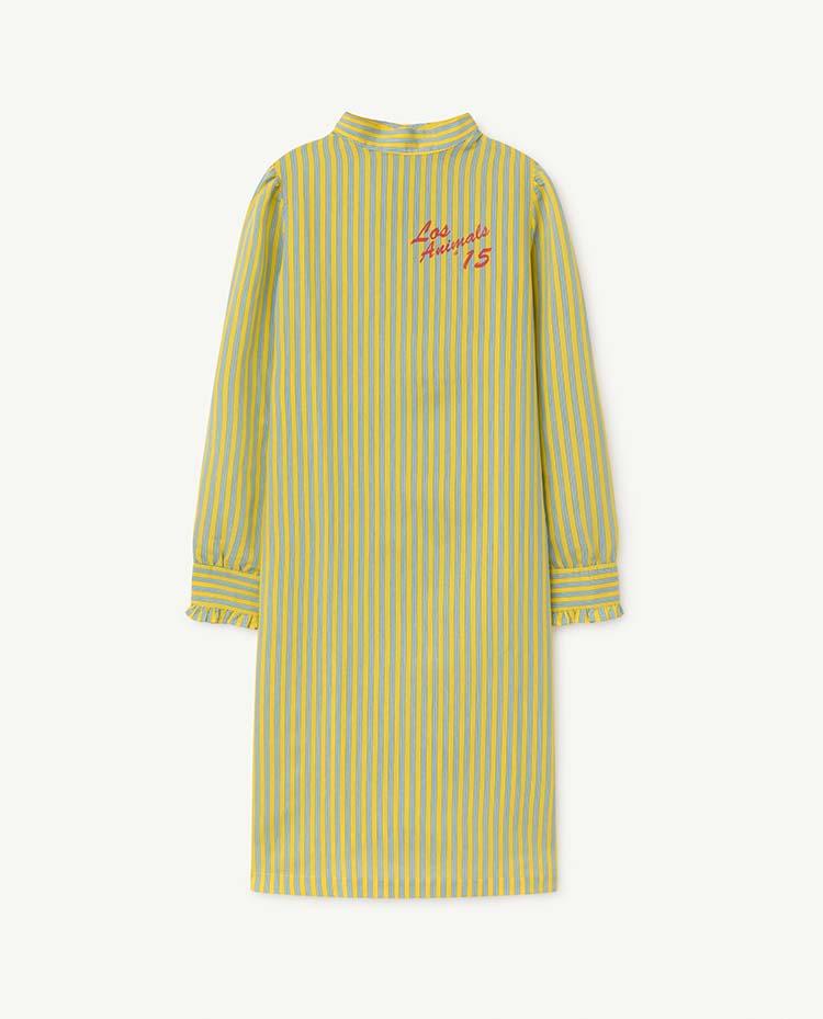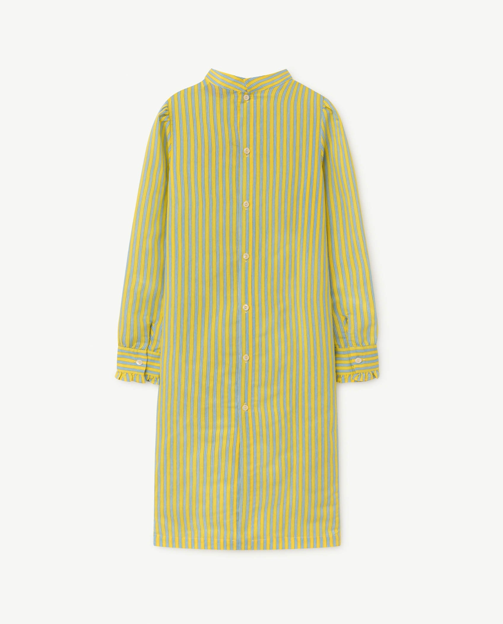 The Yellow Triton Dress is an elegant and chic maxi dress with a banded collar, long sleeves, and straight cut. The Animals Observatory logo embellishment on upper left chest, Drapes beautifully in 81% viscose, 19% polyester.