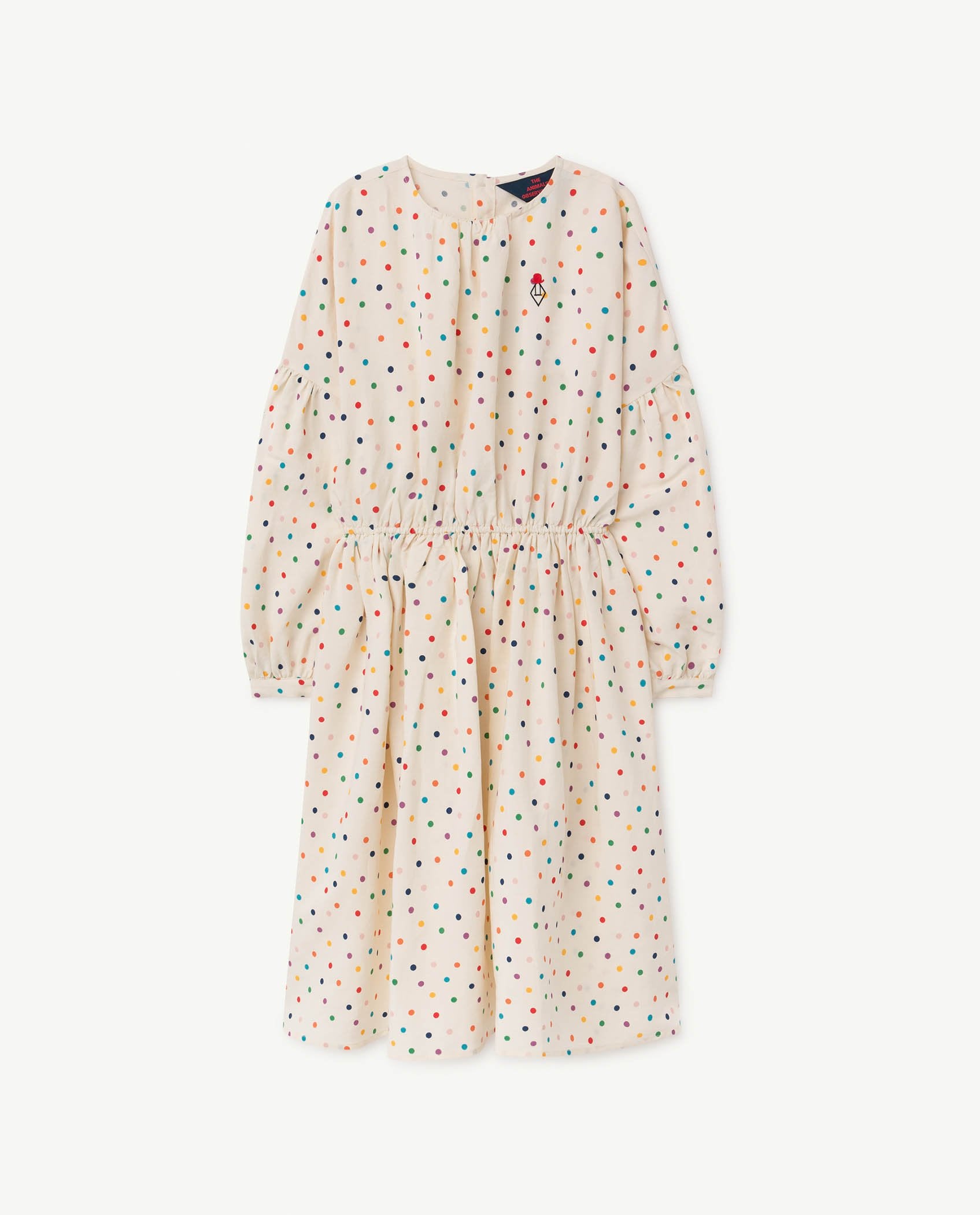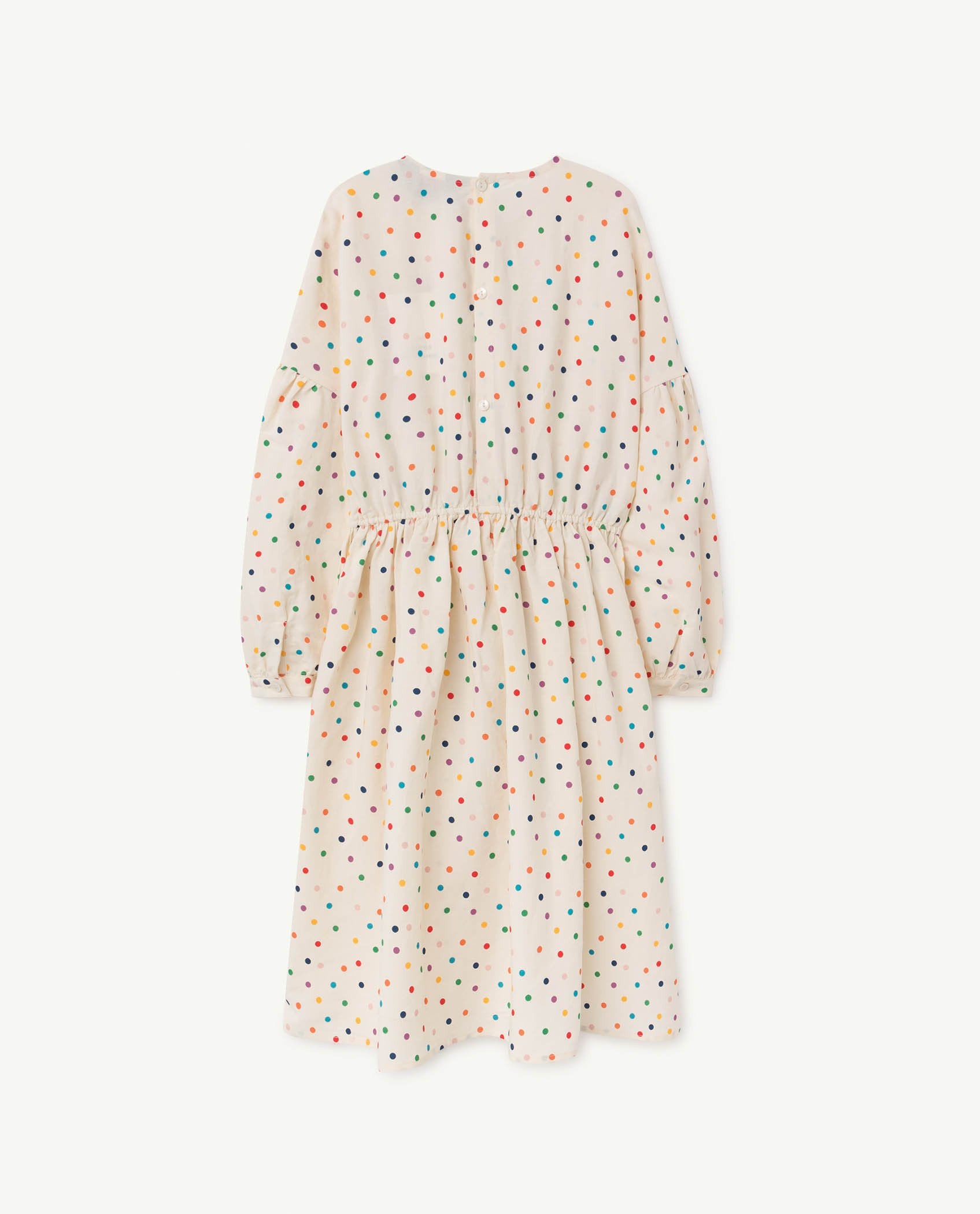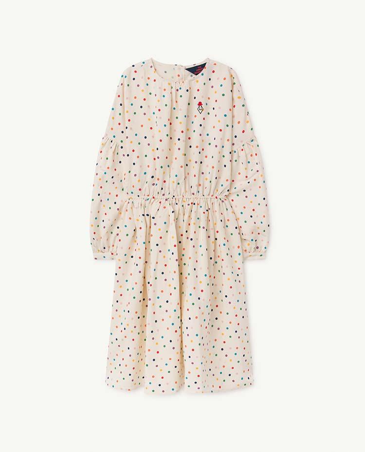 The Raw White Tortoise Dress has a poetic elegance with its gathered skirt and blouson sleeve with large central print and sleeve. Midi length. 60% viscose, 40% linen.