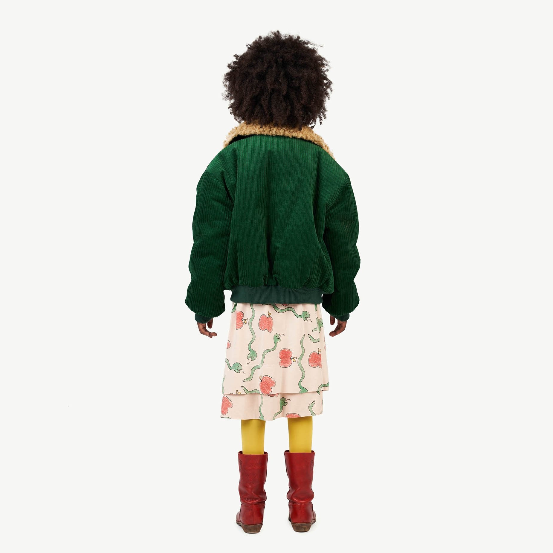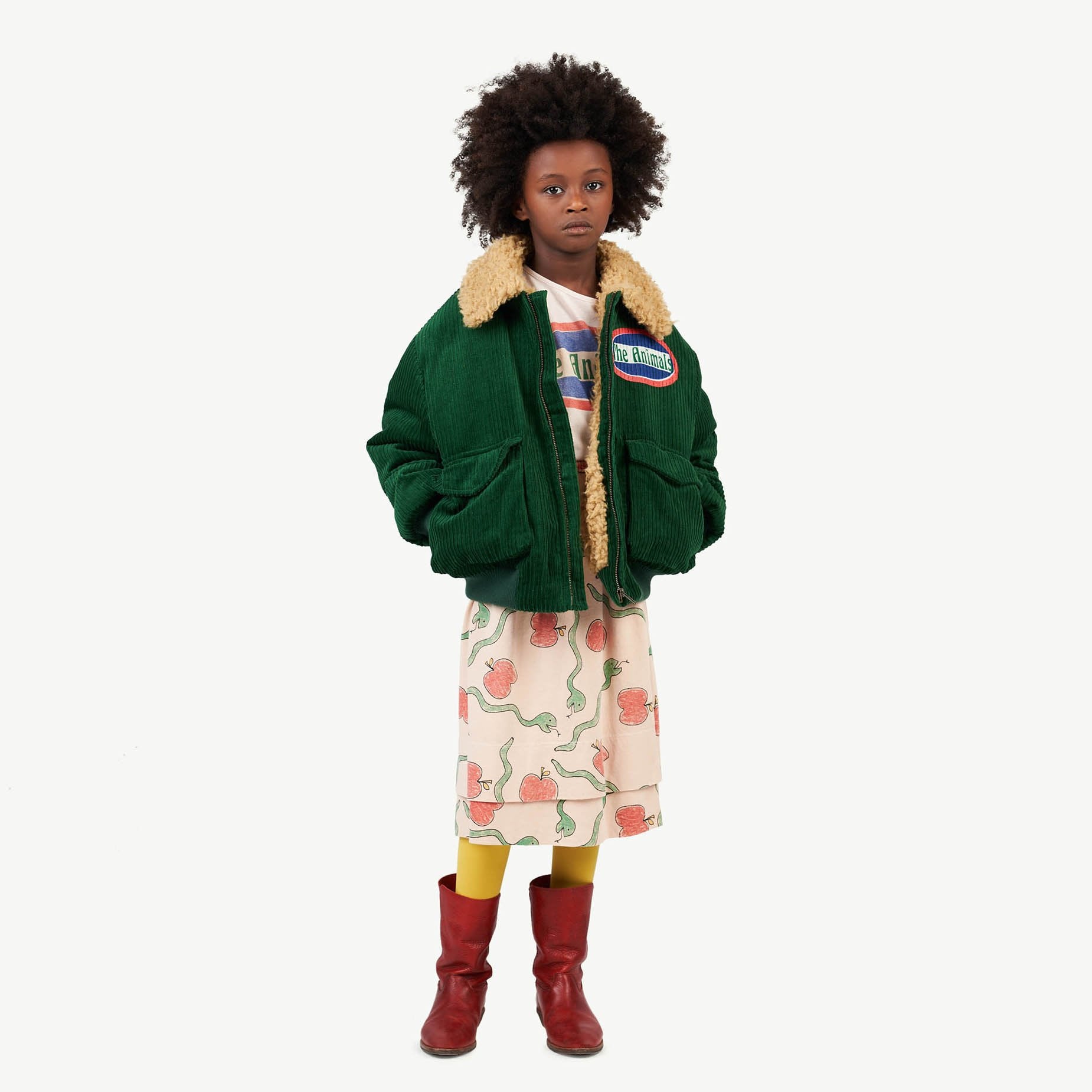 The Green Grass Tiger Jacket is a fresh take on the classic bomber coat with soft, faux shearling wool collar, large front pockets, and The Animals Observatory embellishment at the upper left chest. Front zipper closure, ribbed cuffs. 90% cotton, 10% polyamide with 100% polyester fleece.