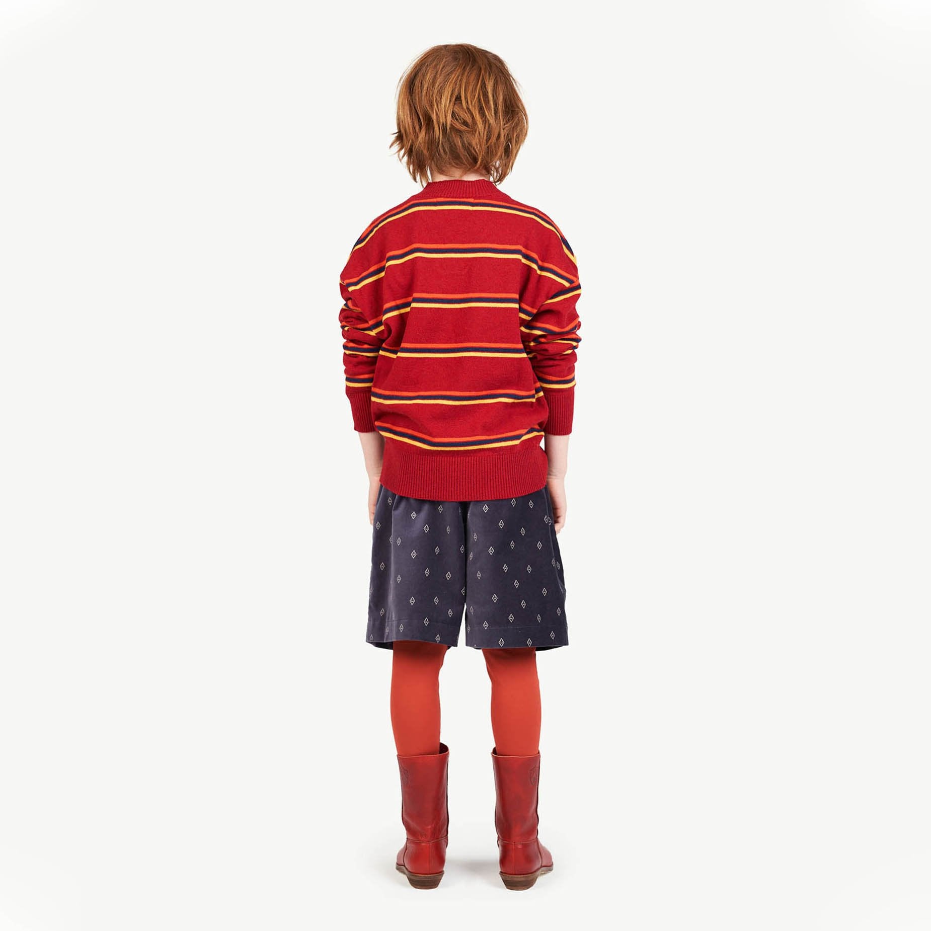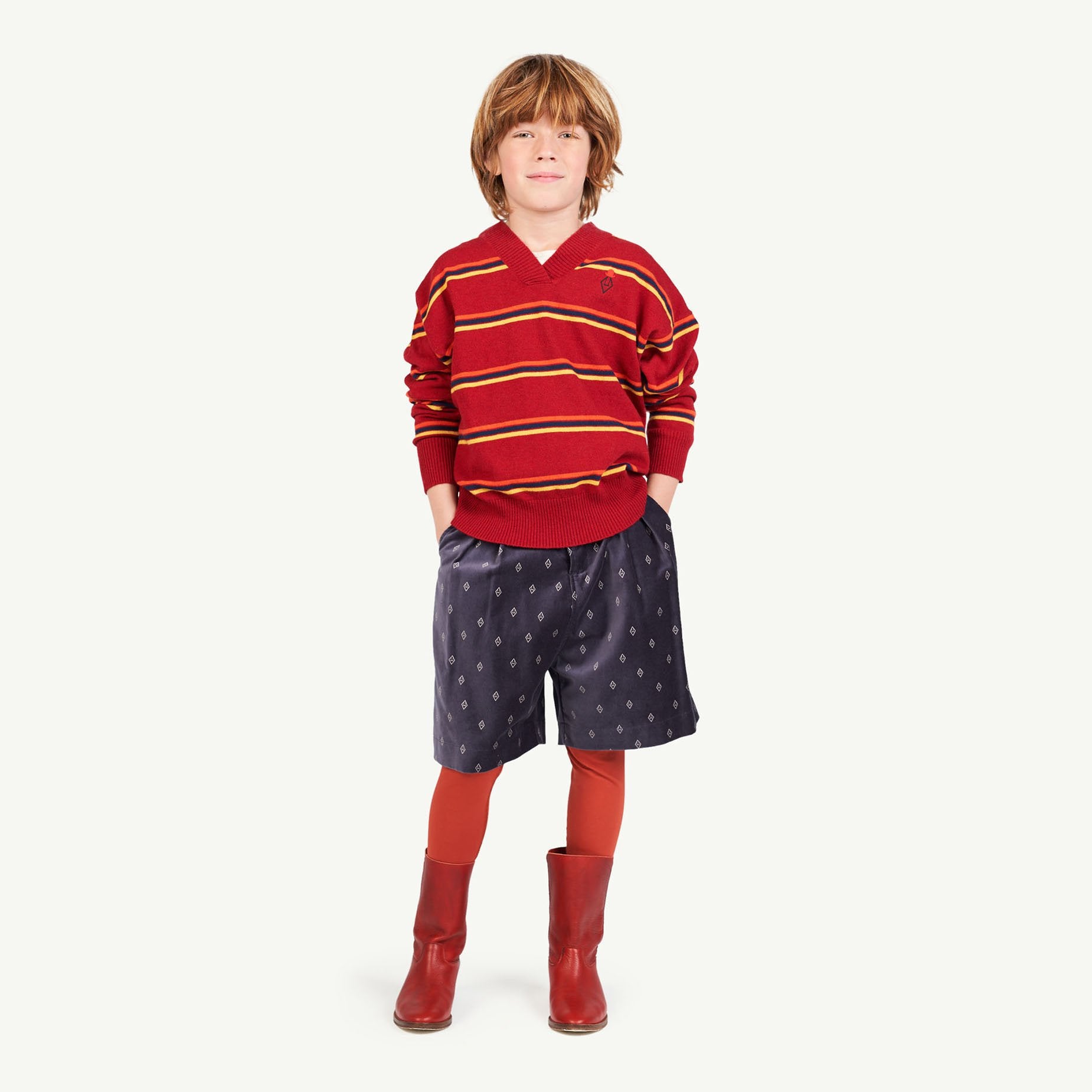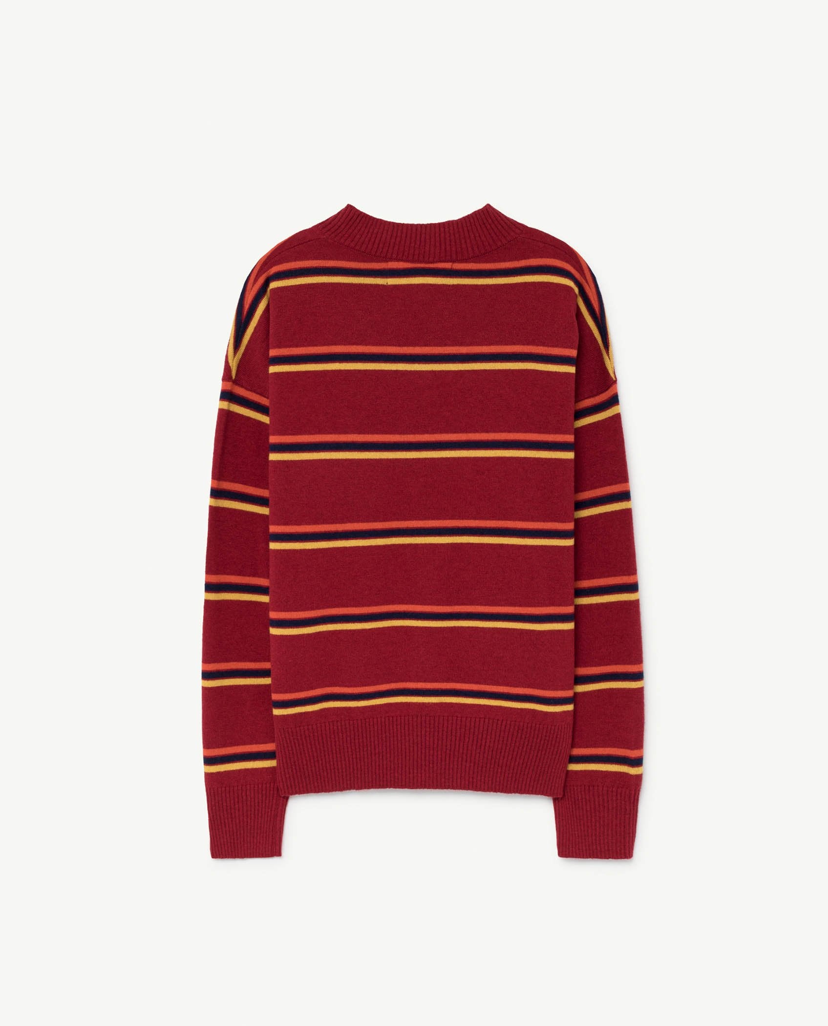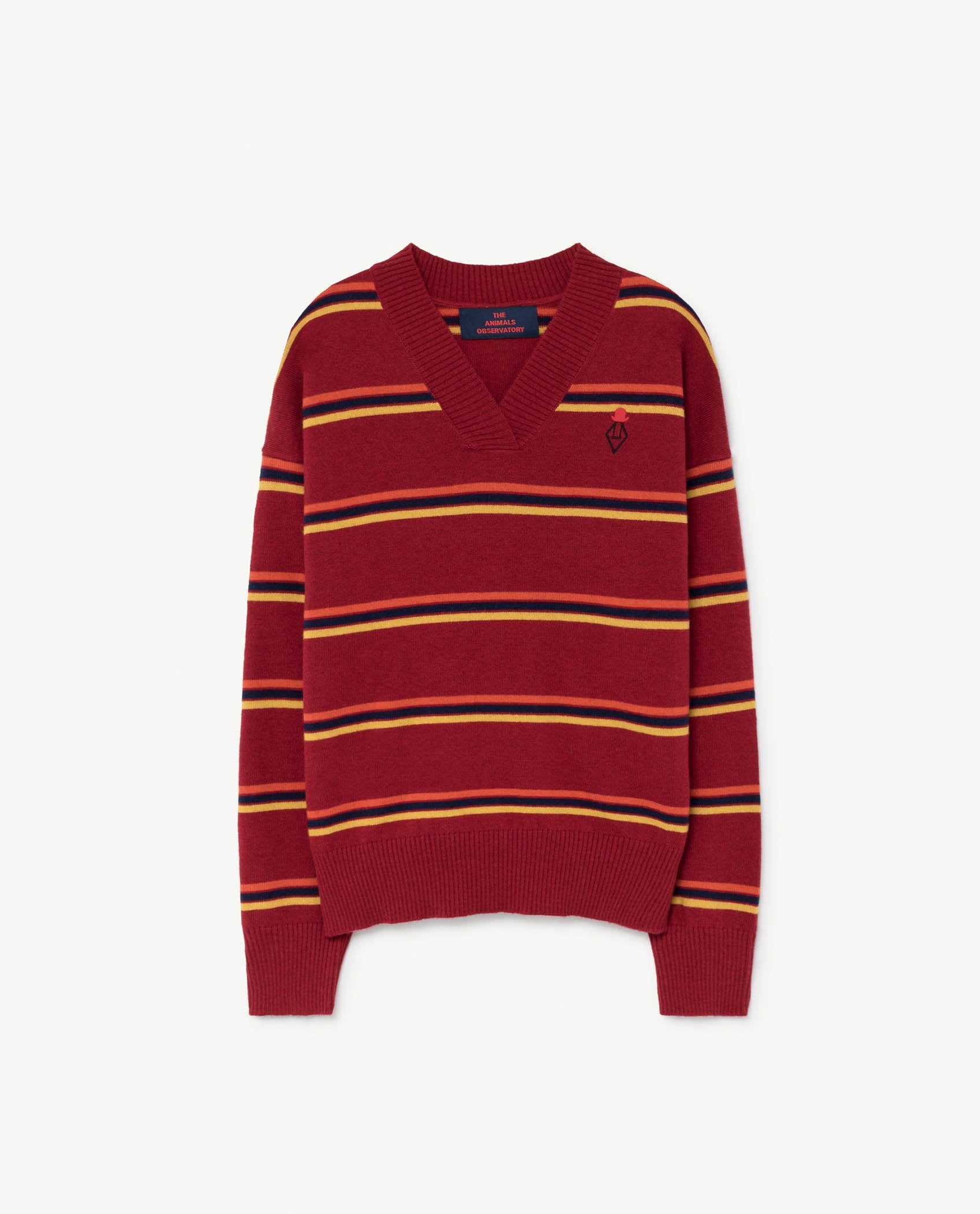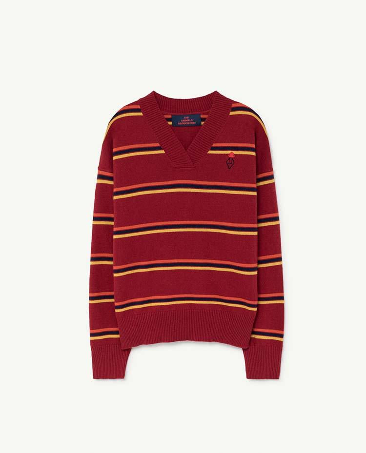The Maroon Toucan Sweater is a classic V-neck with retro horizontal stripes, ribbed collar and cuffs, and The Animals Observatory logo on upper chest. Perfect for school days and weekends alike. 30% wool, 30% viscose, 35% polyamide, 5% cashmere.