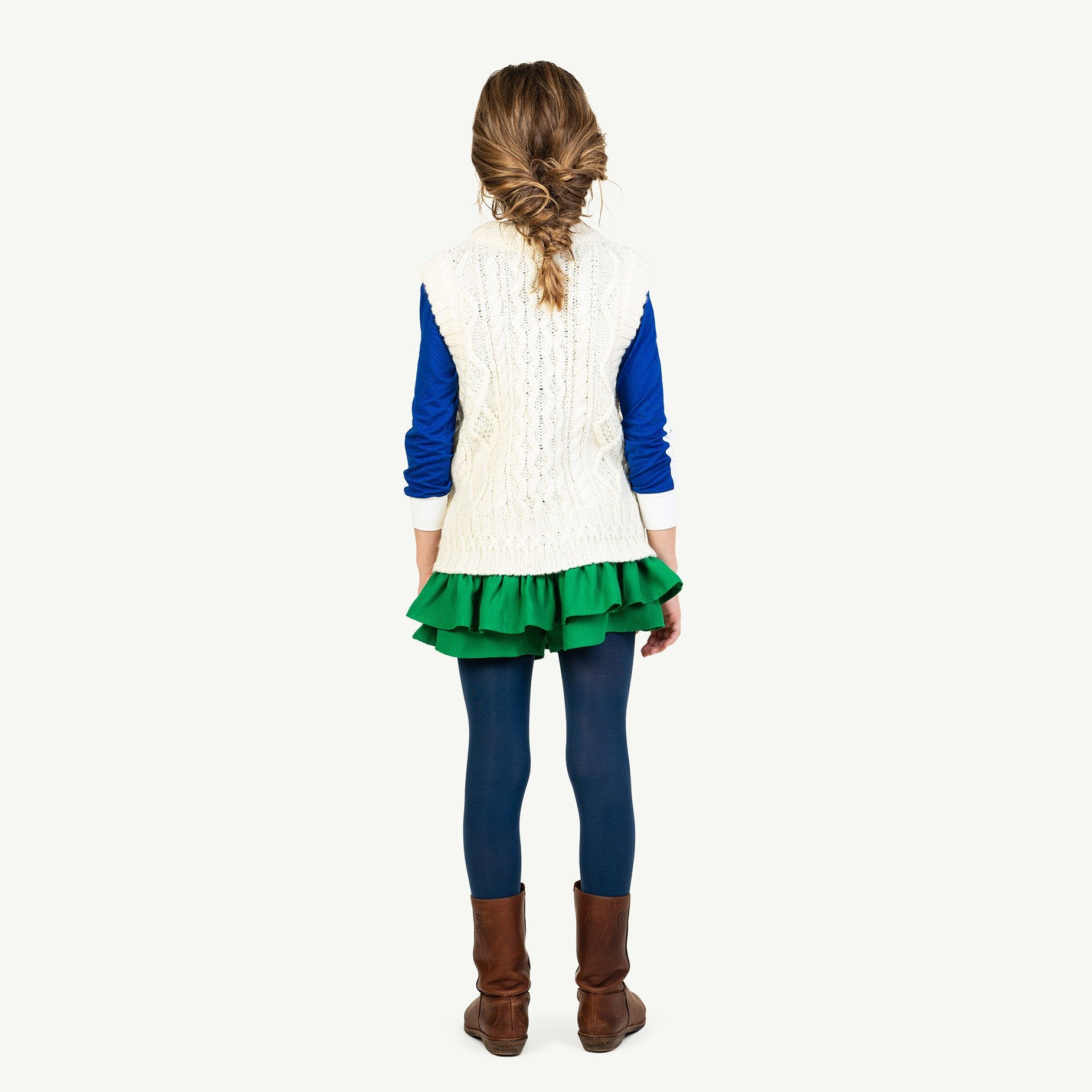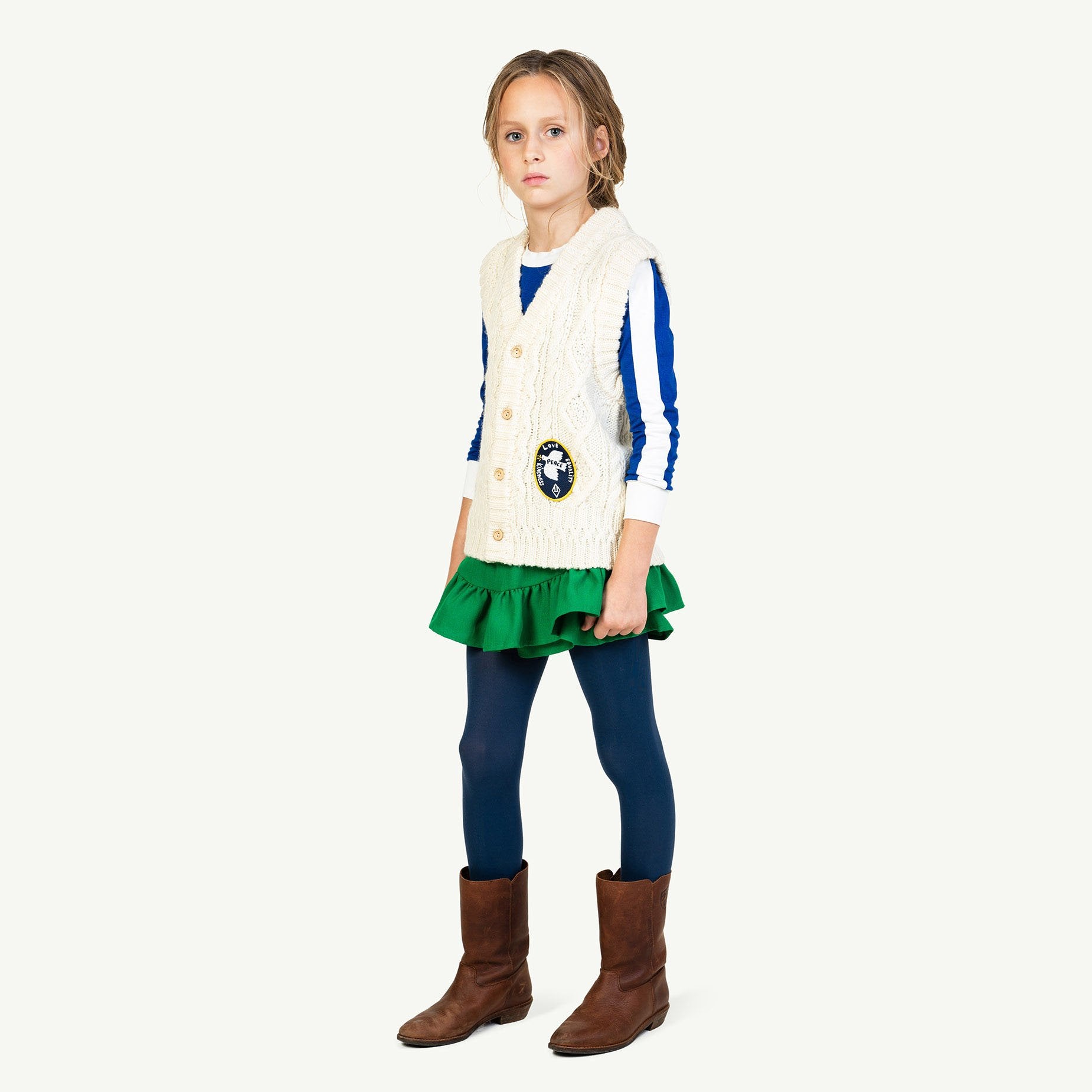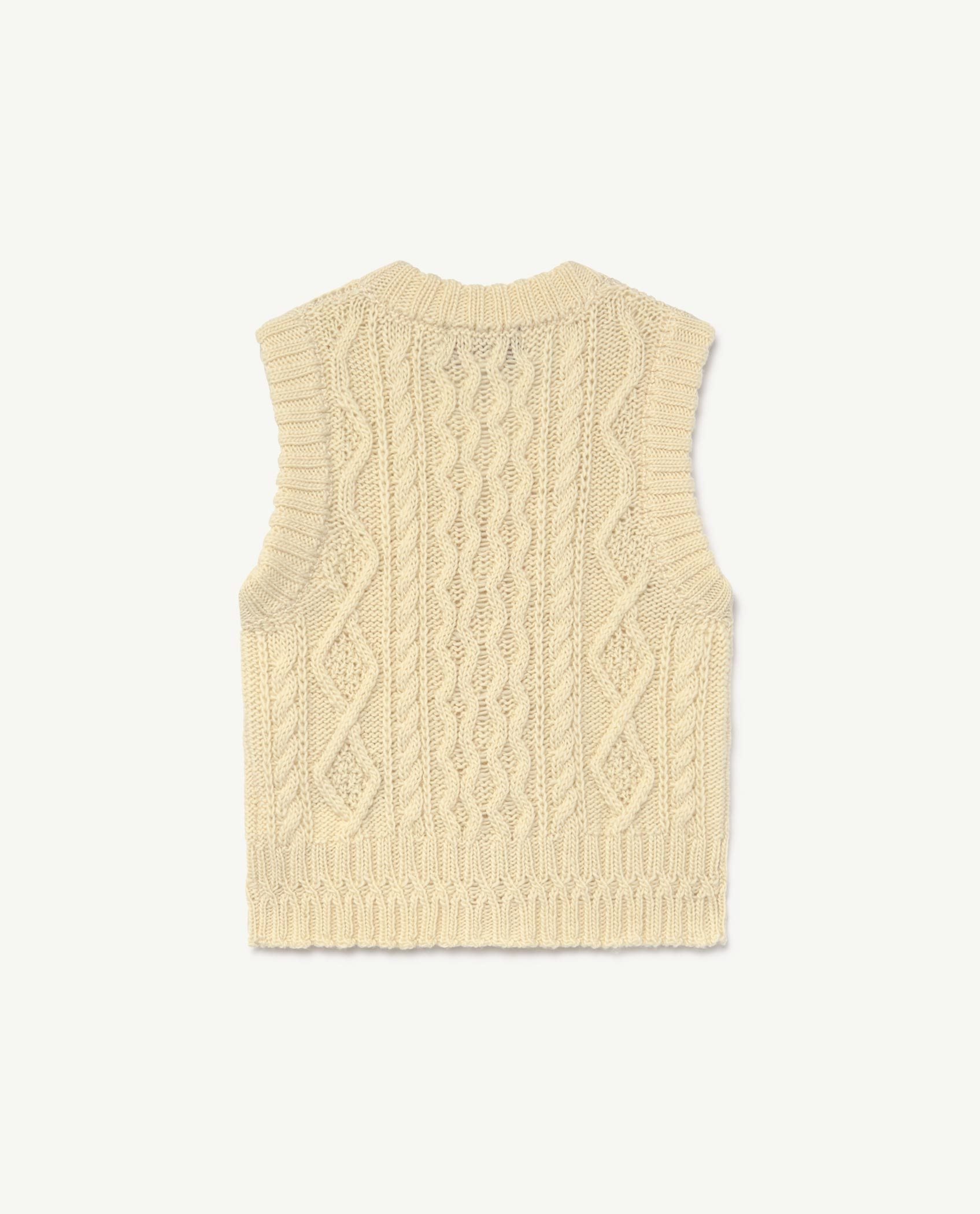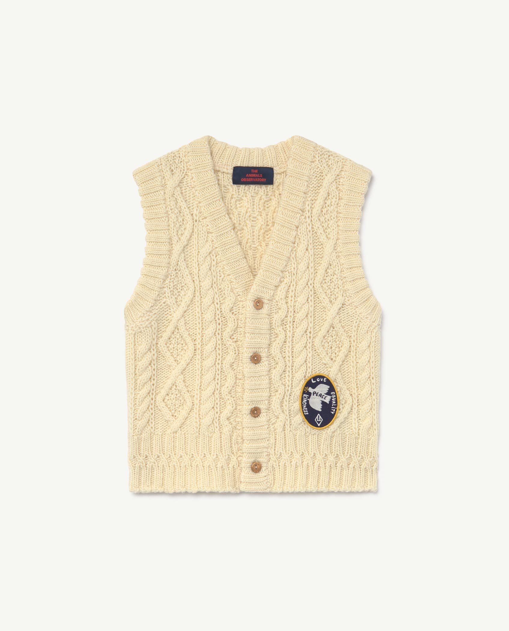 The Raw White Bat Vest is a classic cable knit waistcoat perfect for layering as tempertures drop. V-neck collar, front wooden button closure, and The Animals Observatory patch on the front.