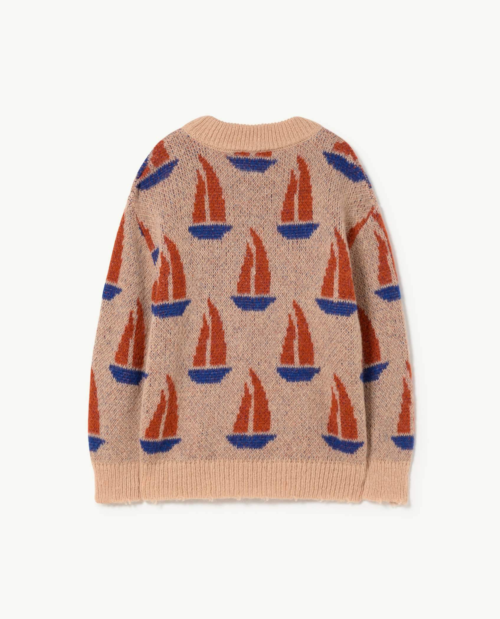 What a nice Beige Bull Sweater full of sailing ships ready to explore the ocean. It is tricot knitted, in a regular fit, with the softest yarn and therefore it is the most comfortable, warmest sweater. The model's height is 133 cm and is wearing size 8 years.