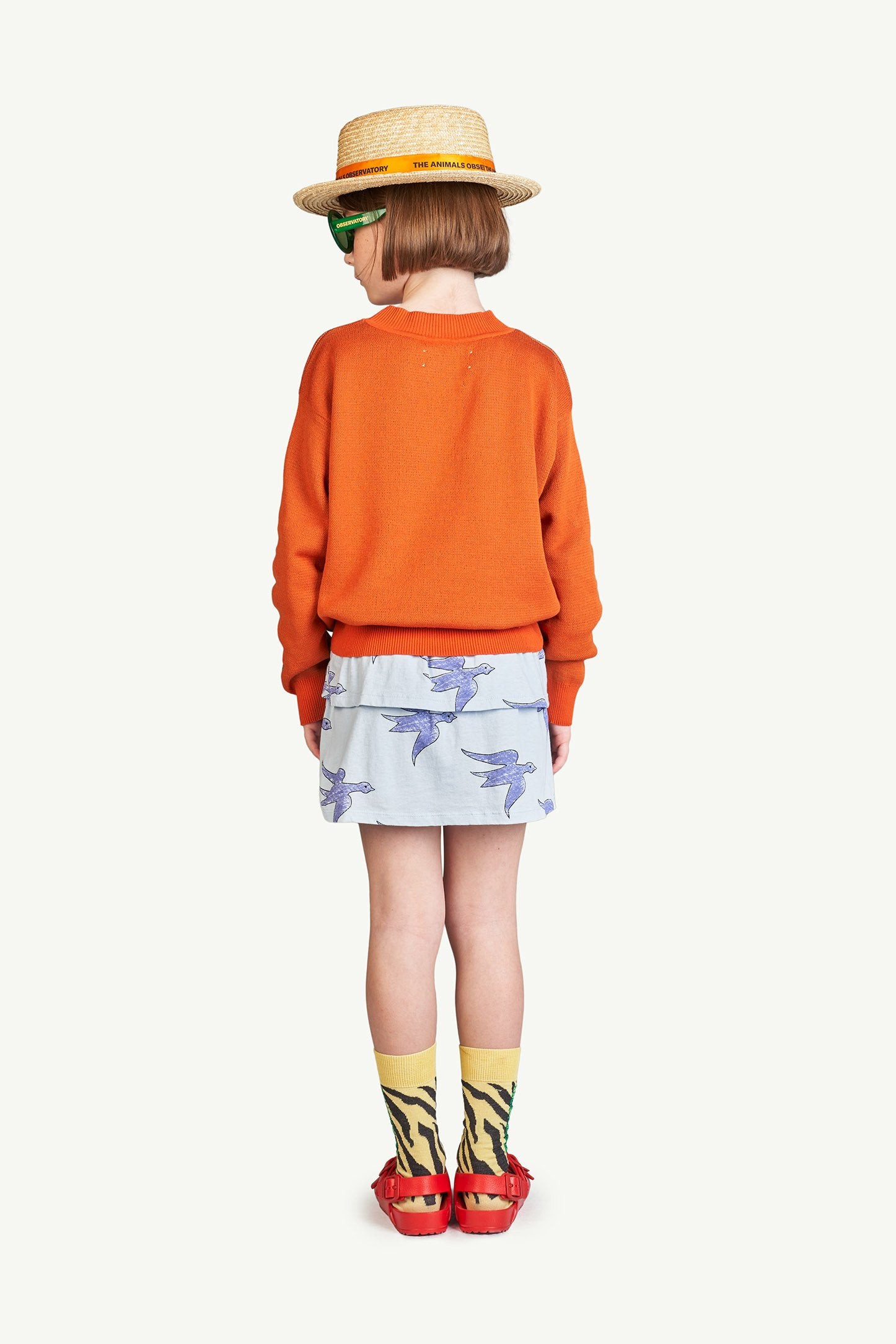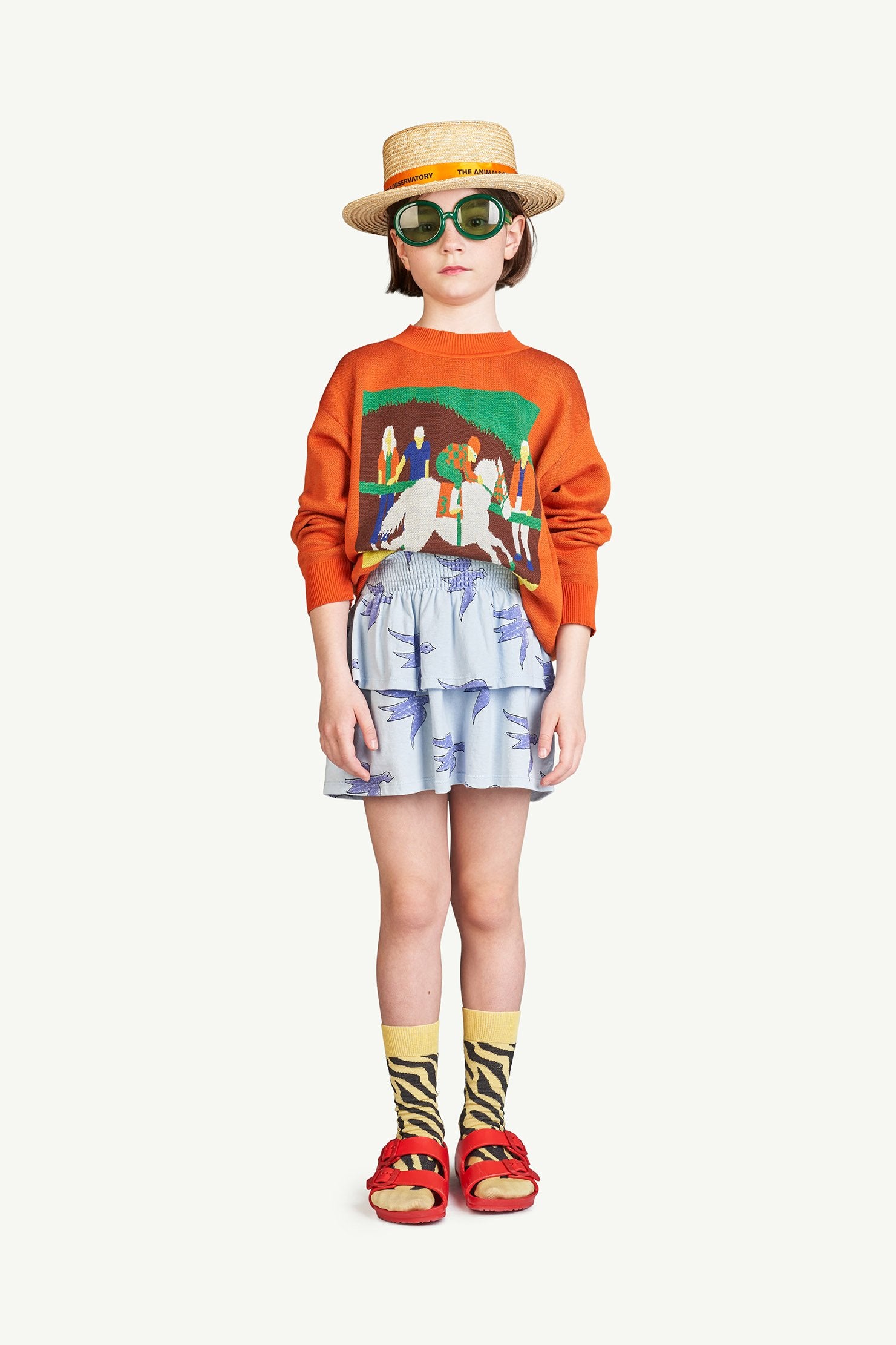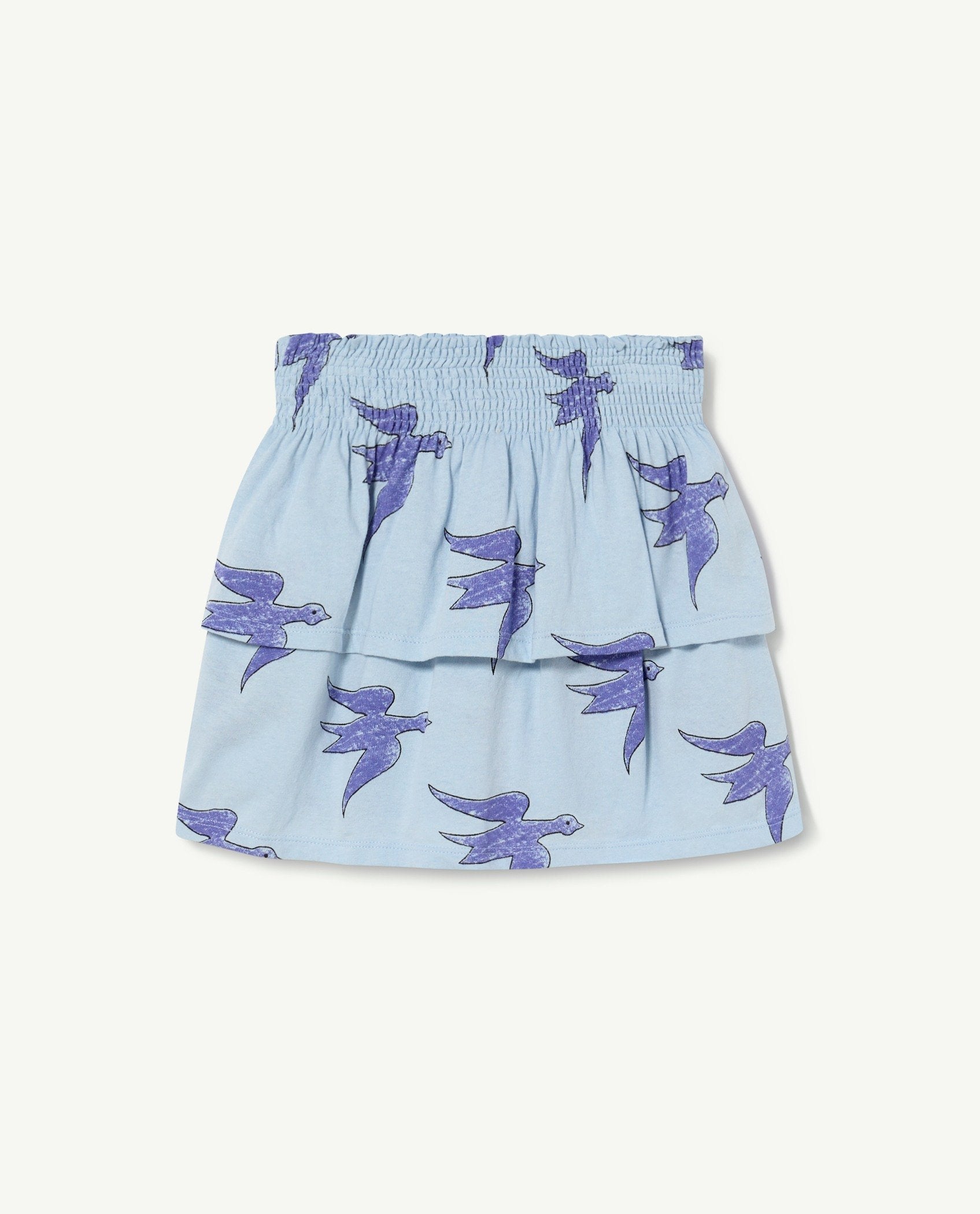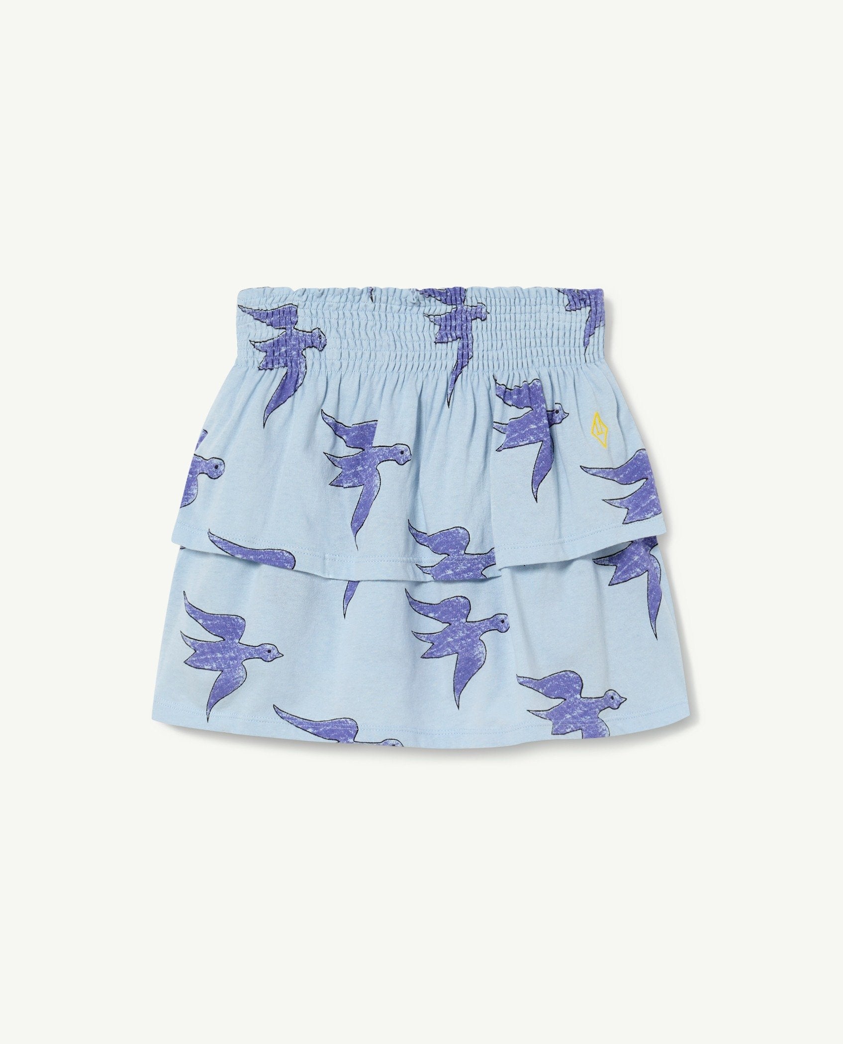The Blue Birds Kiwi Skirt is a ruffle short skirt with an elastic waist and featuring The Animals Observatory logo on the front side. The model's height is 130 cm and is wearing size 8 years.