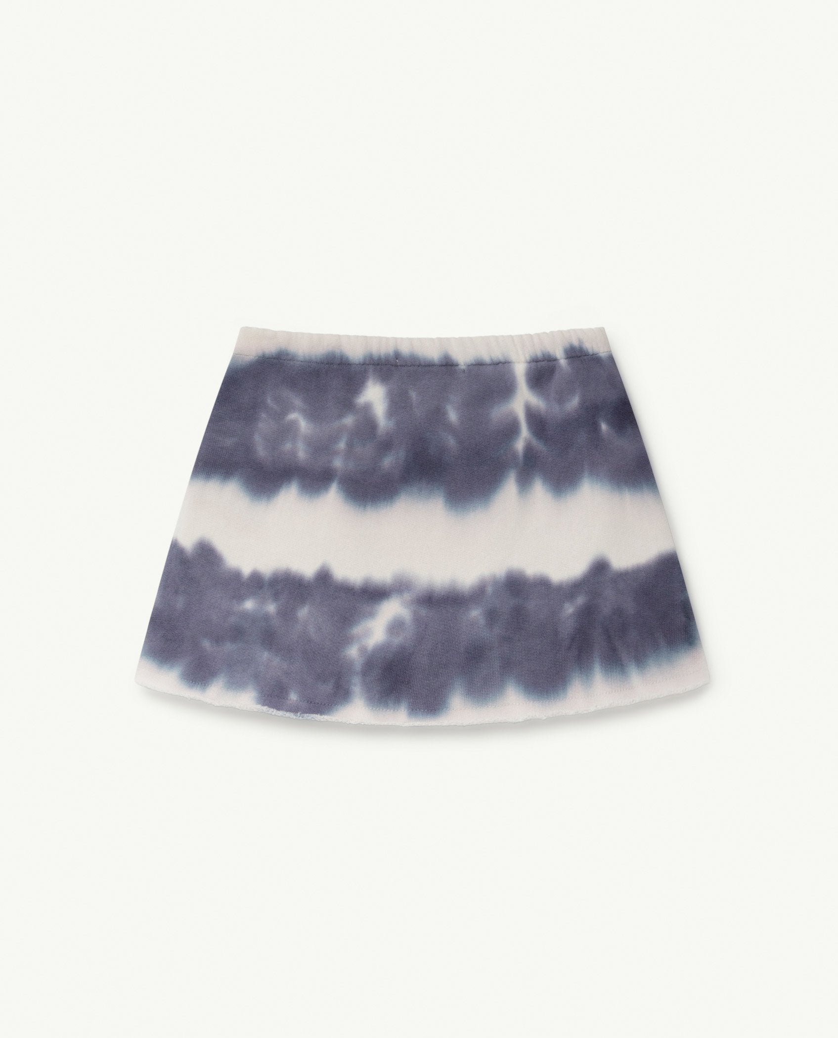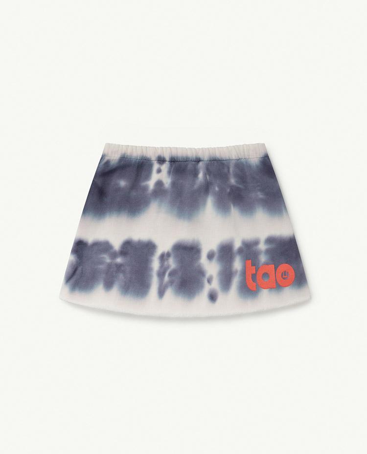 "This Blue Dove Skirt has a retro vibe, featuring a dreamy blue tie-dye pattern and the ""tao"" motif in red."