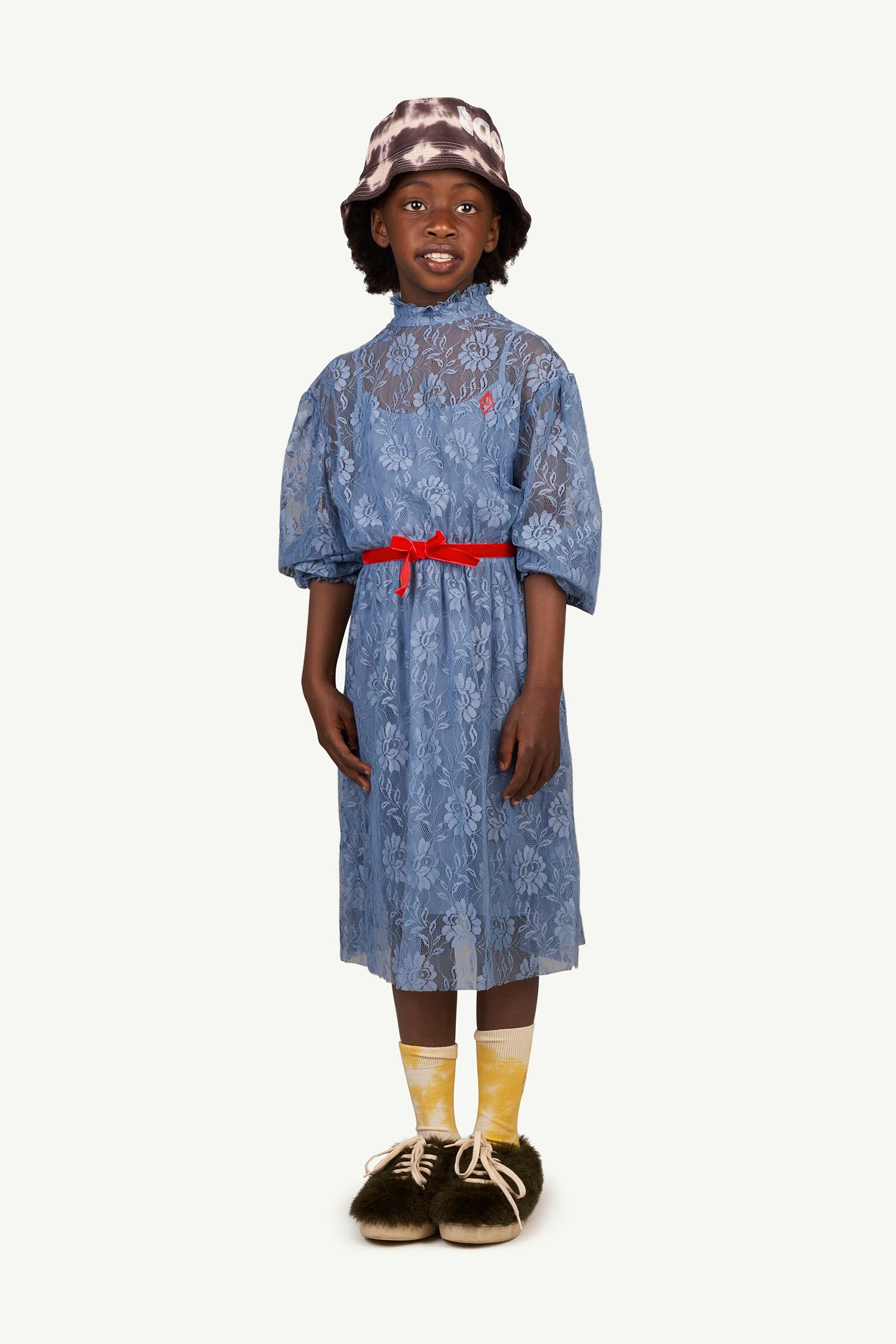 This Blue Logo Dolphin Dress in cotton and in soft blue has a high neck and a vintage feel, featuring a red ribbon at the waist and The Animals Observatory logo.