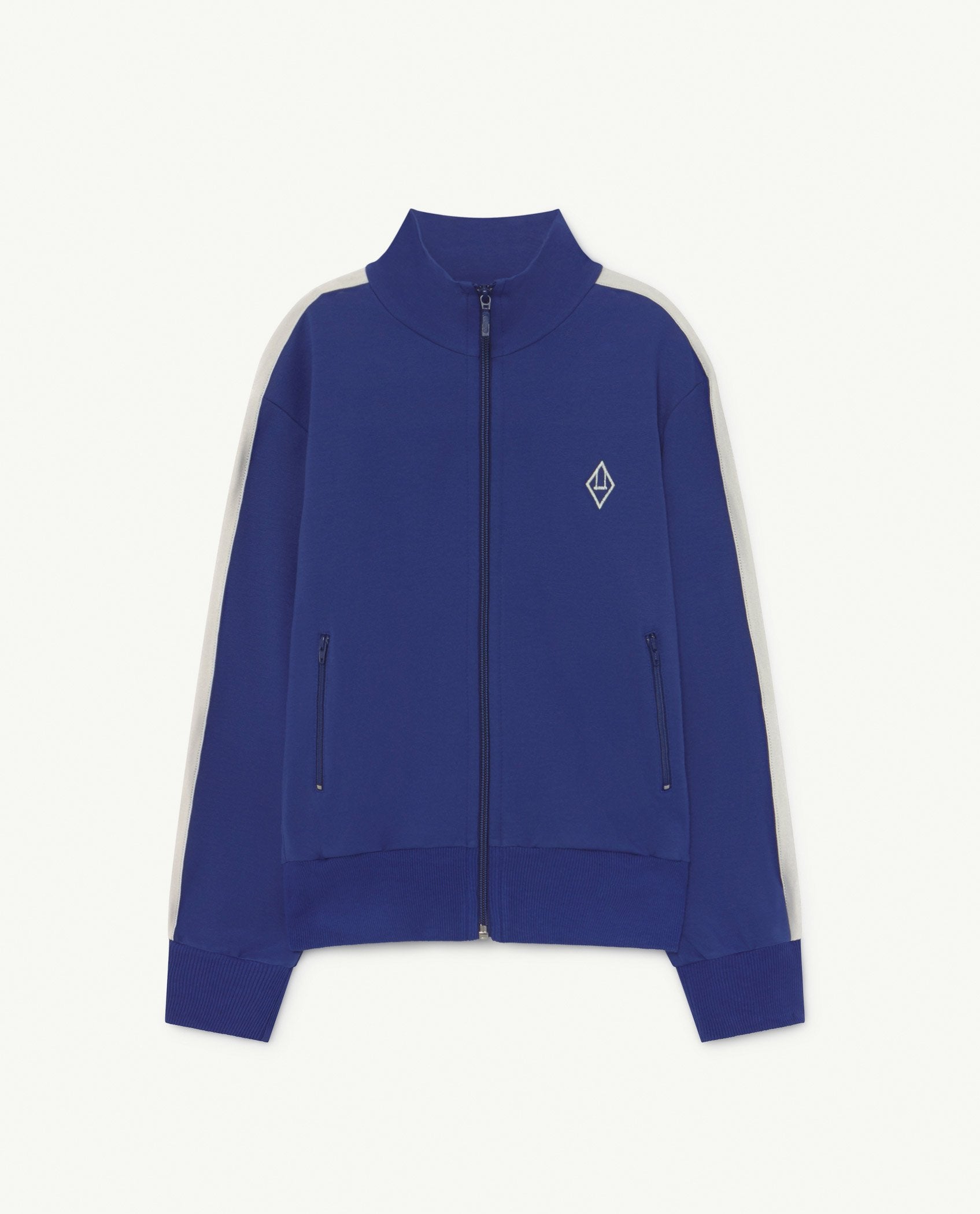 A no-nonsense zip-up jersey with a retro feel. In navy blue with a contrasting white trim. Age 14 size available.