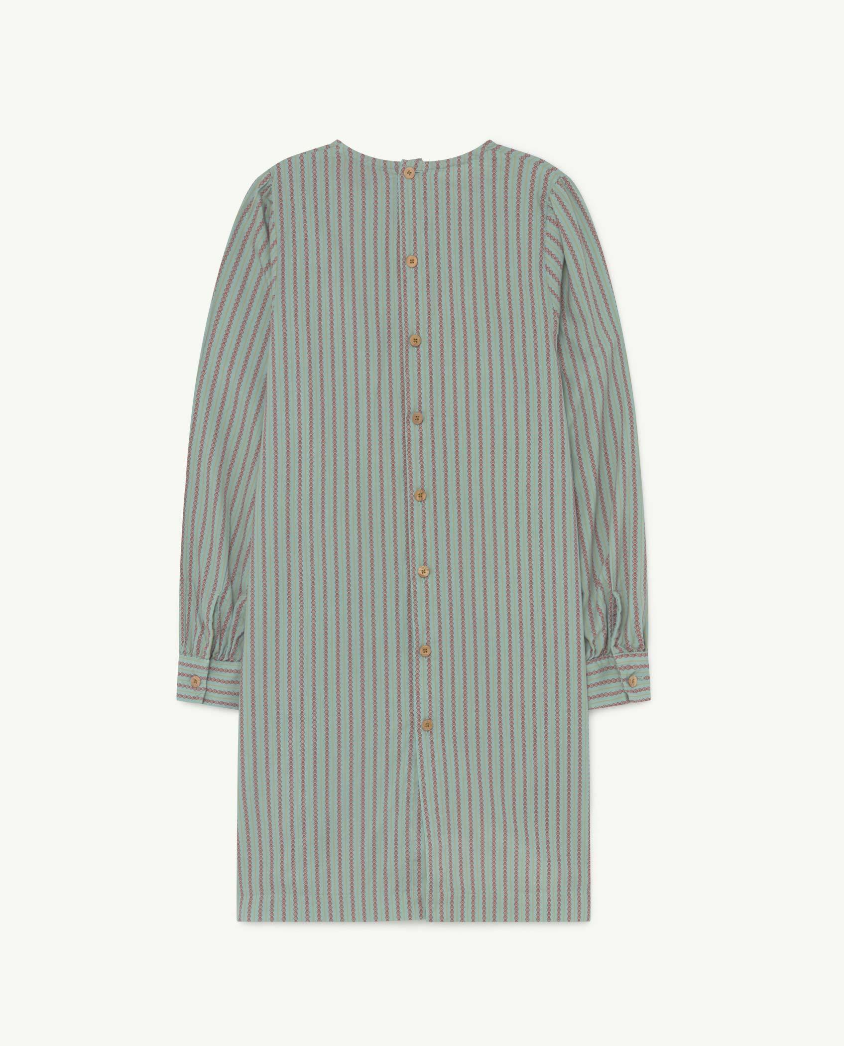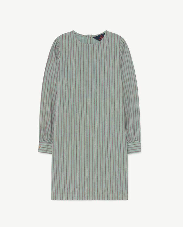 A long-sleeved dress with a rounded neck and long cuffed sleeves, in contrasting blue and red stripes. A stylish all-rounder.