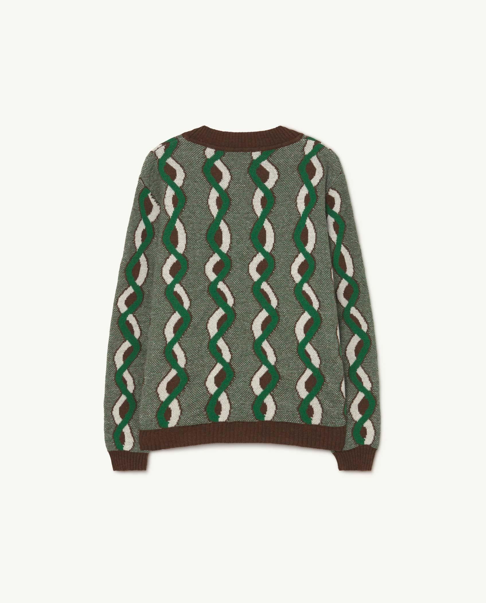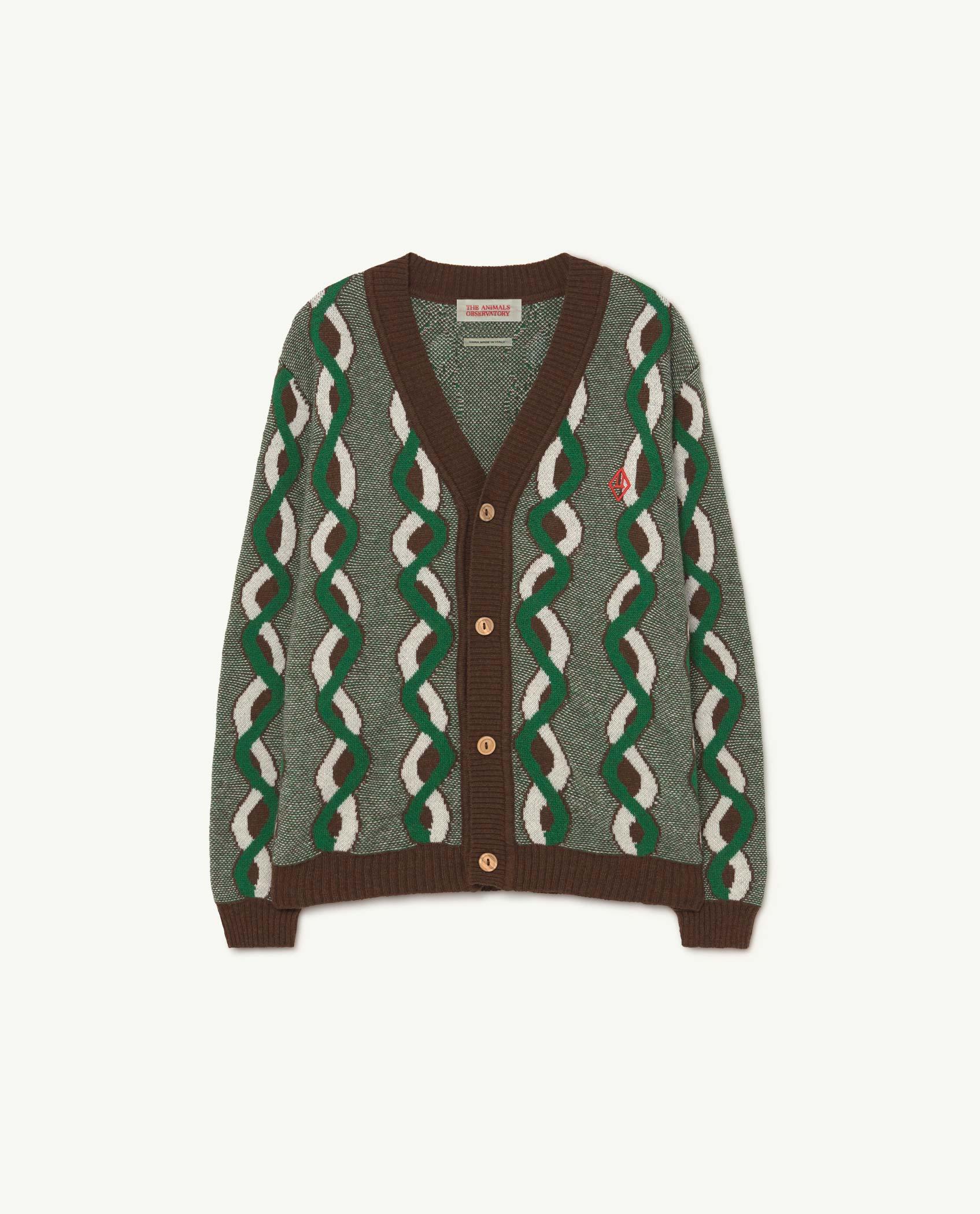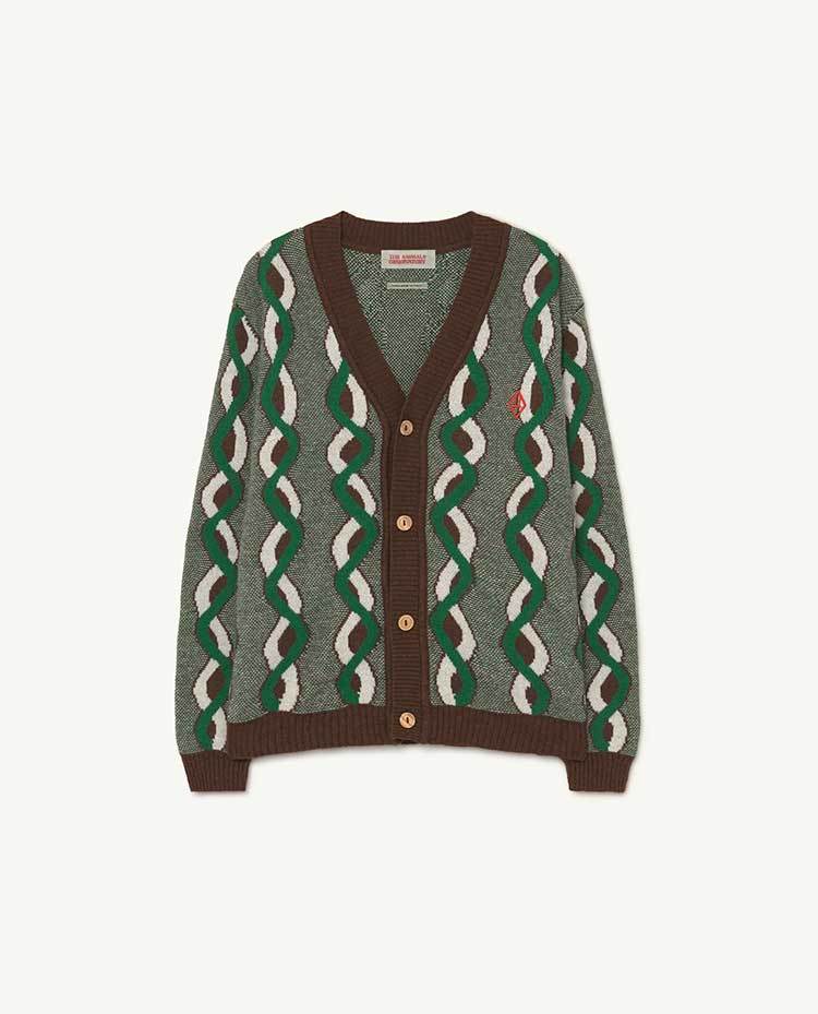The Brown Logo Braids Racoon Cardigan is a classic cardigan with a vintage feel, featuring a swirly pattern.