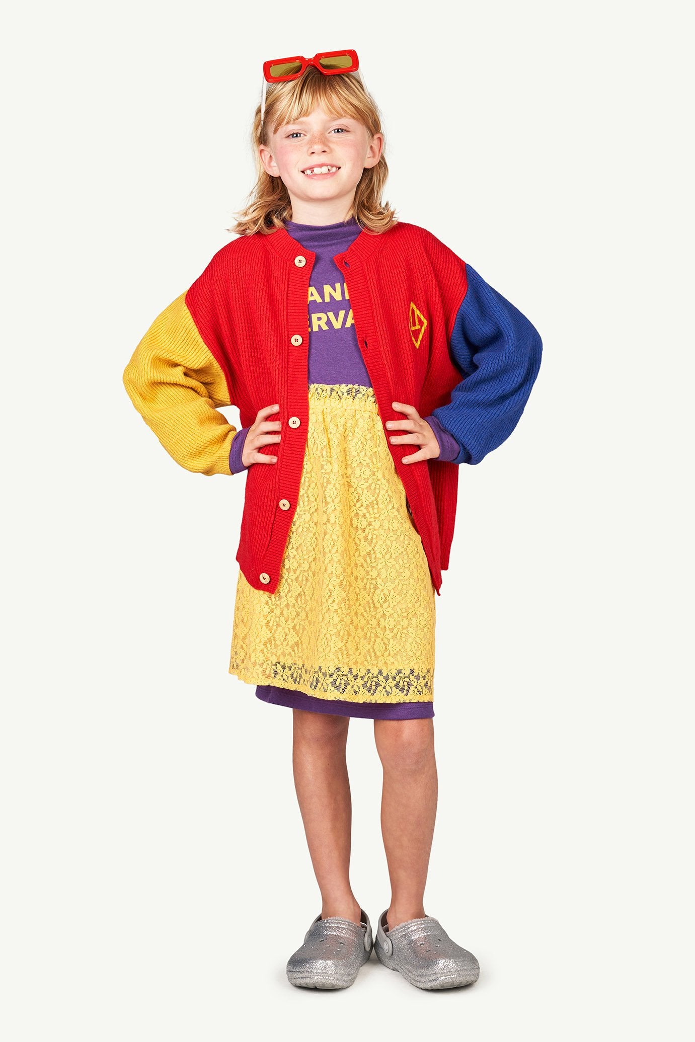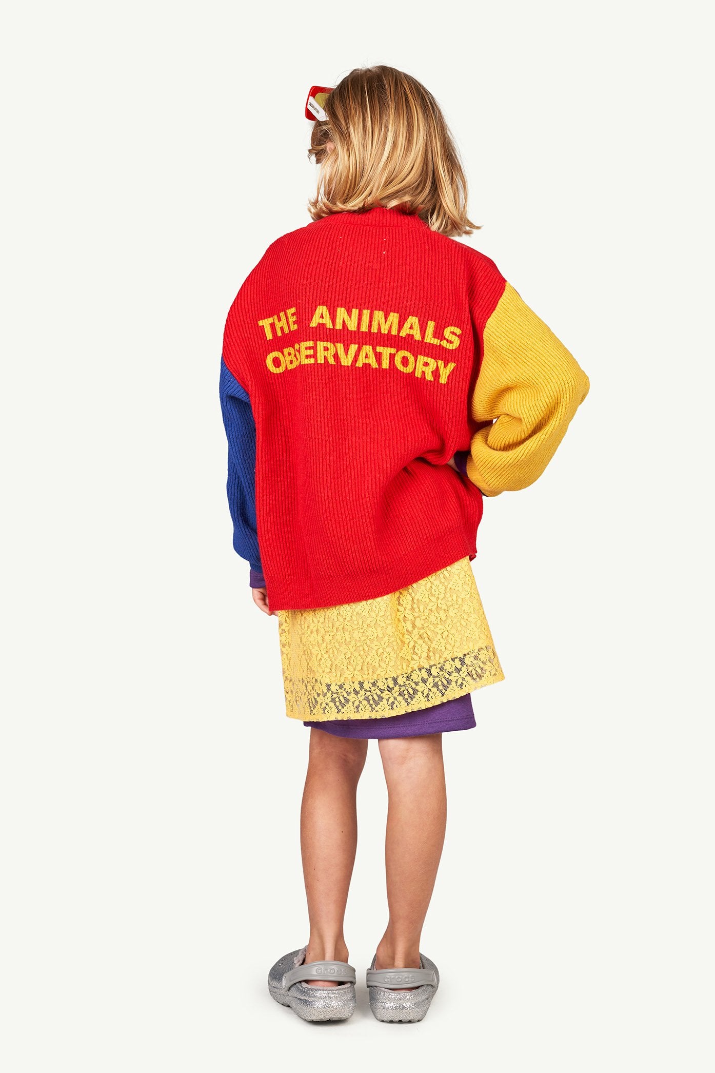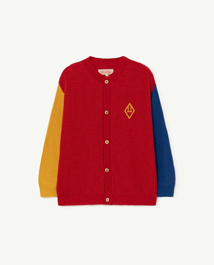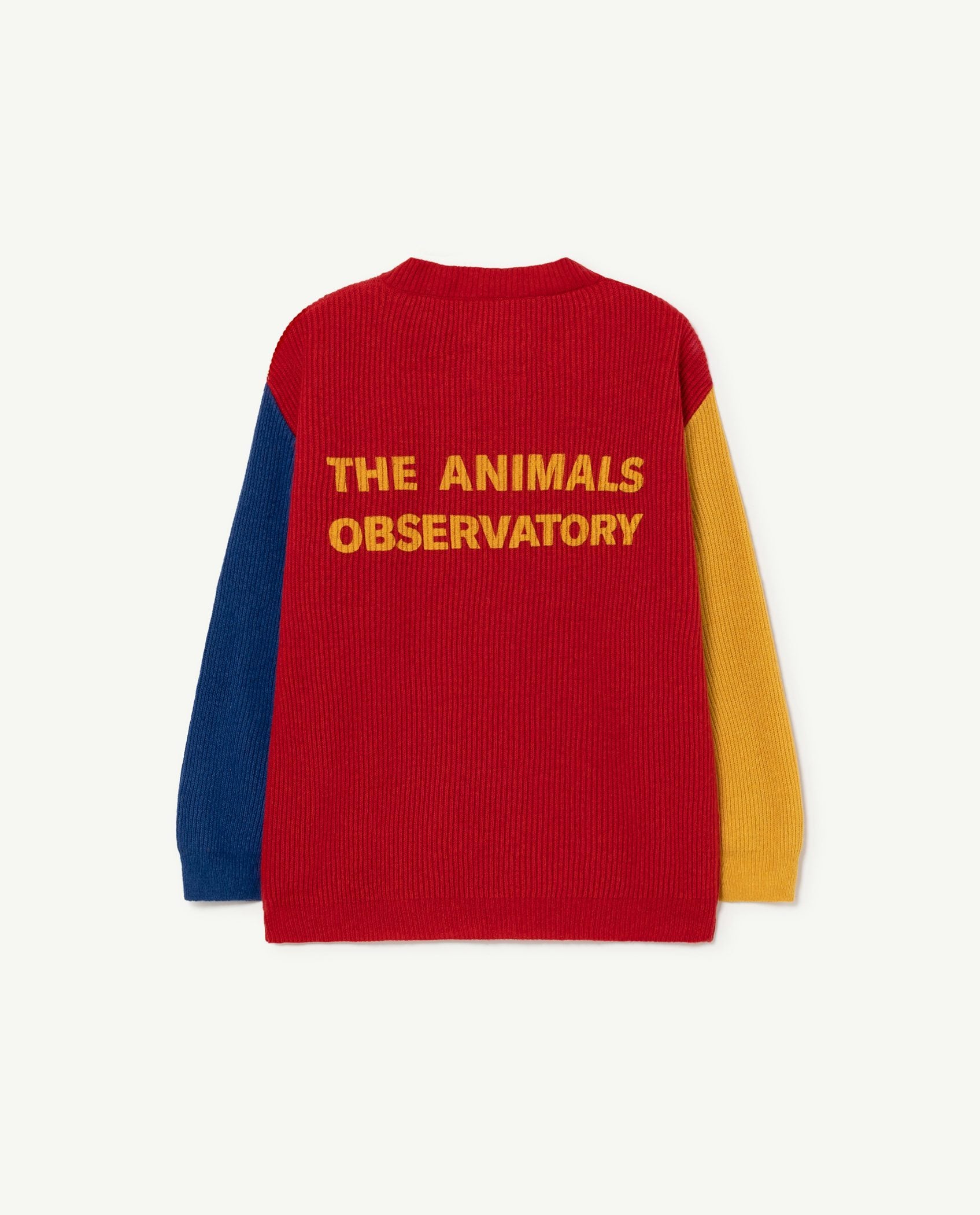 This tricolor Red Color Toucan regular fit Cardigan has a vintage feel that combines red, yellow and blue. With a the Breakfast club late '80s feel, it is the perfect piece to have in the wardrobe. The Animals Observatory red capital letters are on the back and a small logo is on the front. The model's height is 126 cm and is wearing size 8 years.