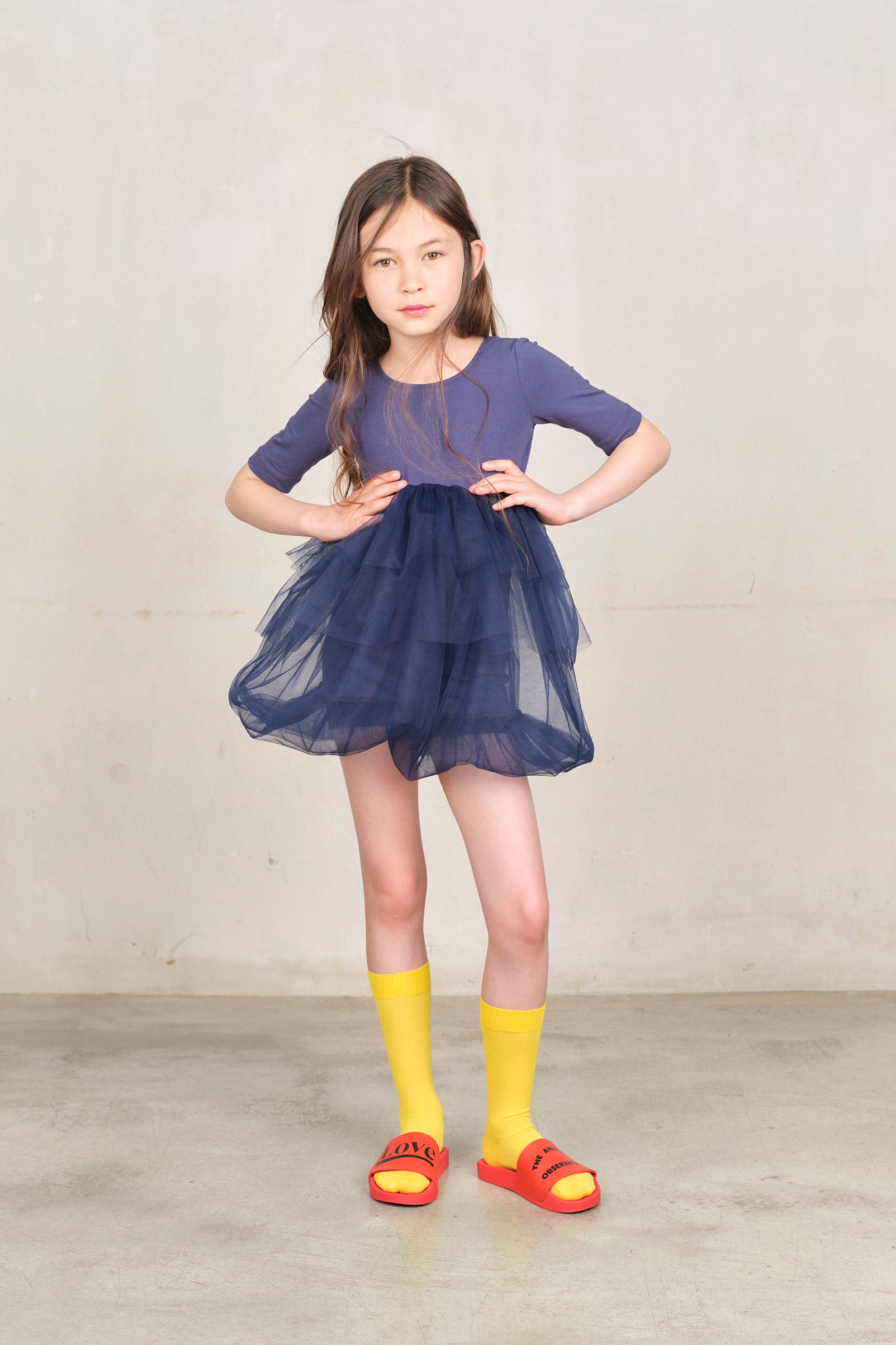 Fancy dress with tulle ruffle details. Elegant and playful, ideal for special occasions.