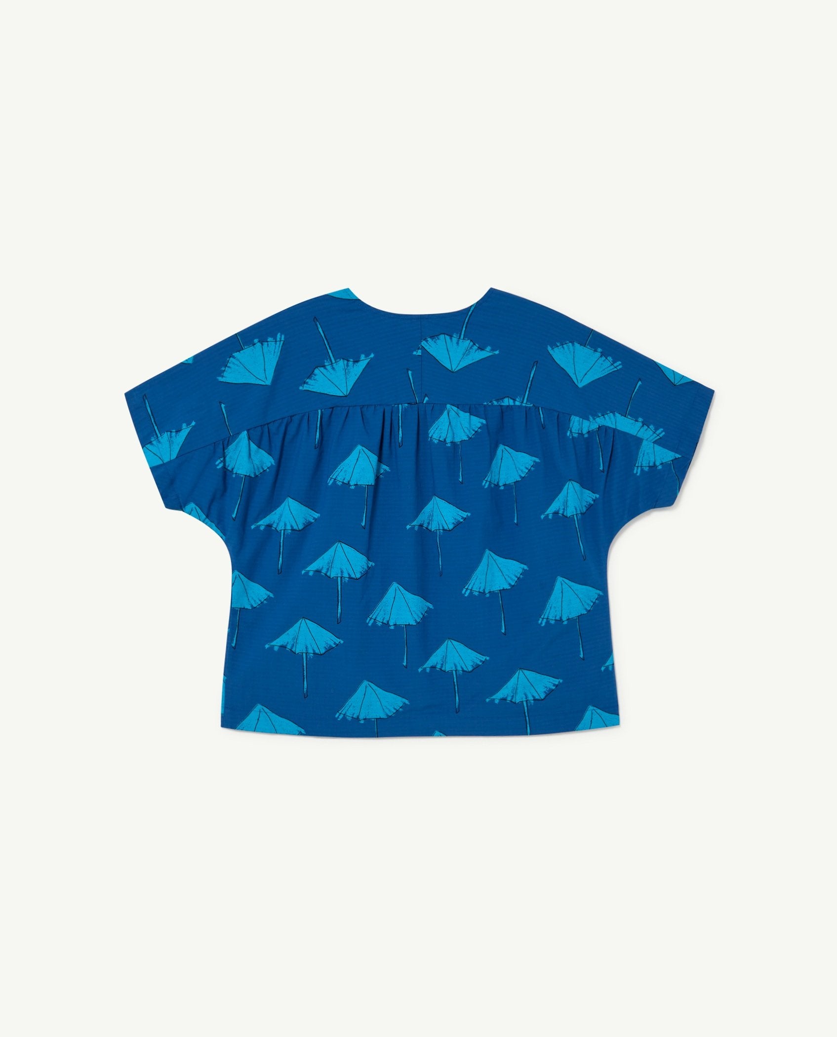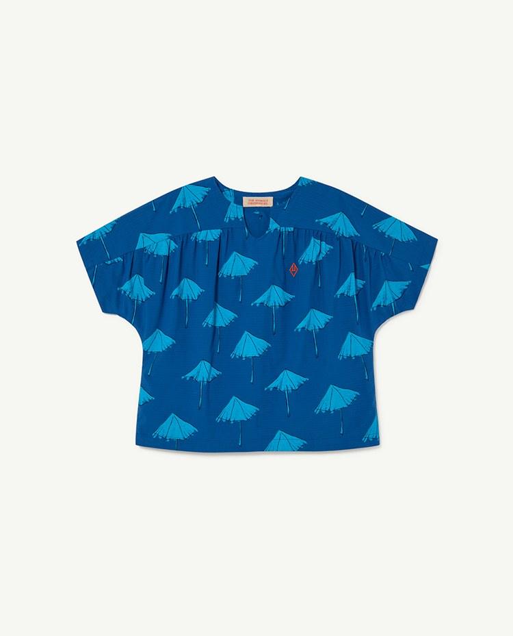 The Deep Blue Umbrellas Lamb Shirt is a soft-to-skin oversize shirt inspired by a day in the ocean. With an oversize fit and an open neck. The model's height is 130 cm and is wearing size 8 years.
