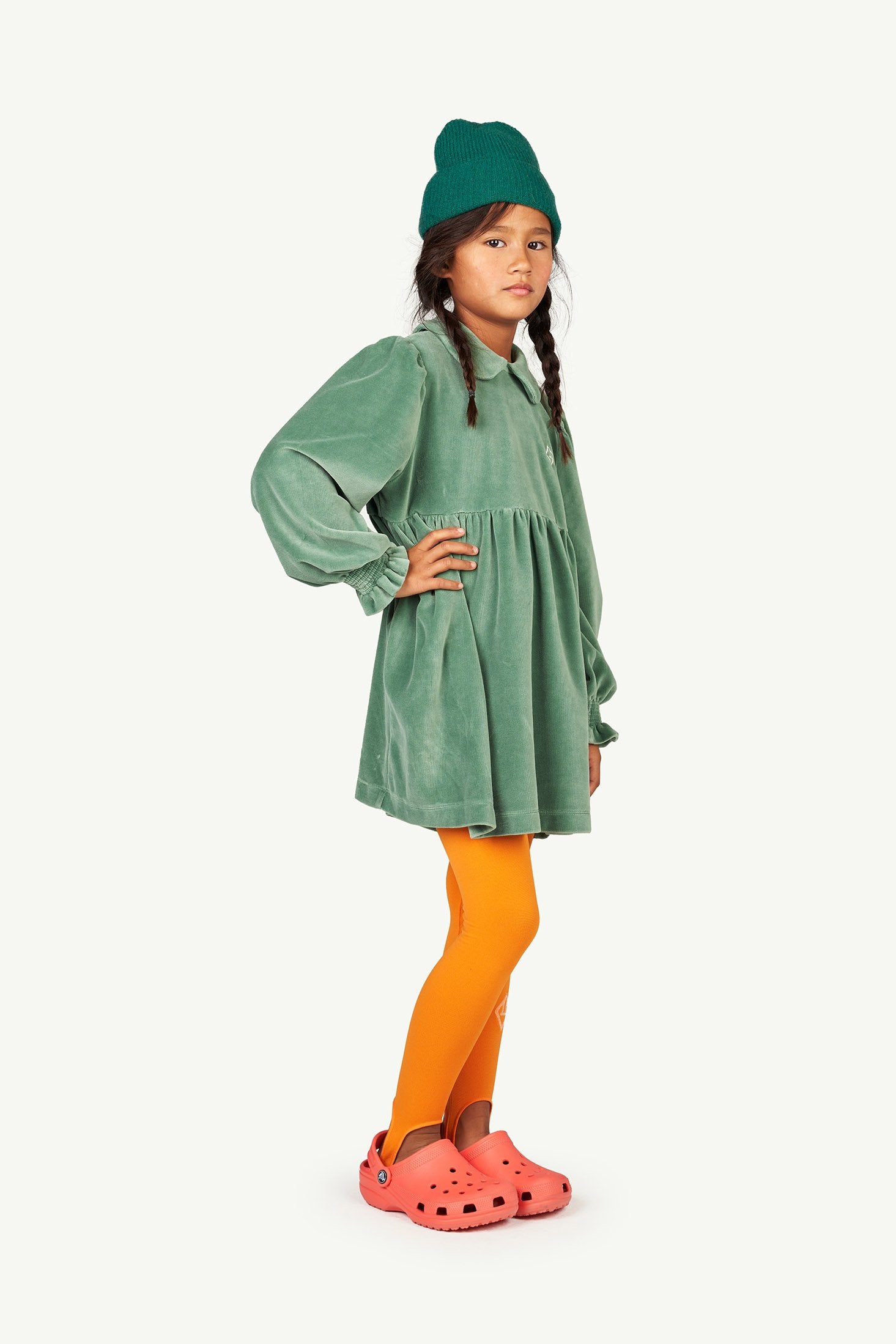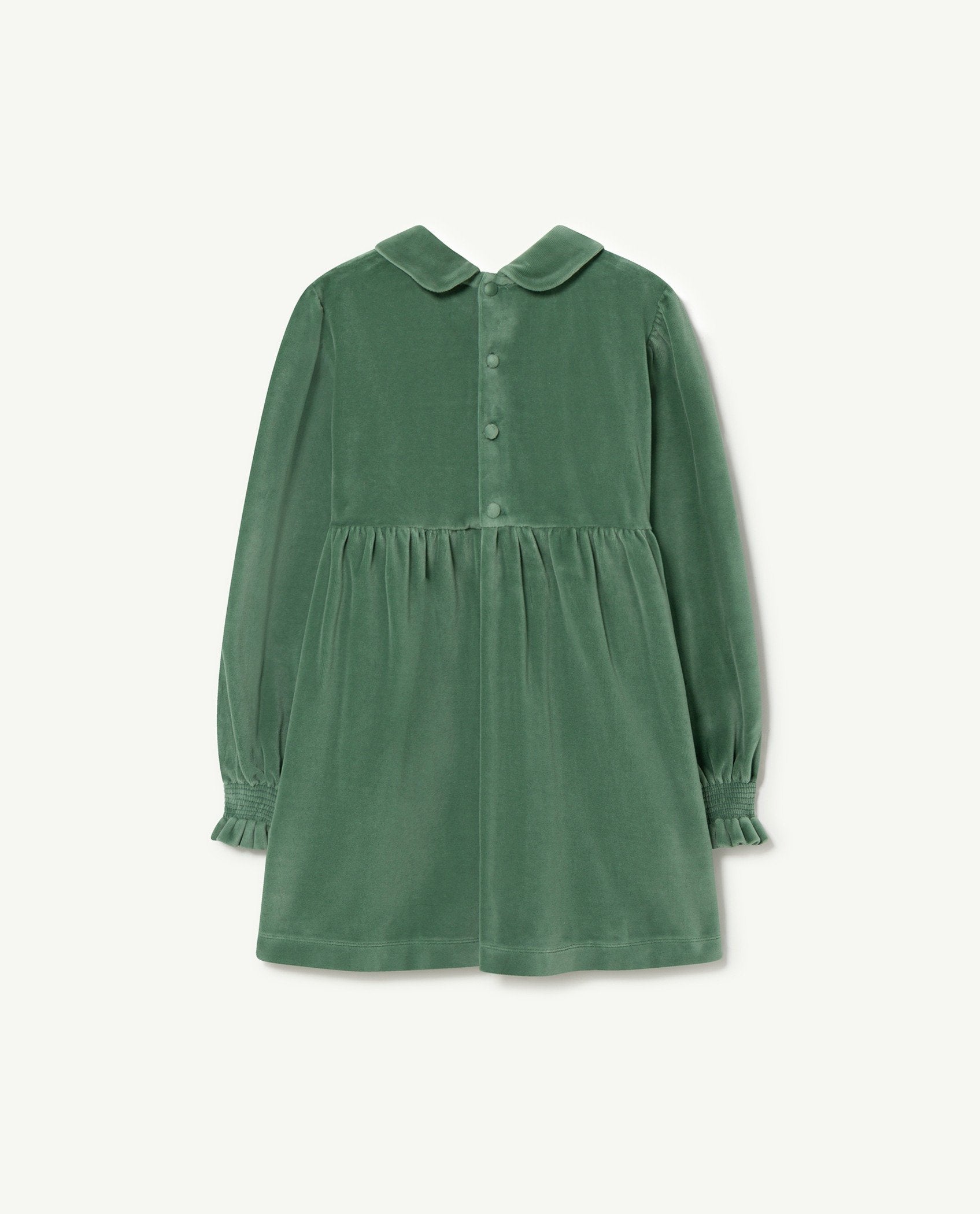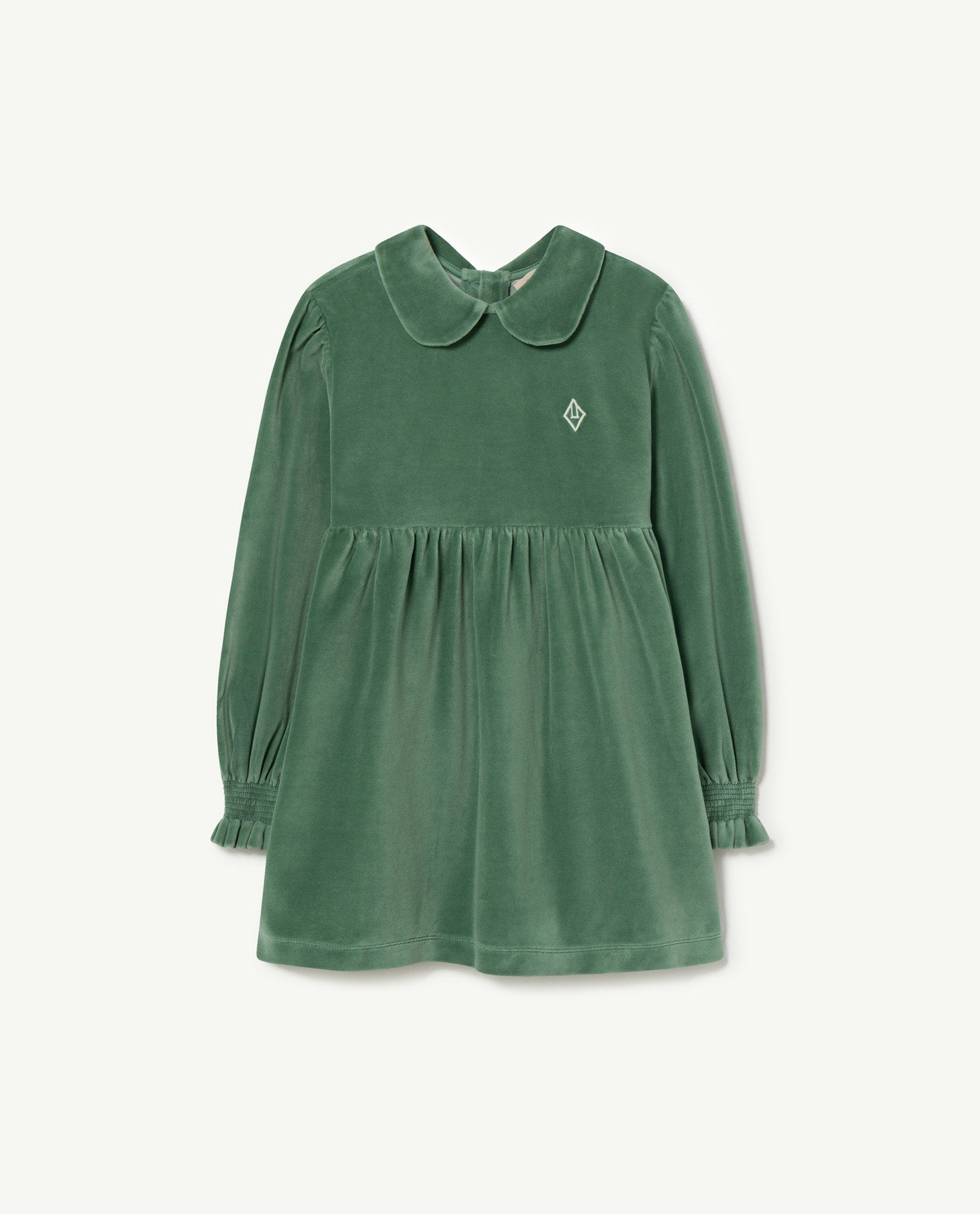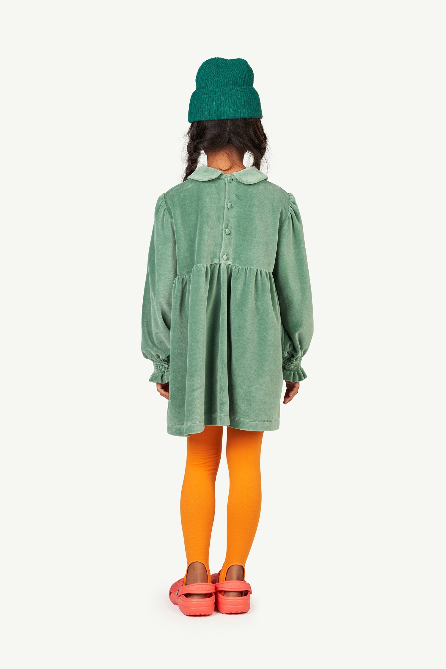 This house inspired Green Mouse Kids relaxed fit Dress, it's a mix of cotton and polyester made and has an all over classical house dress style. With The Animals Observatory logo on the upper-right front and a Peter Pan collar. It buttons up in the back. Only available in our online store. The model's height is 134 cm and is wearing size 8 years.