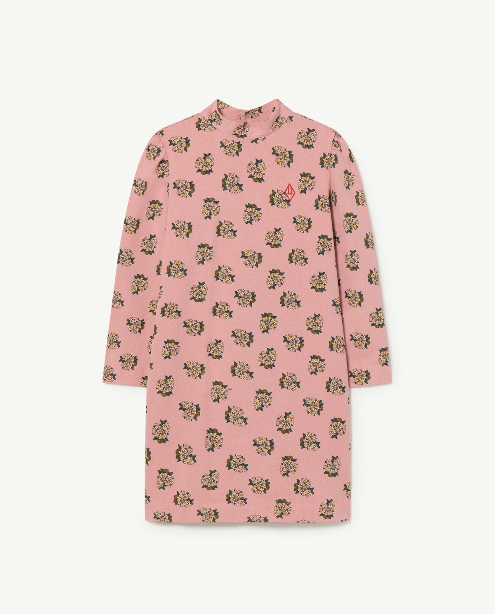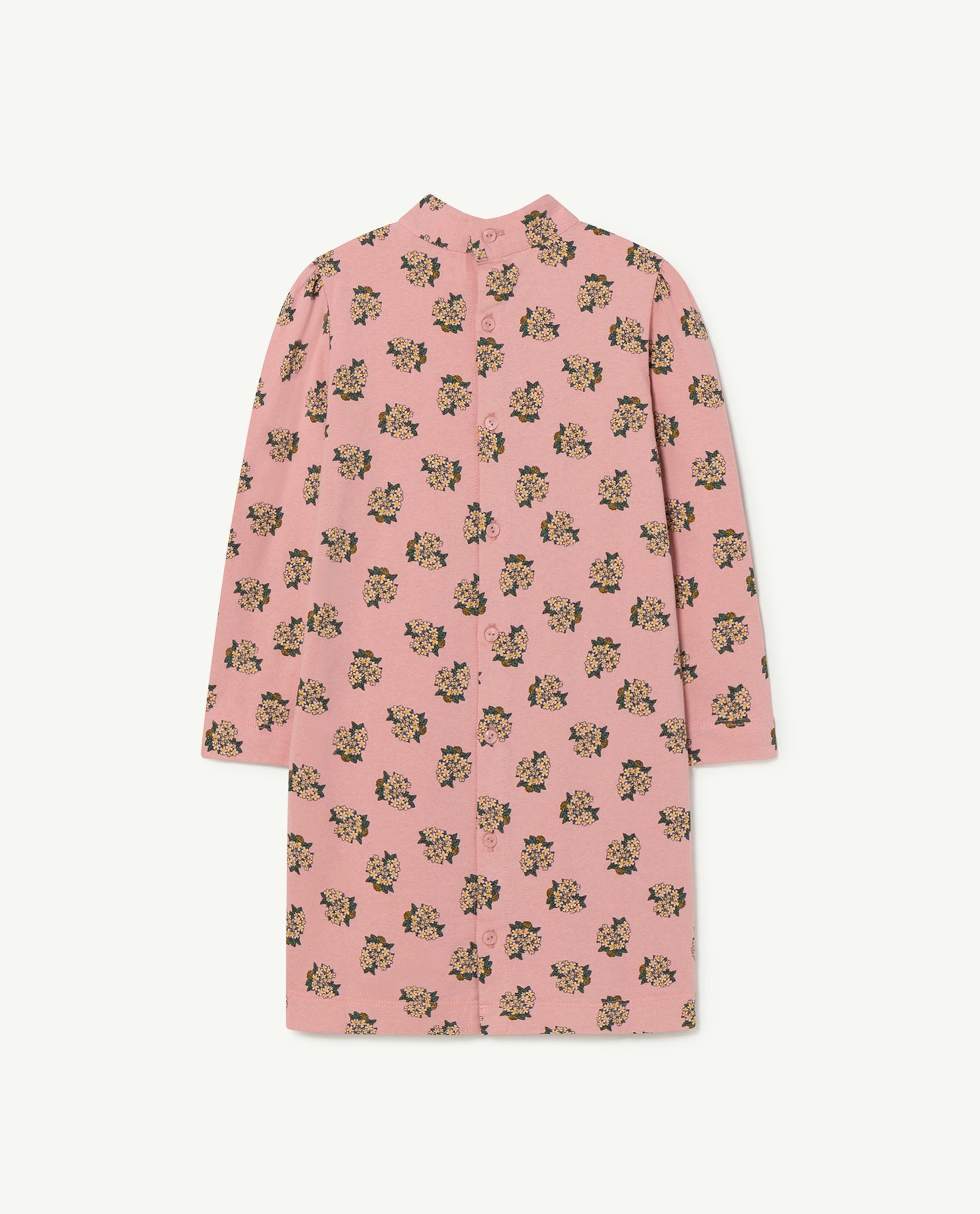 This happy clowns long sleeves Pink Jersey Bug Kids regular fit Dress is easy to wear. It buttons up from the back and has a stand-way neck. The Animals Observatory red logo is on the upper-right front side and 100% cotton made. The model's height is 130 cm and is wearing size 8 years.