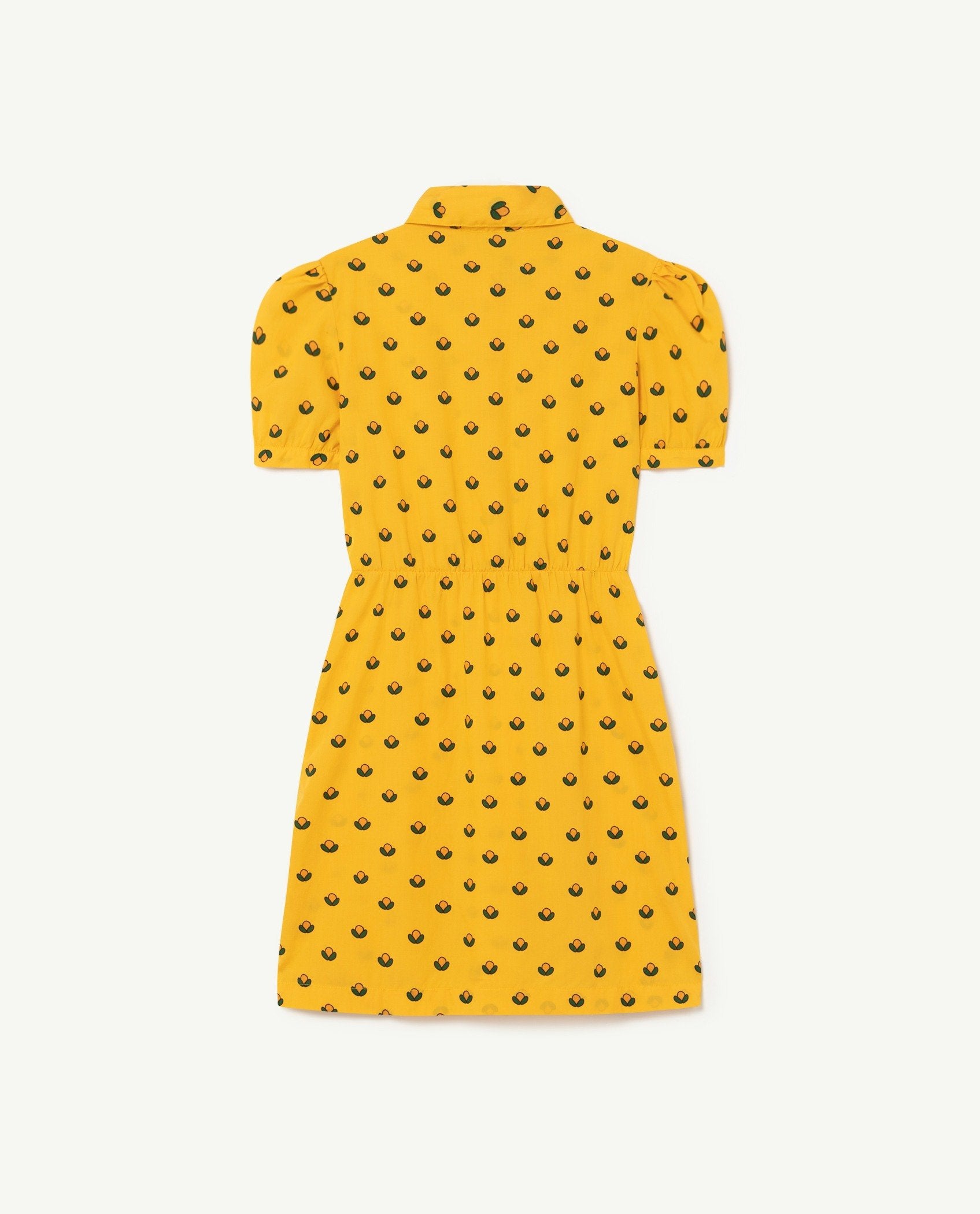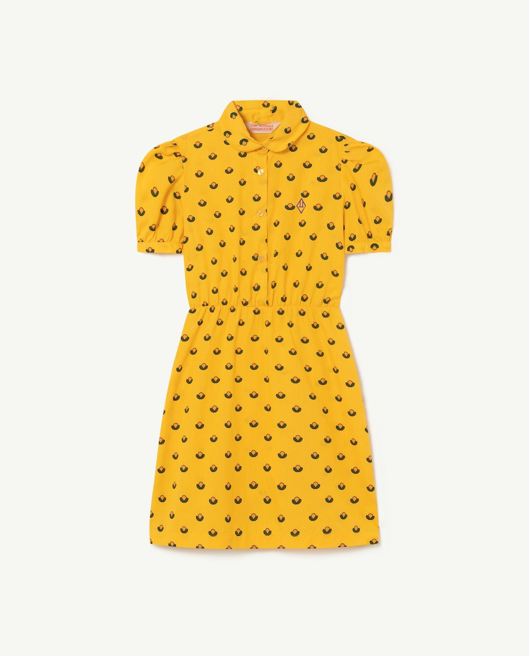 Flower power is in the spirit of this short sleeve Yellow Flowers Pigeon Dress. Fresh and ready to go for a walk in the afternoon or a day full of scholarly activities. With an elastic waist, époque collar and purple The Animals Observatory logo. The model's height is 129 cm and is wearing size 8 years.