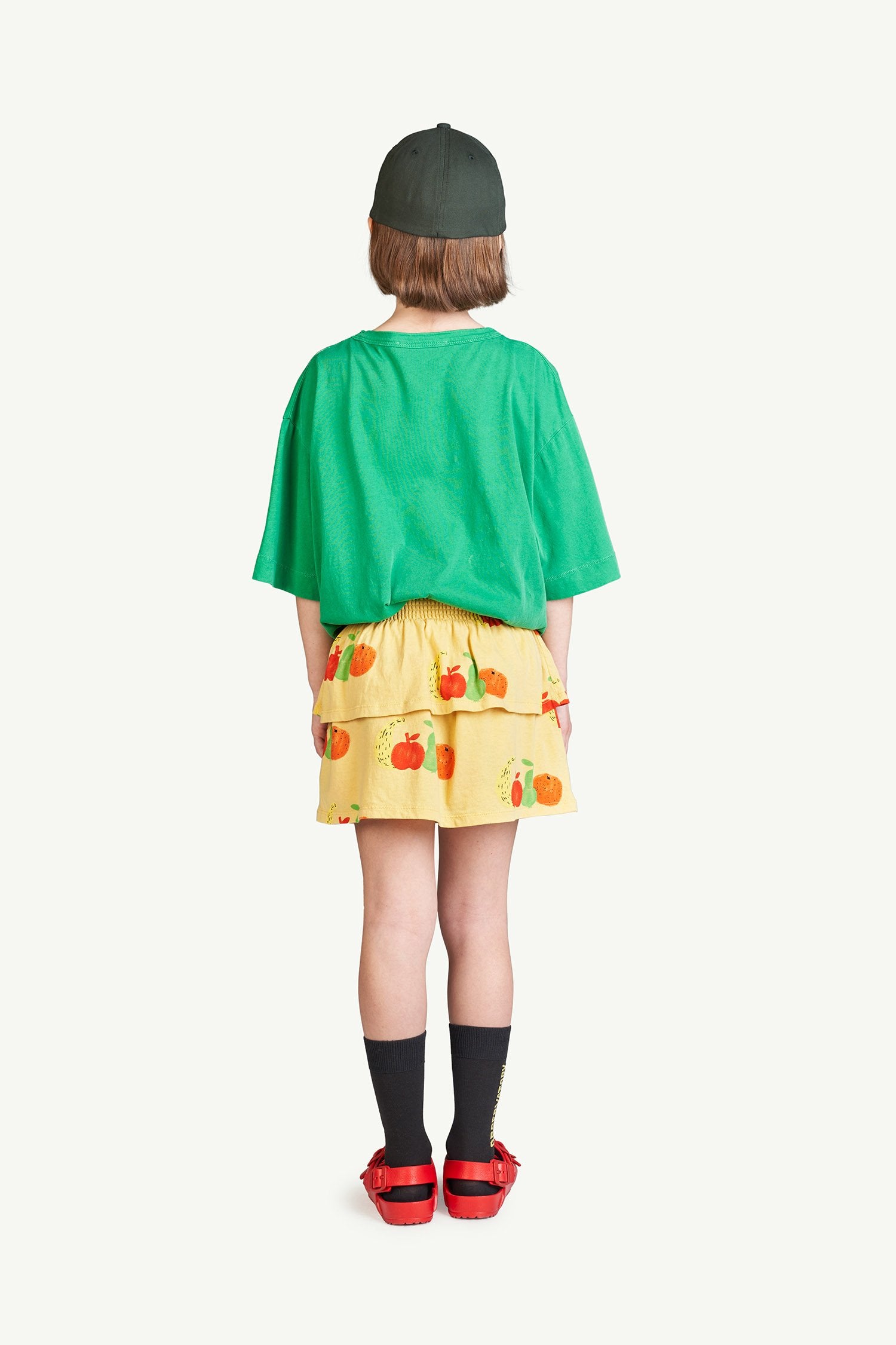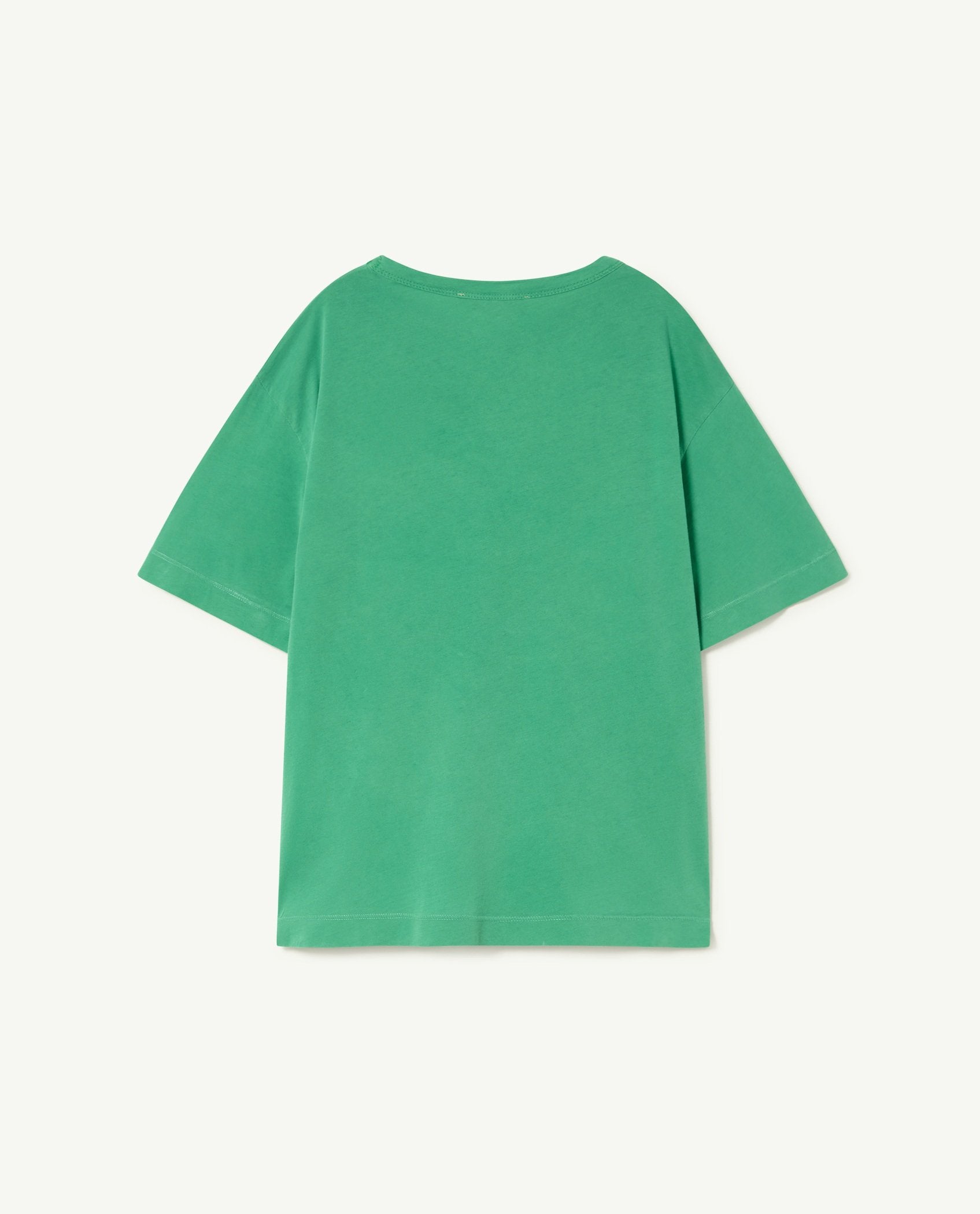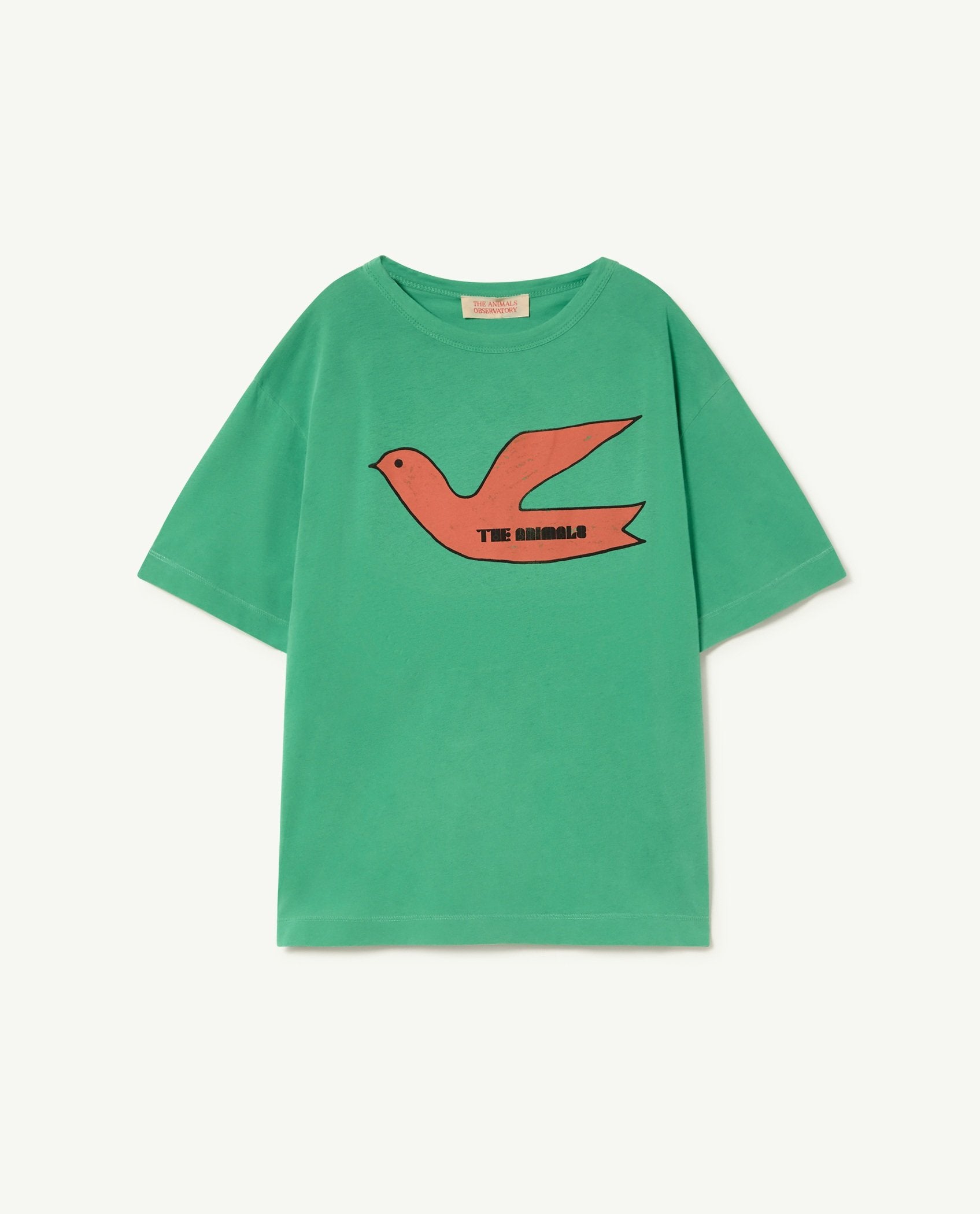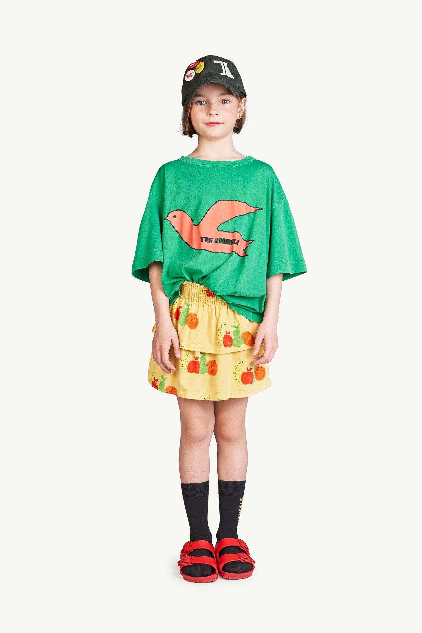 The Green Bird Rooster Oversize T-Shirt features an orange bird flying print. Made with 100% cotton and inspired by the amazing ability of birds to fly. The model's height is 130 cm and is wearing size 8 years.