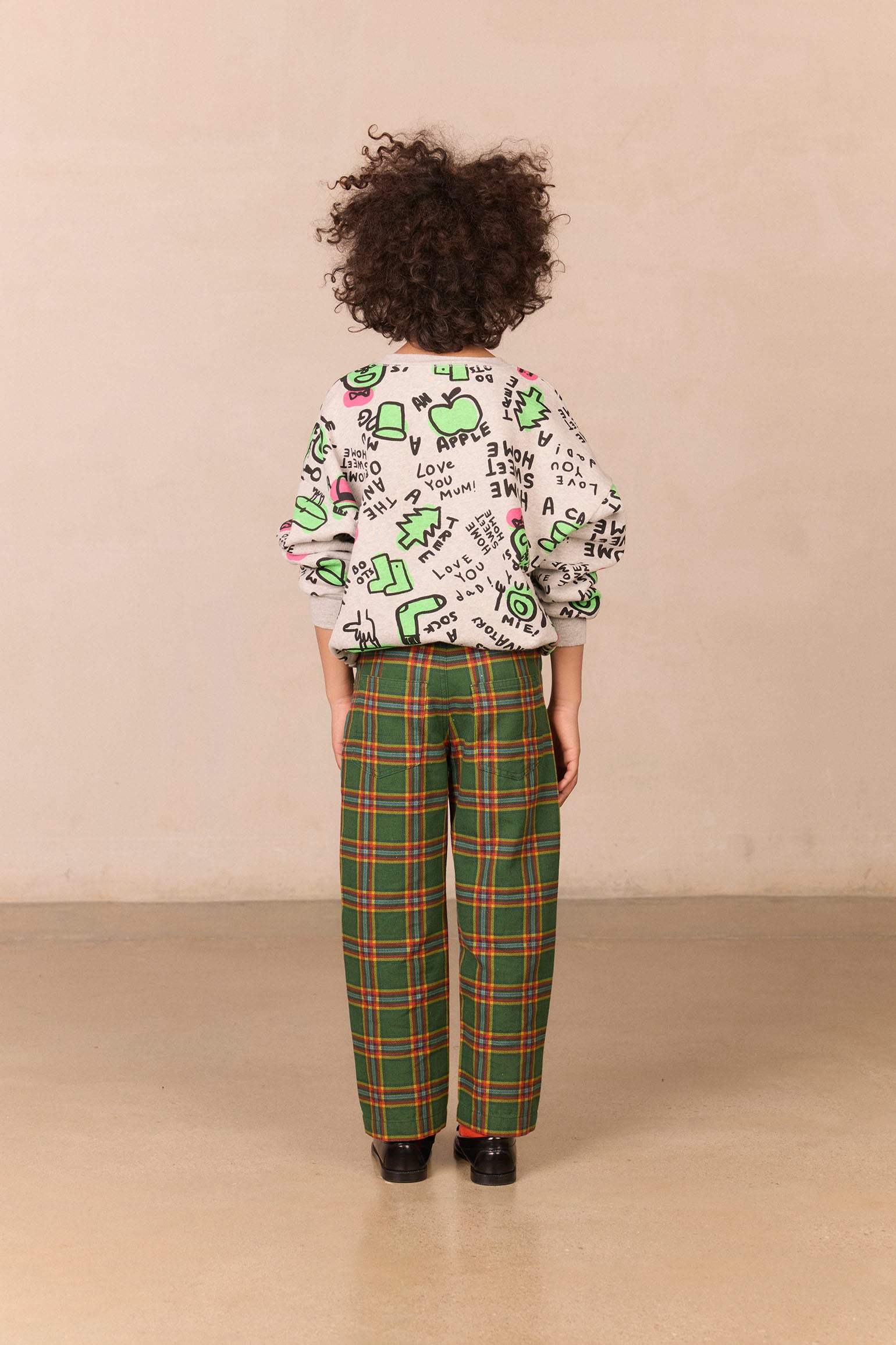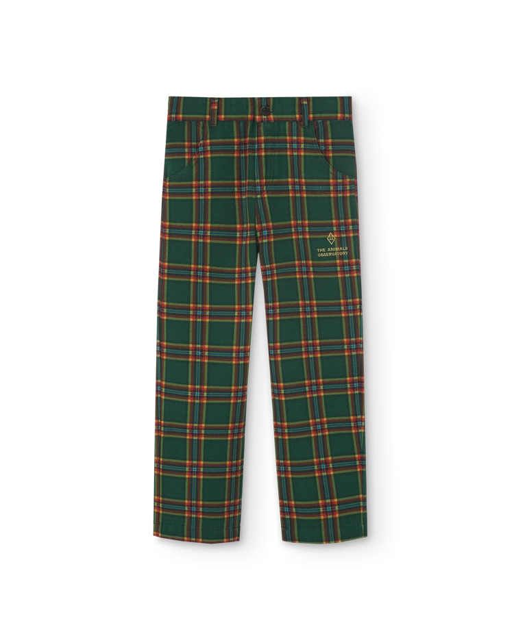 Green pants with red squares, cozy and fun for a holiday-inspired look.