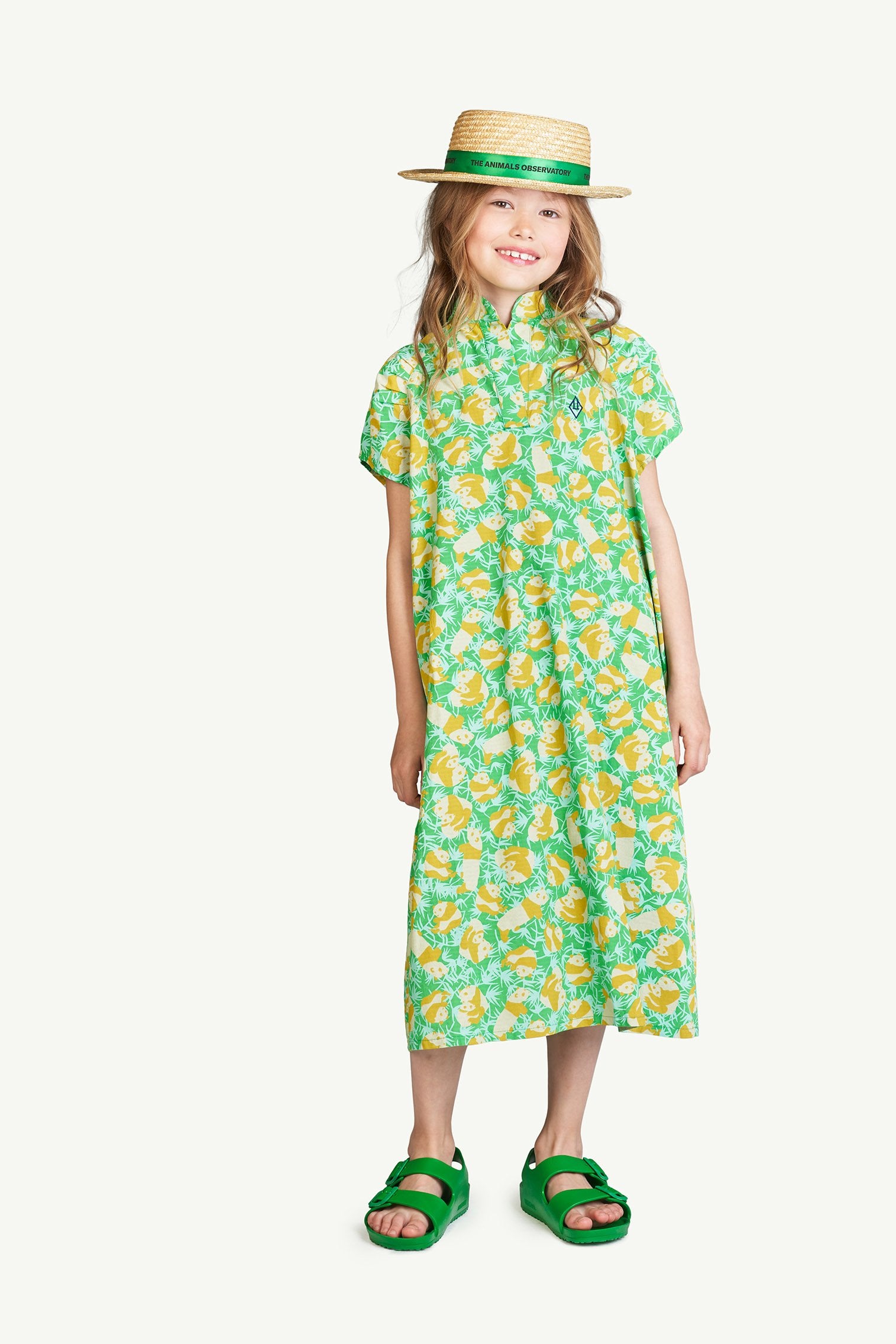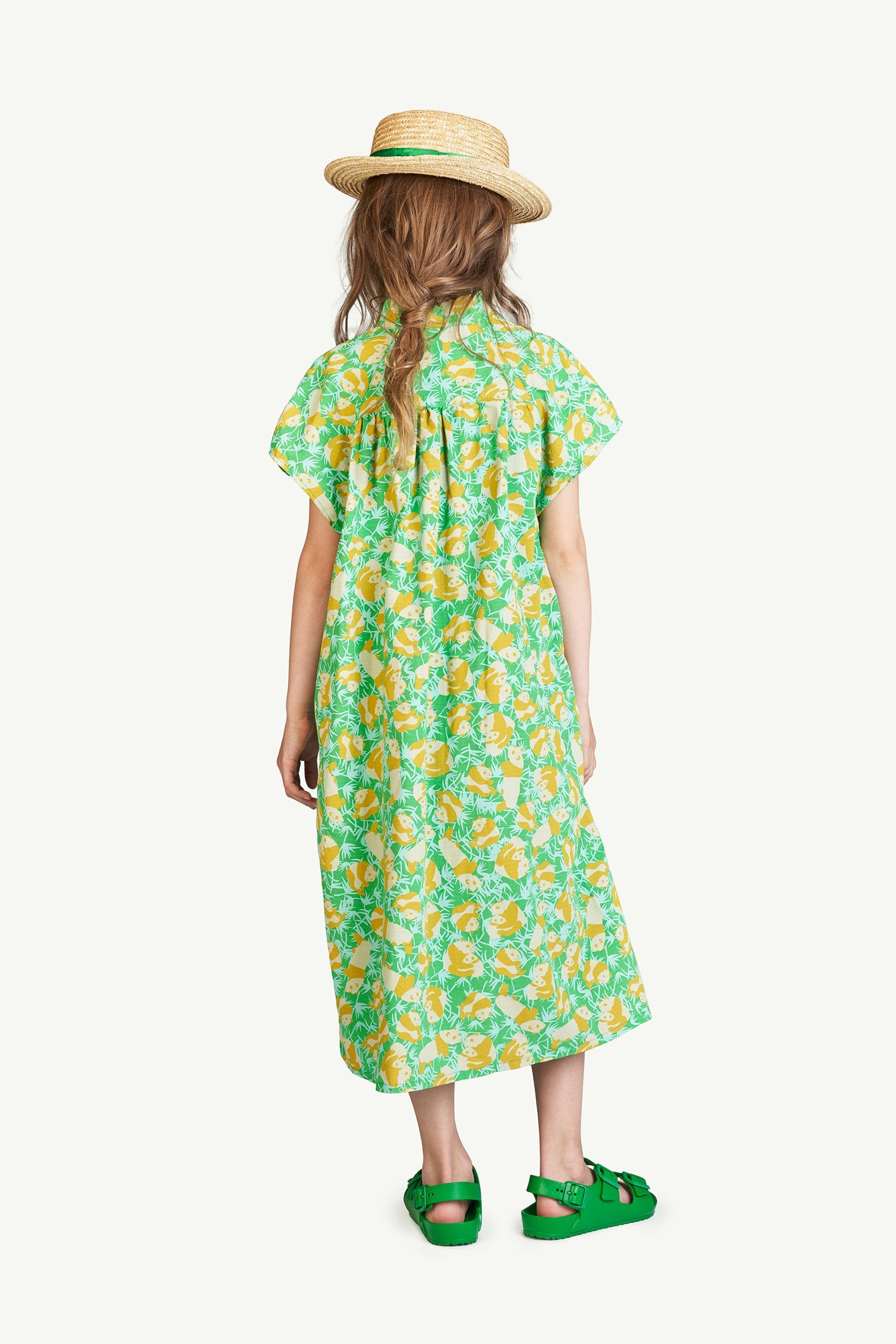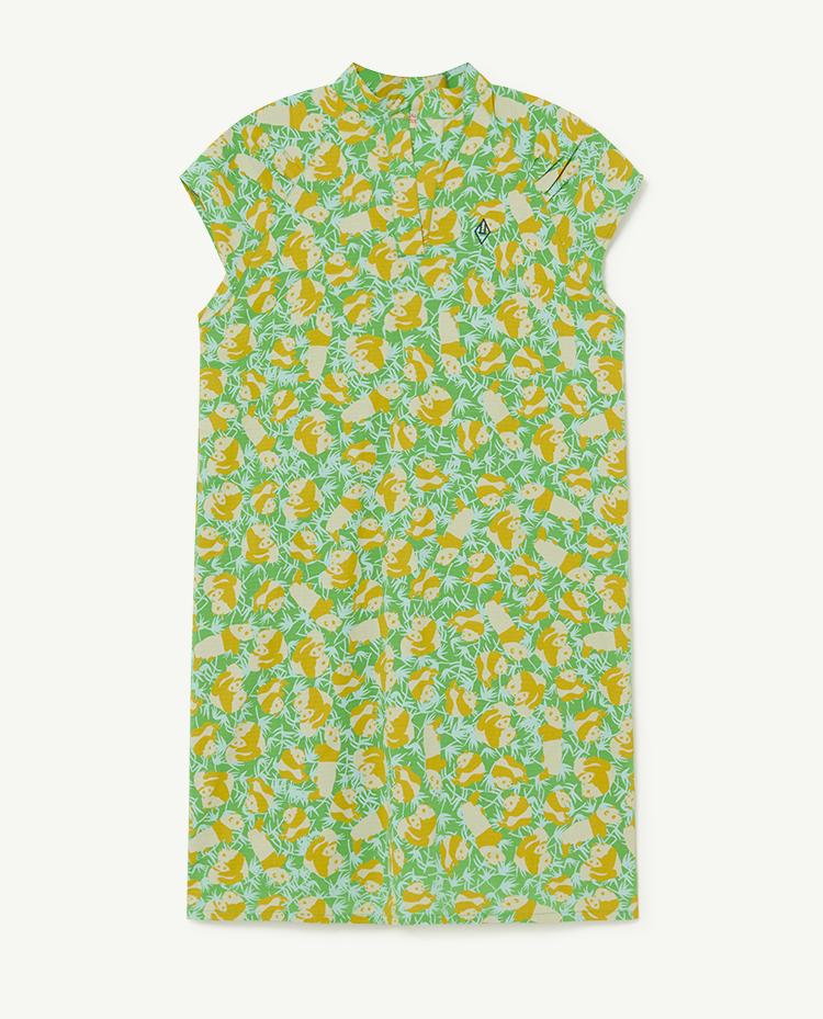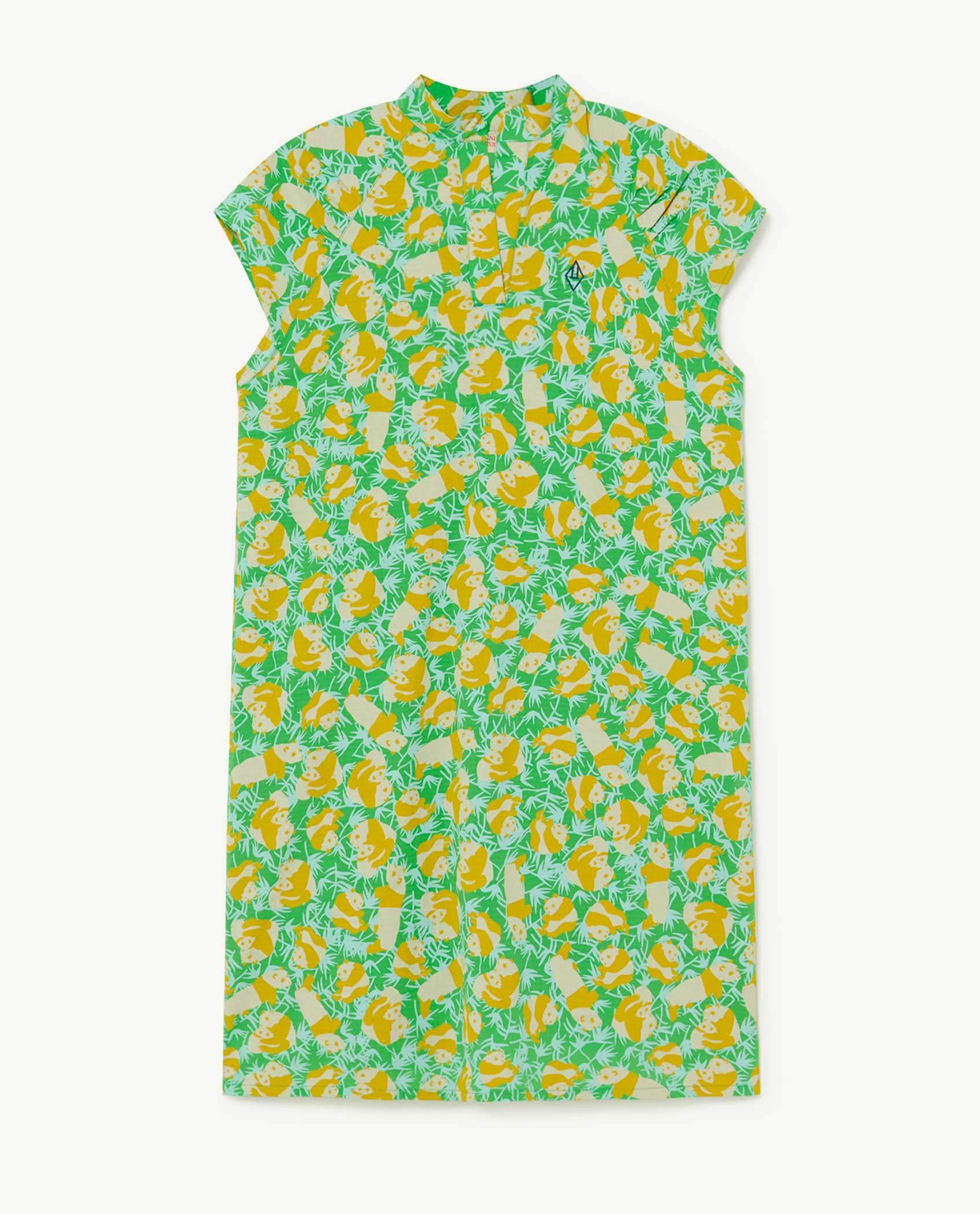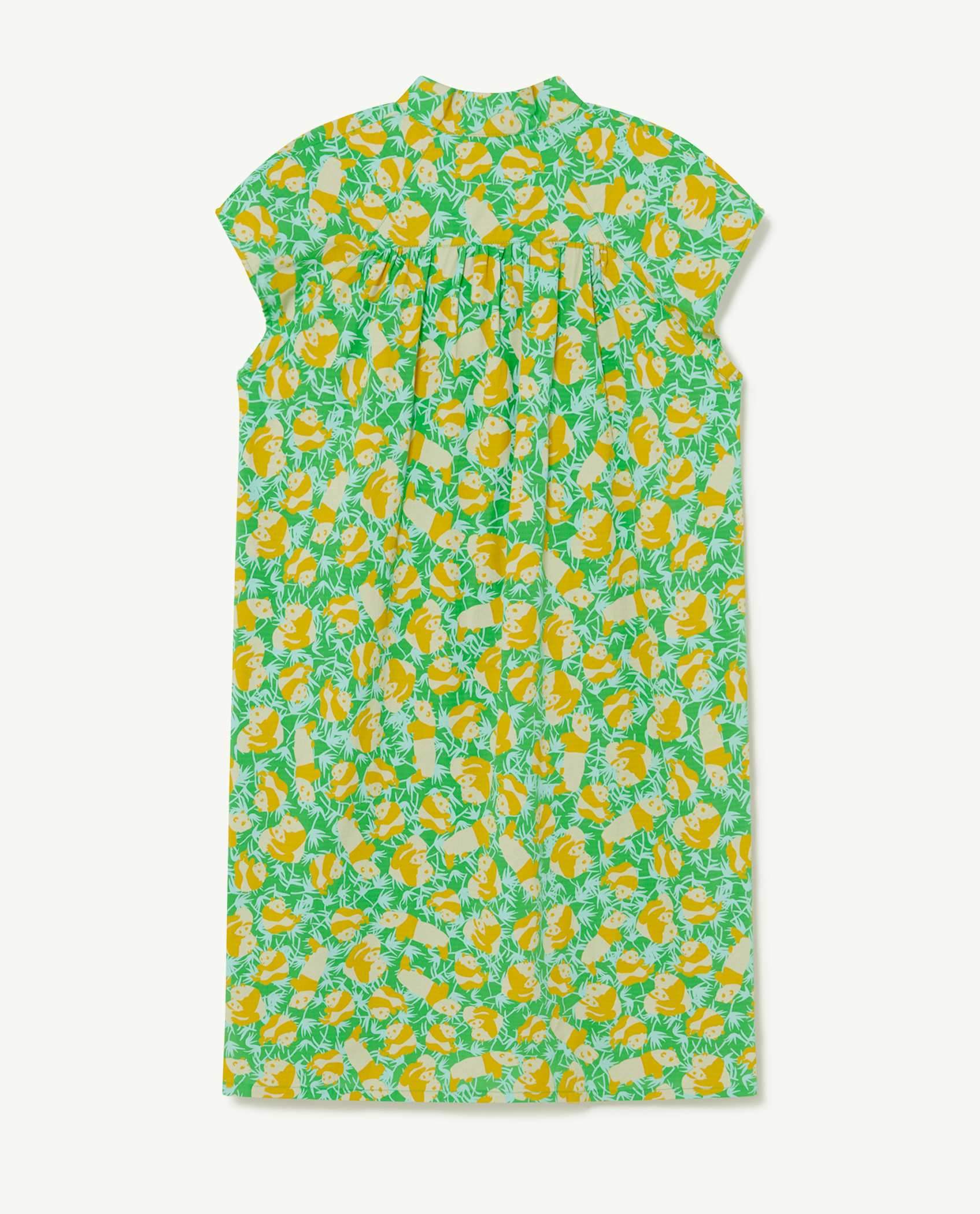 The Green Pandas Swallow Dress is an oversize shirt dress featuring an open Mao neck and an original print full of pandas. An ideal dress to go to any after-school activity. Exclusively available in our e-shop. The model's height is 132 cm and is wearing size 8 years.