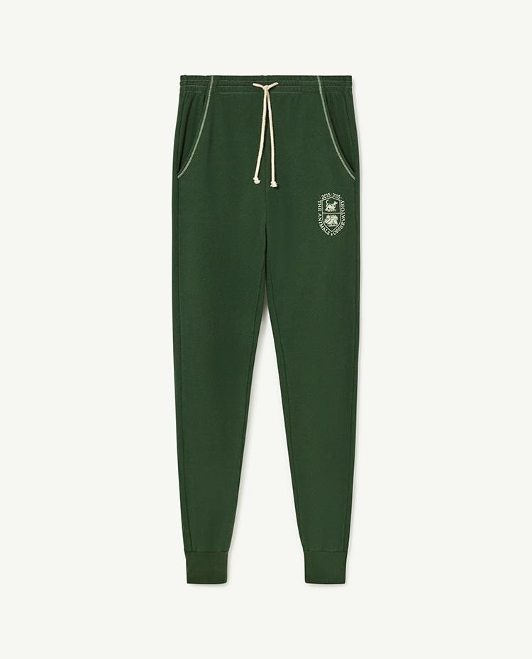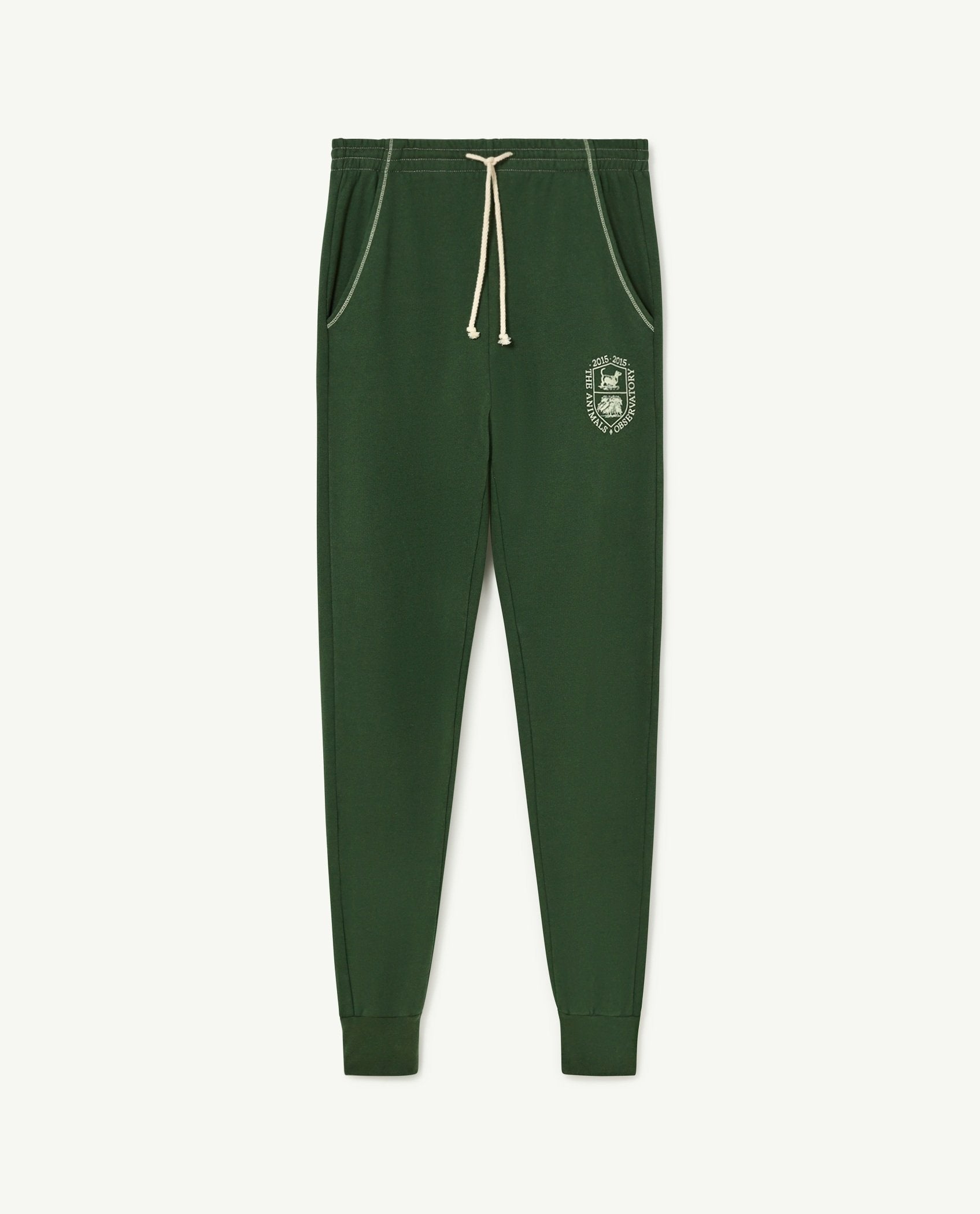 The Green Panther Kids Pants in a regular fit are 100% cotton made, with 20% of it being recycled cotton from previous collections. These original trousers feature two side pockets, an elastic waist, and a zip in each ankle, as well as a print of a college coat-of-arms-like reinterpretation of The Animals Observatory logo. This is an adult style, so it includes XS, S, M and L sizes for the first time in 2015 history.