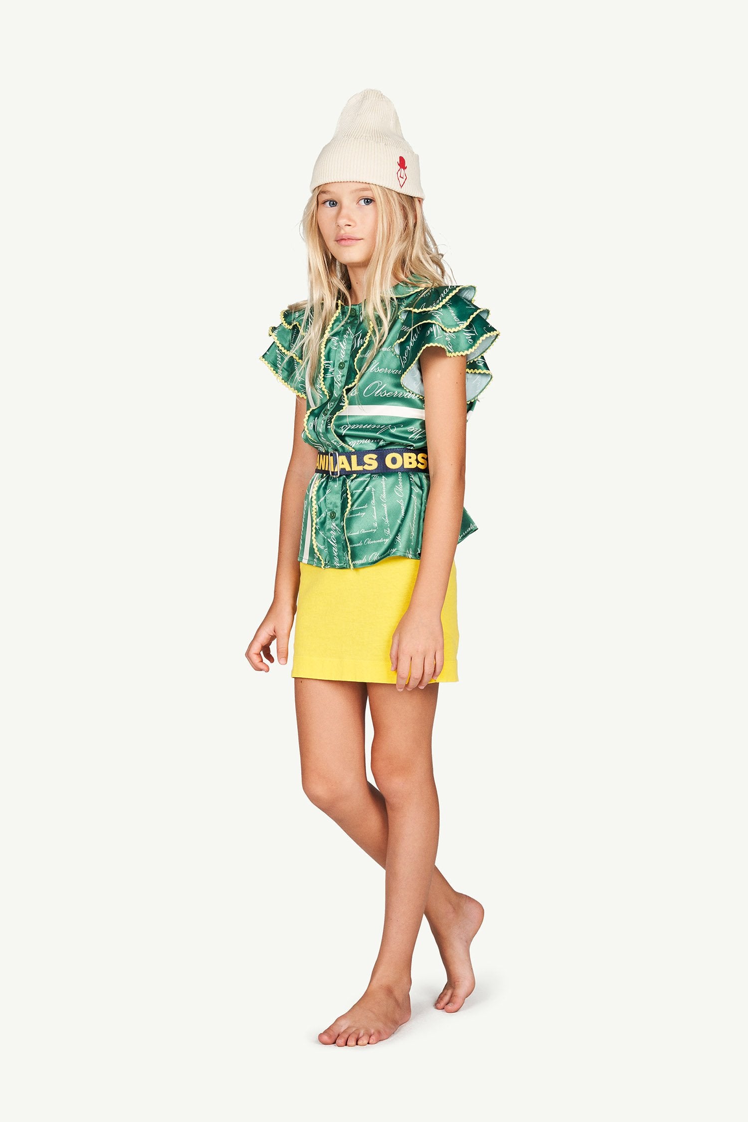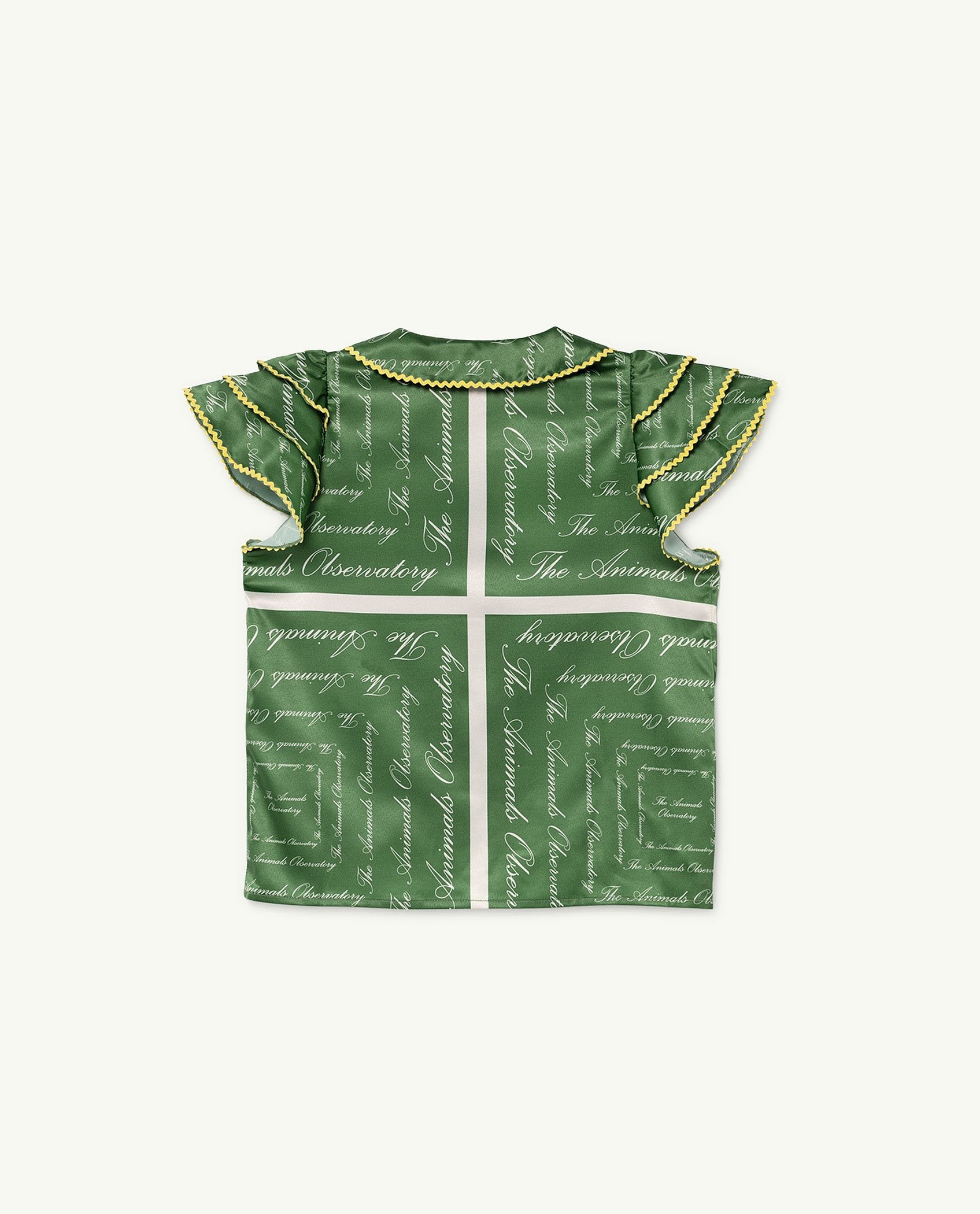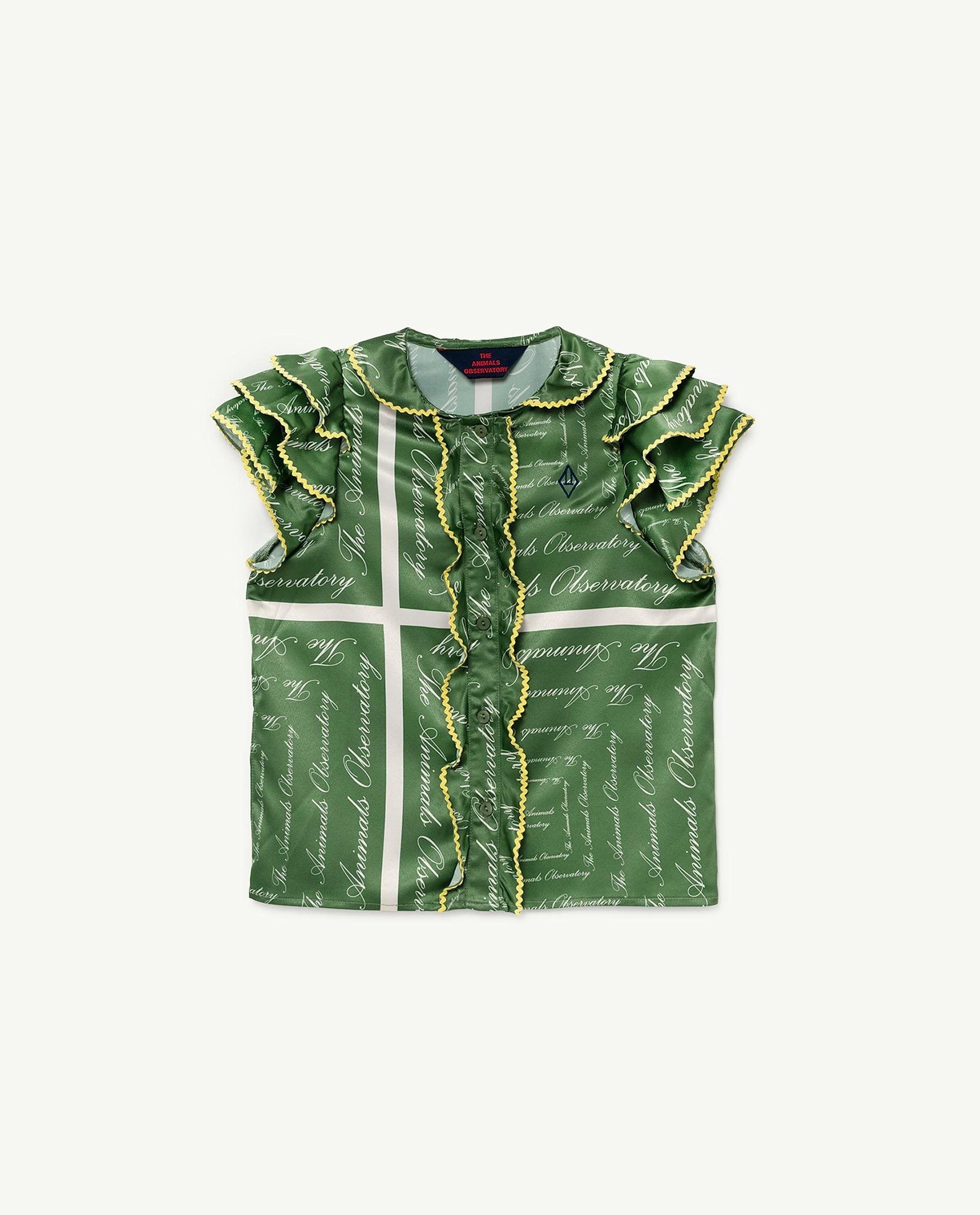 The Green The Animals Silky Parakeet Blouse, a simple design with a silky finish. Featuring an elasticated waist and cuffs, white asymmetrical stripes and the The Animals Observatory logo.