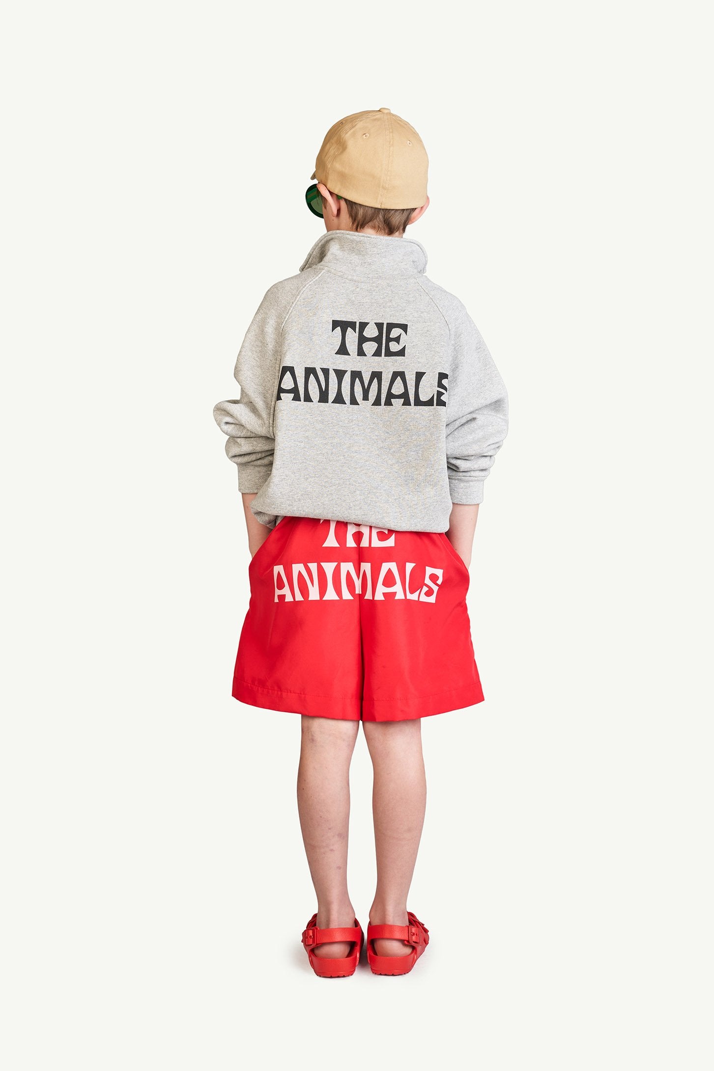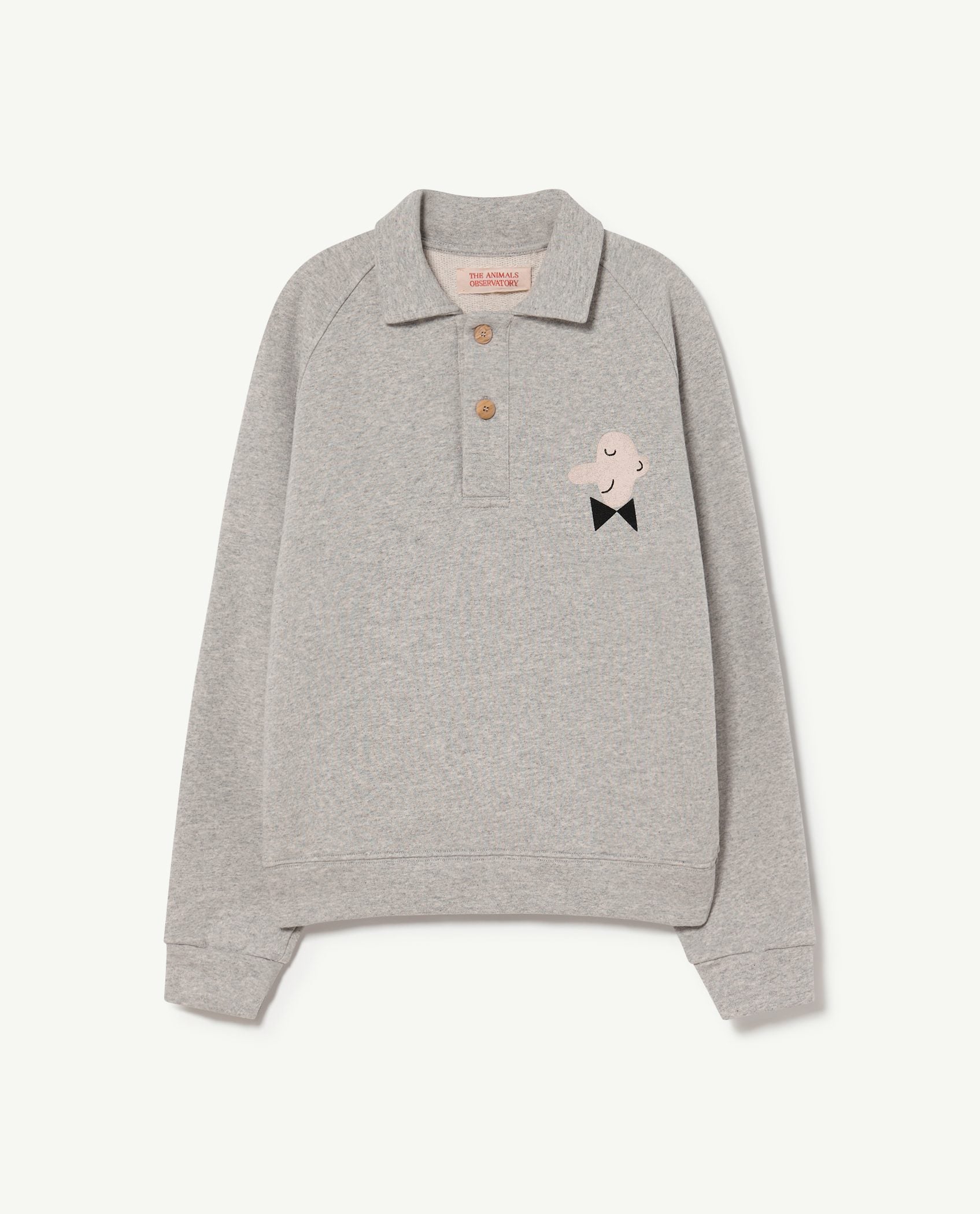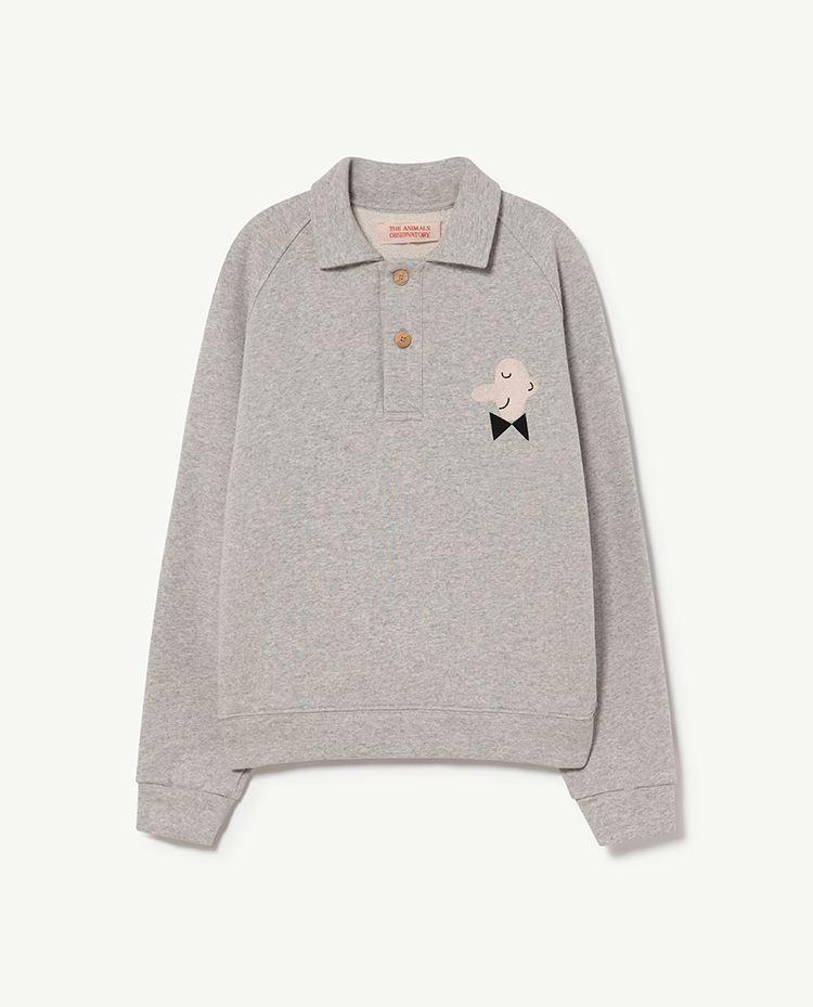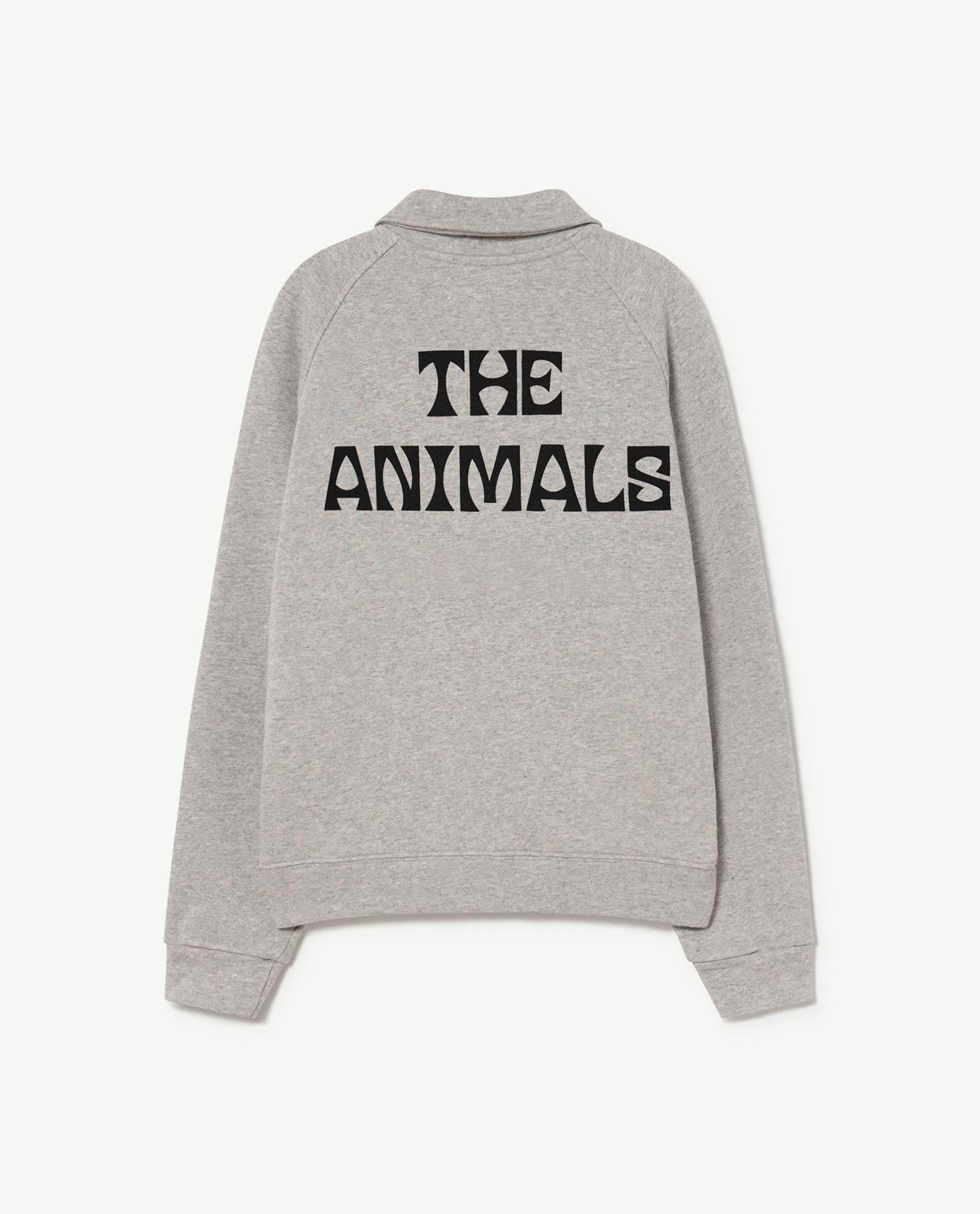 The Grey Face Seahorse Sweatshirt is a 100% cotton made sweatshirt featuring a flat neck and The Animals capital retro letters on the back. A funny little face print is on the upper-right side. The model's height is 128 cm and is wearing size 8 years.