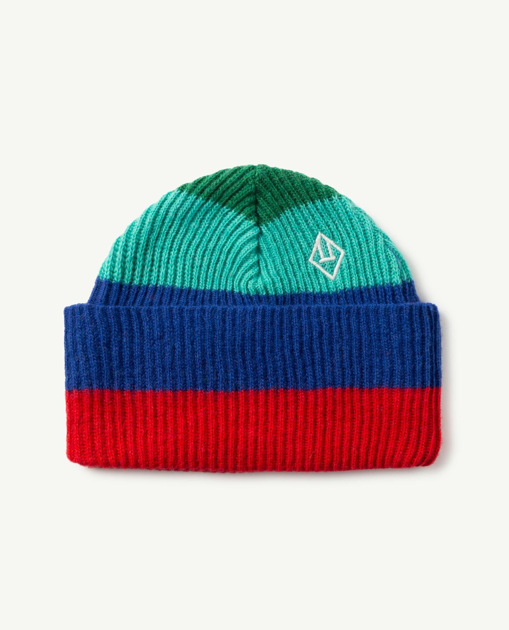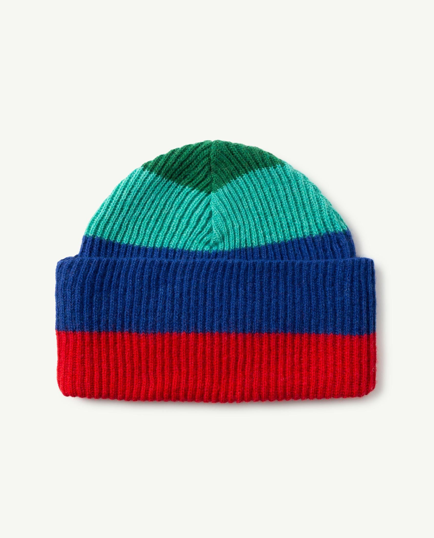 This soft wool Multicolor Stripes Pony Hat combines two colours of green, blue and red horizontal stripes with a white The Animals Observatory logo at the front. The diameter of the circumference is 40 cm. The model's height is 126 cm and is wearing size 8 years.