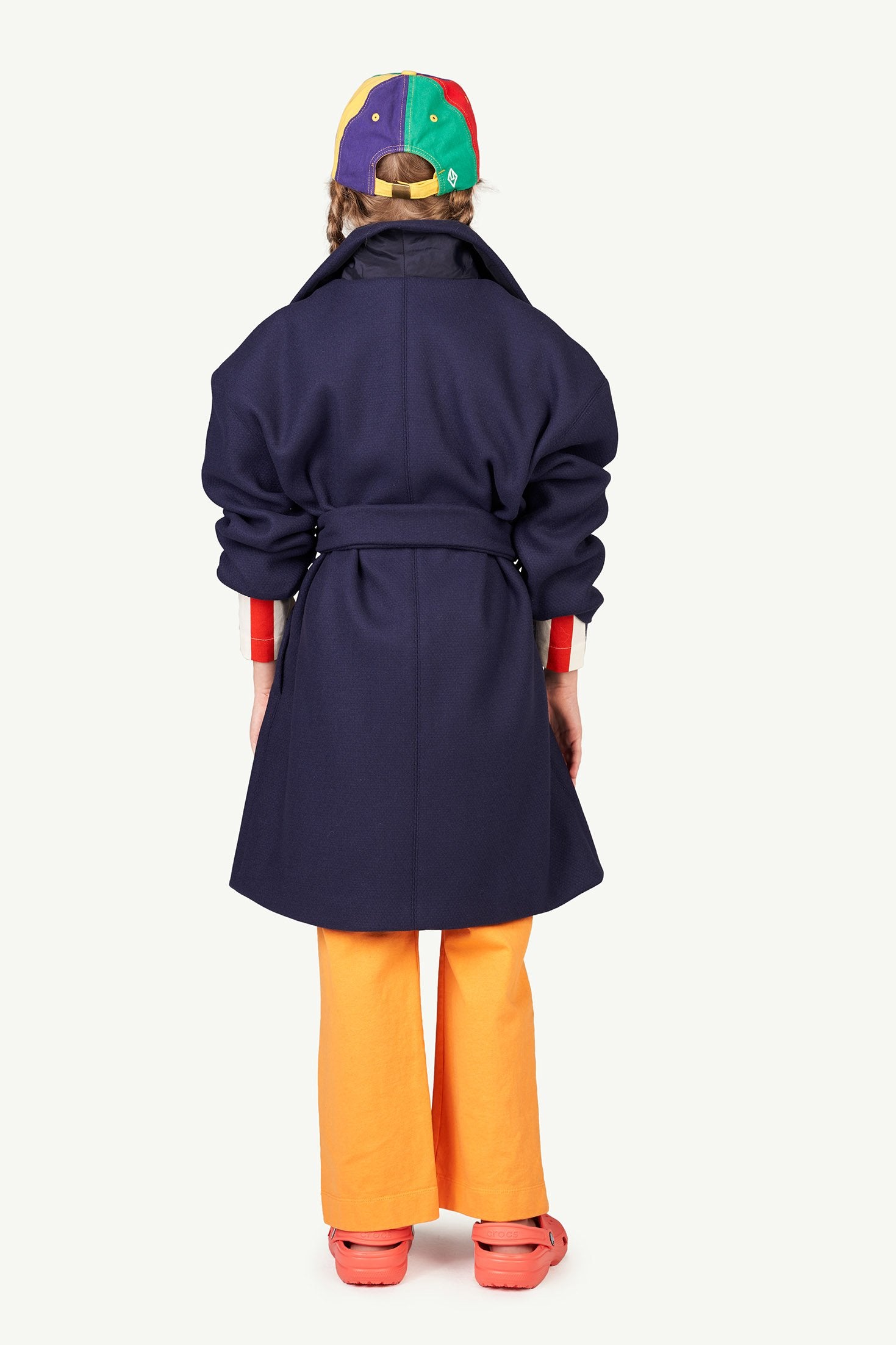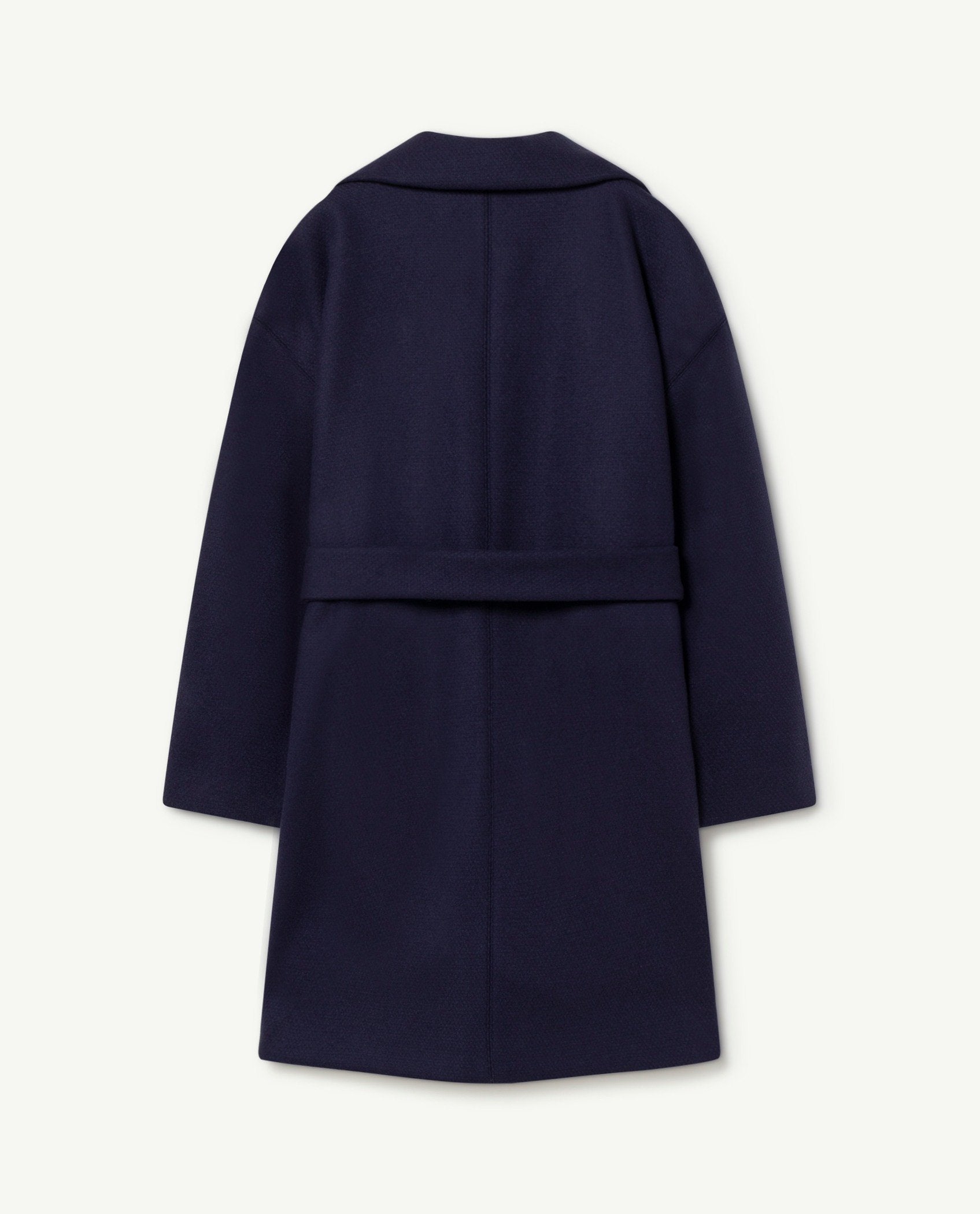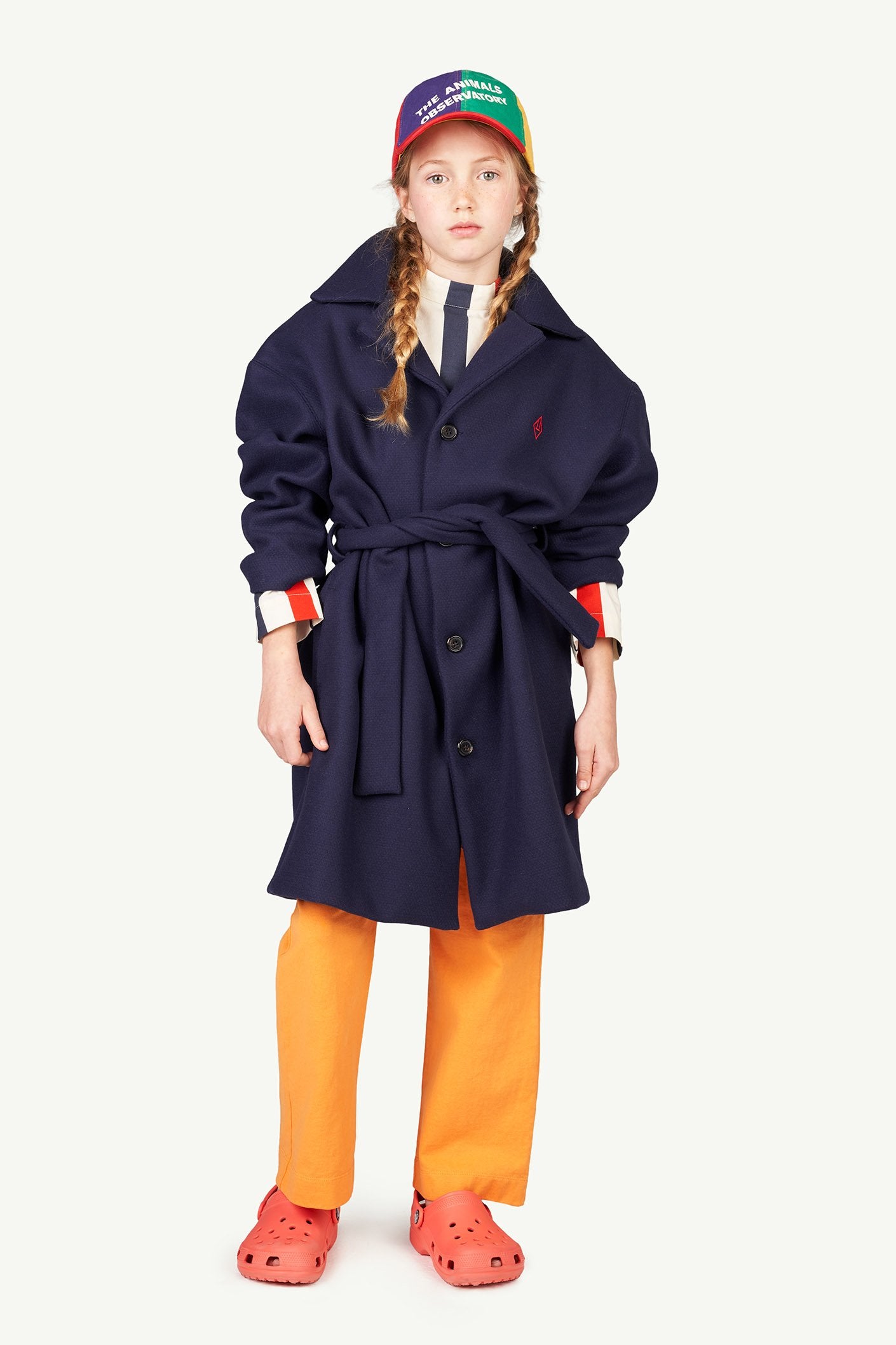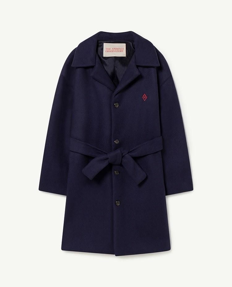 This Blue Jaguar Kids relaxed fit Jacket resembles a Chesterfield coat that buttons up in the front and has a small The Animals Observatory logo on the upper-right side. It is lined and has a belt at the waist. Only available in our online store. The model's height is 134 cm and is wearing size 8 years.
