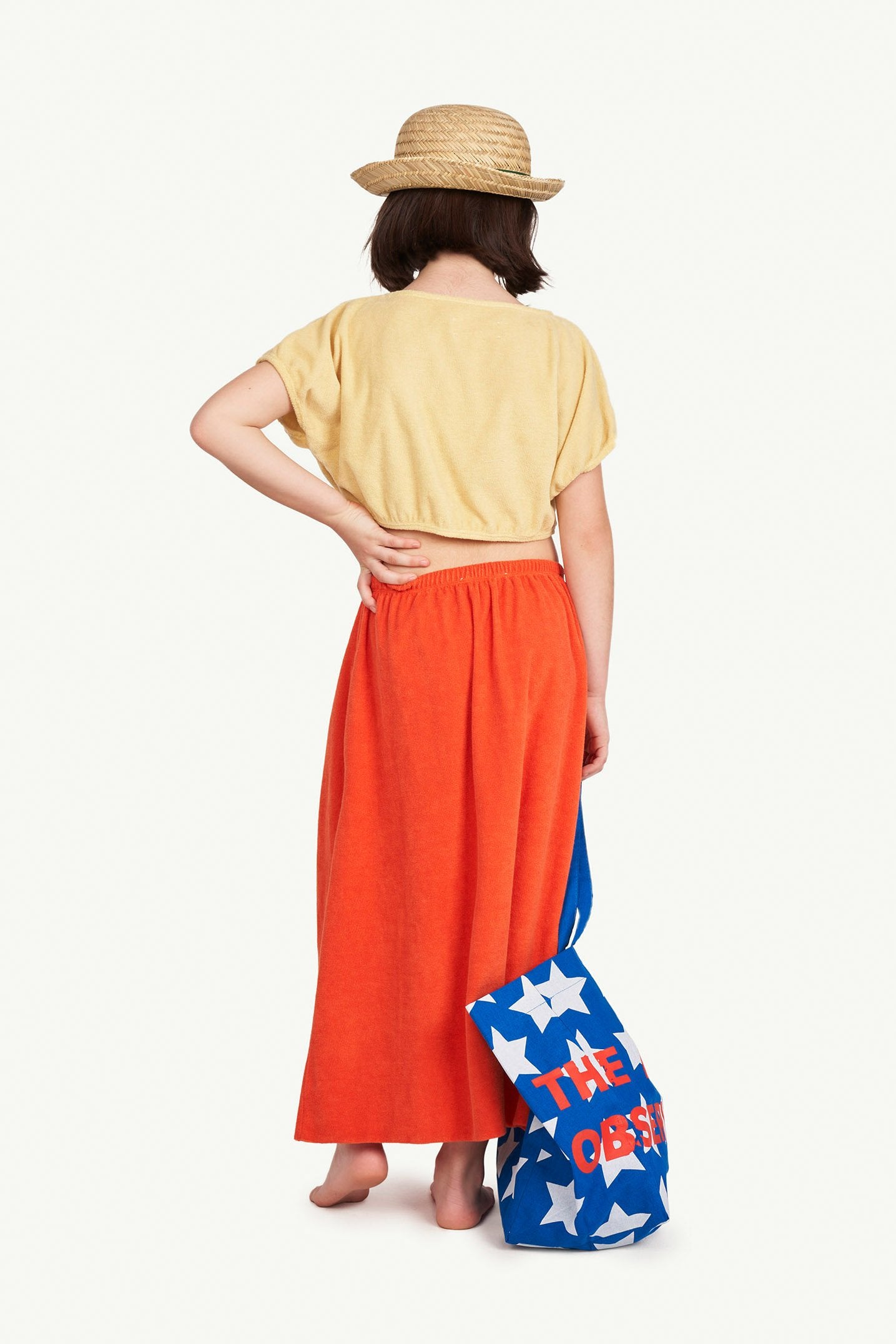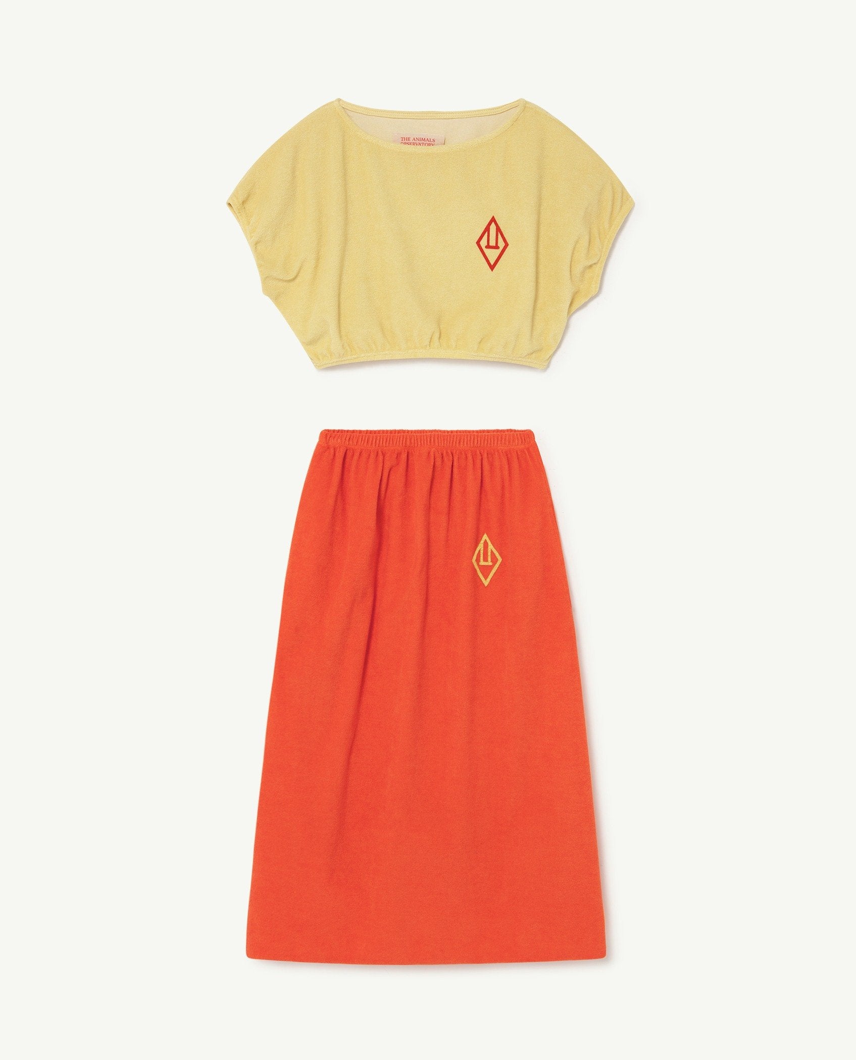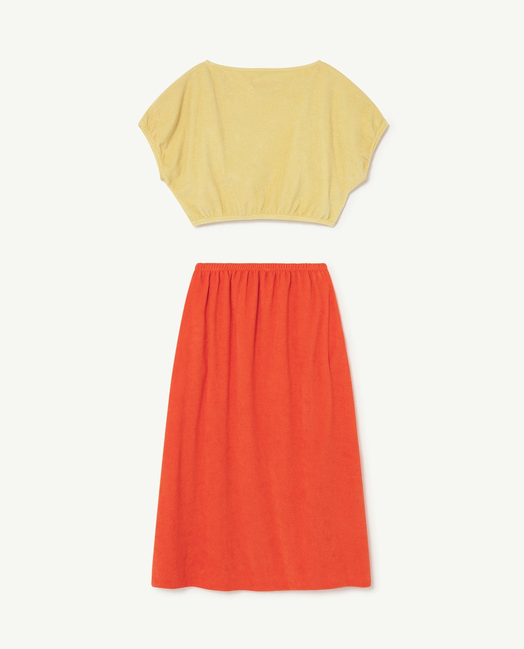 The Yellow Logo Horsefly Dress is a two-piece cotton set with a long skirt and T-shirt in contrasting shades of yellow and red and featuring The Animals Observatory logo. Light and easy-to-wear, this is ideal for a day out with friends. The model's height is 133 cm and is wearing size 8 years.