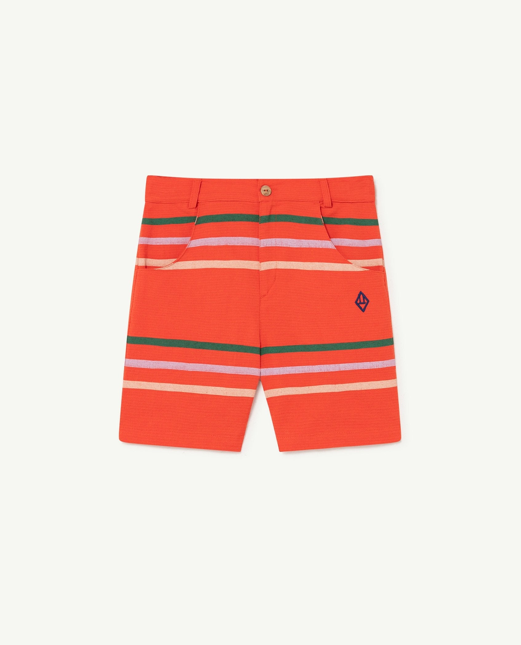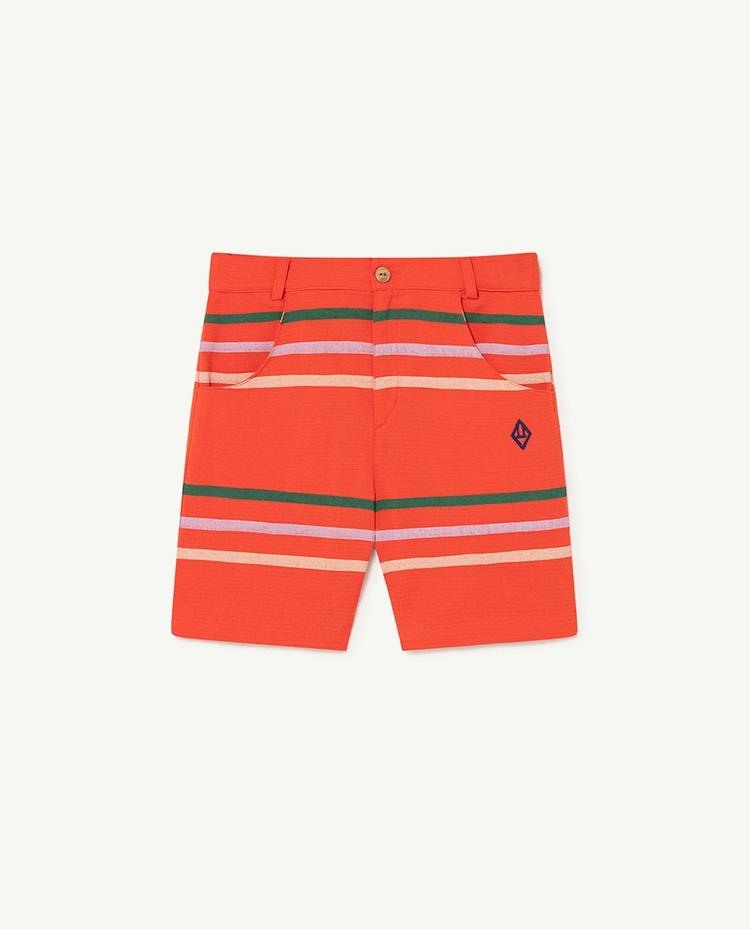 The Red Stripes Pig Pants are a soft blend of cotton and linen with a button-up waist and The Animals Observatory logo on the leg. The model's height is 131 cm and is wearing size 8 years.