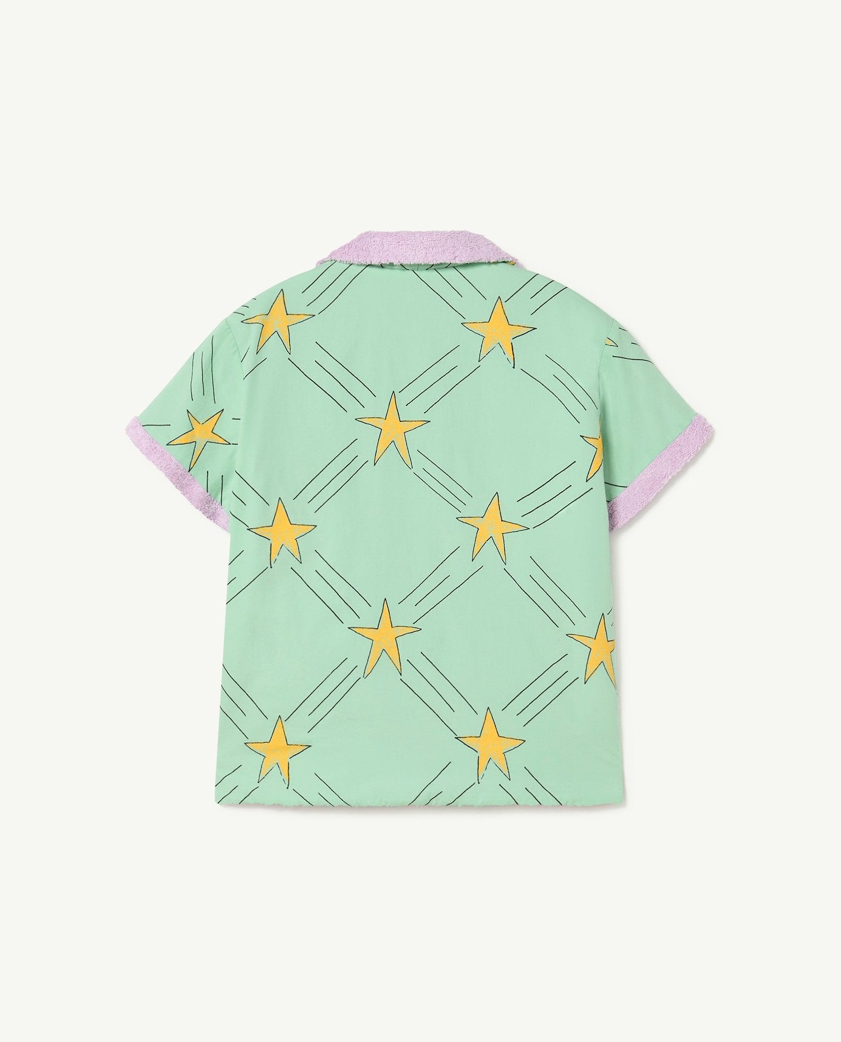 The Blue Stars Whale Jacket was made for summer afternoons, featuring a retro-inspired faces print and contrasting yellow sleeves and pockets. The model's height is 129 cm and is wearing size 8 years.