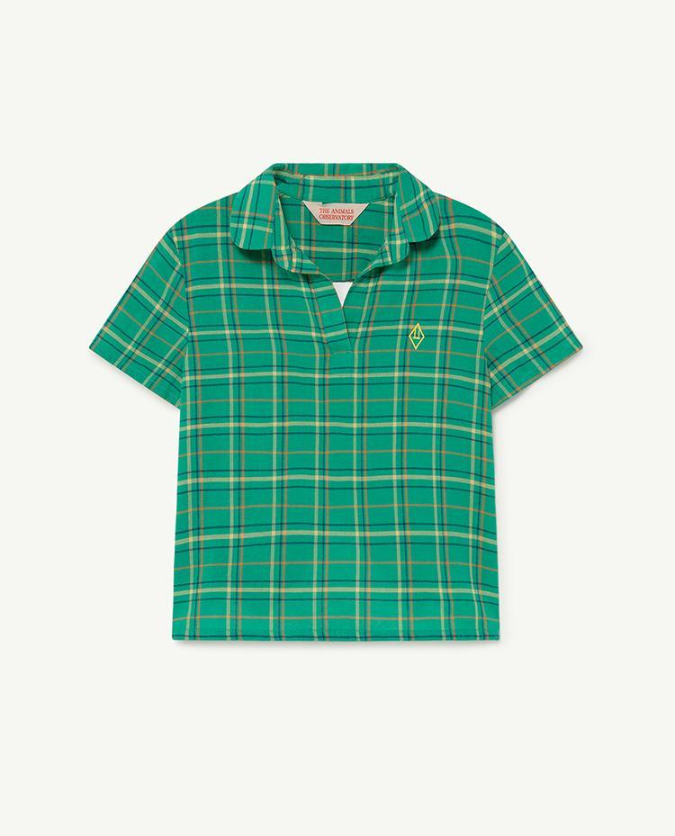 The Green Logo Kangaroo Shirt has a Peter Pan collar and is a soft blend of cotton and linen. Featuring short sleeves and a green plaid print. The model's height is 133 cm and is wearing size 8 years.