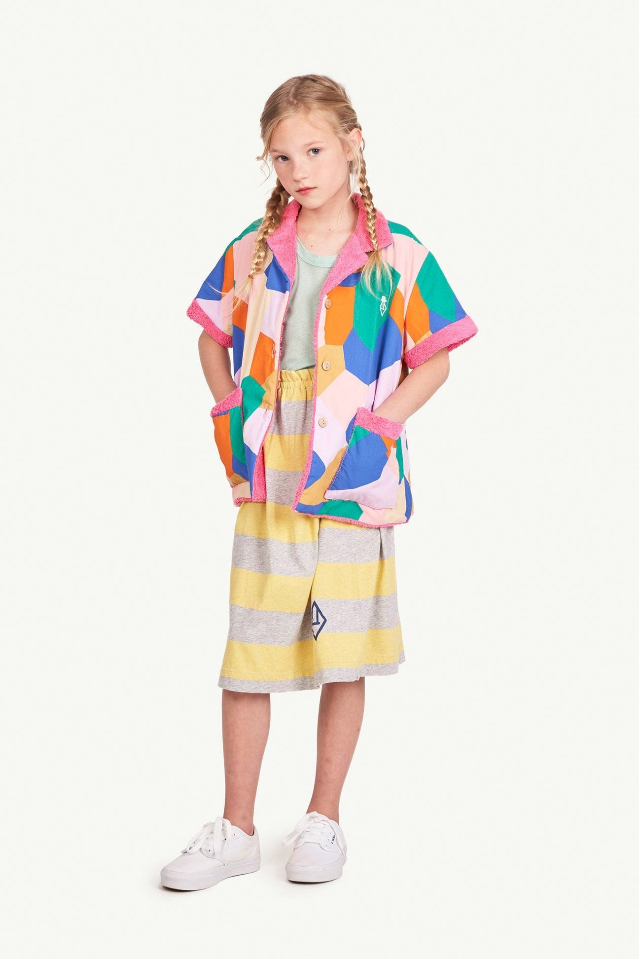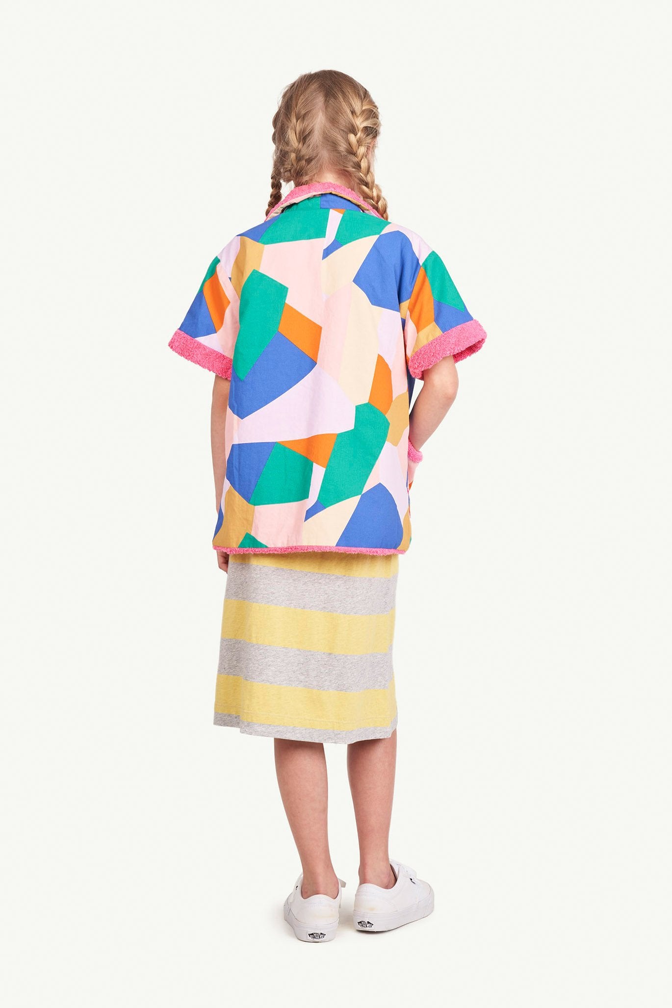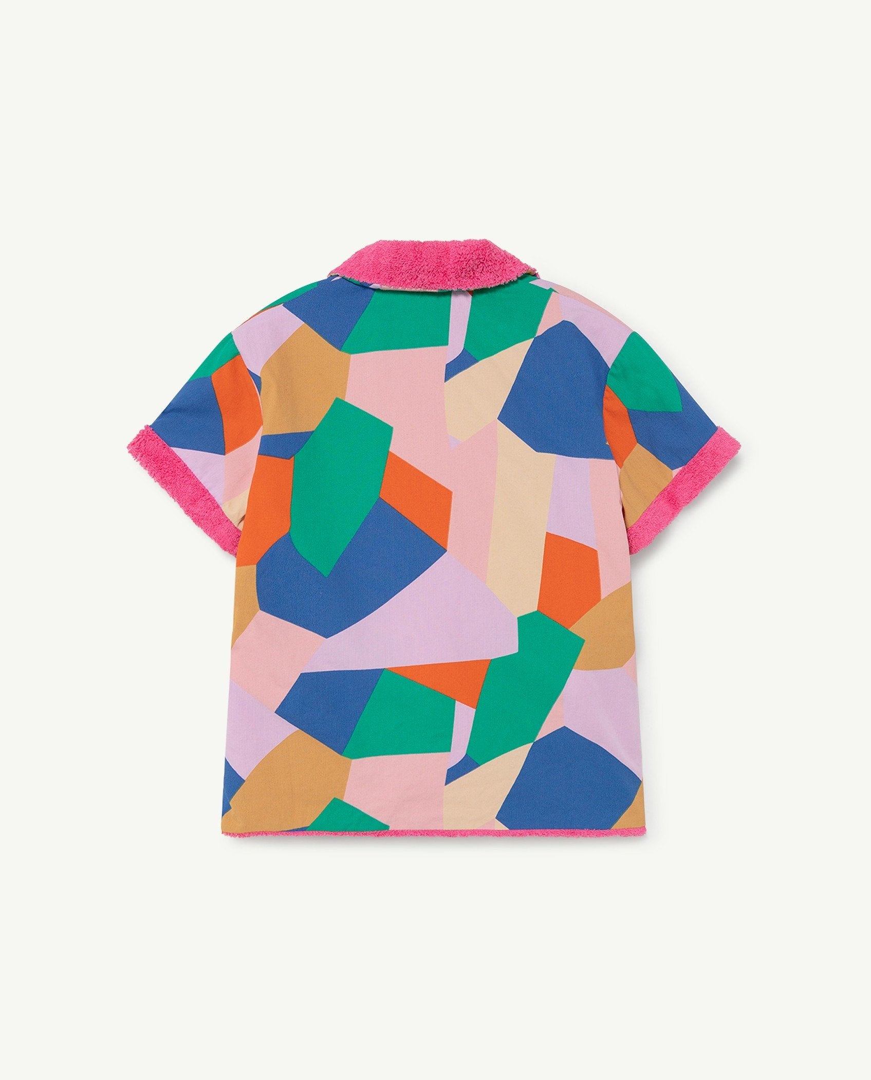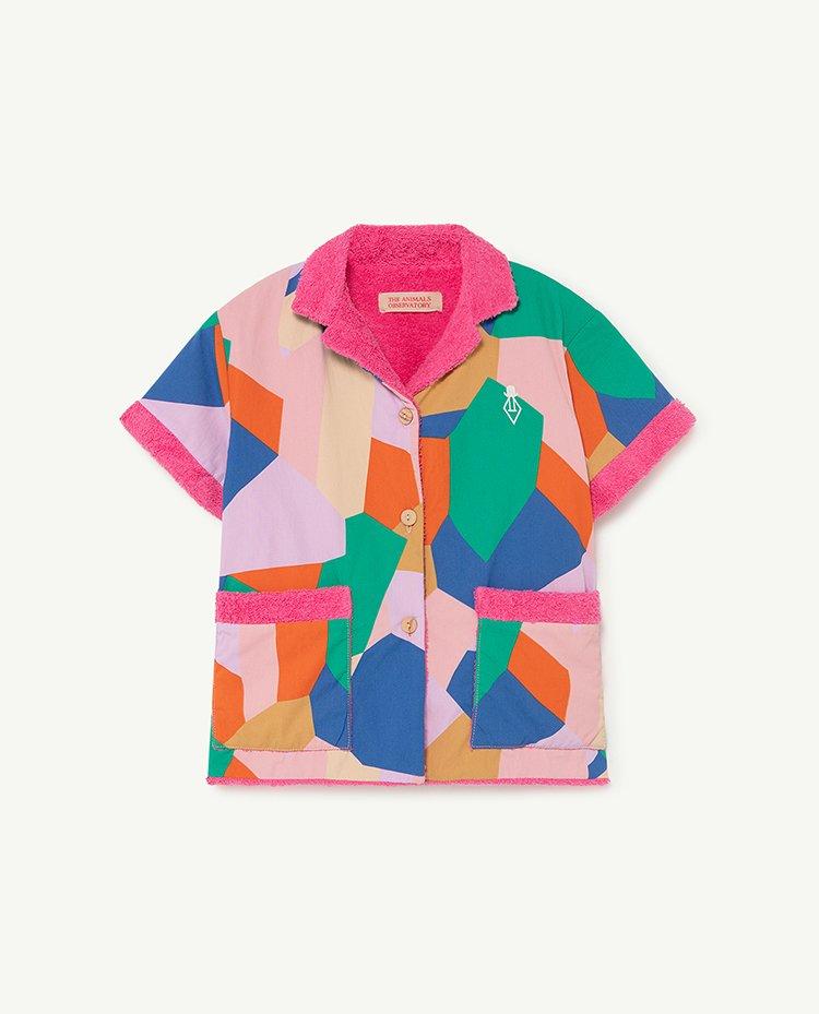The Lilac Geometric Forms Whale Jacket was made for summer afternoons, featuring a boldly coloured geometric print and contrasting magenta sleeves and pockets. The model's height is 129 cm and is wearing size 8 years.