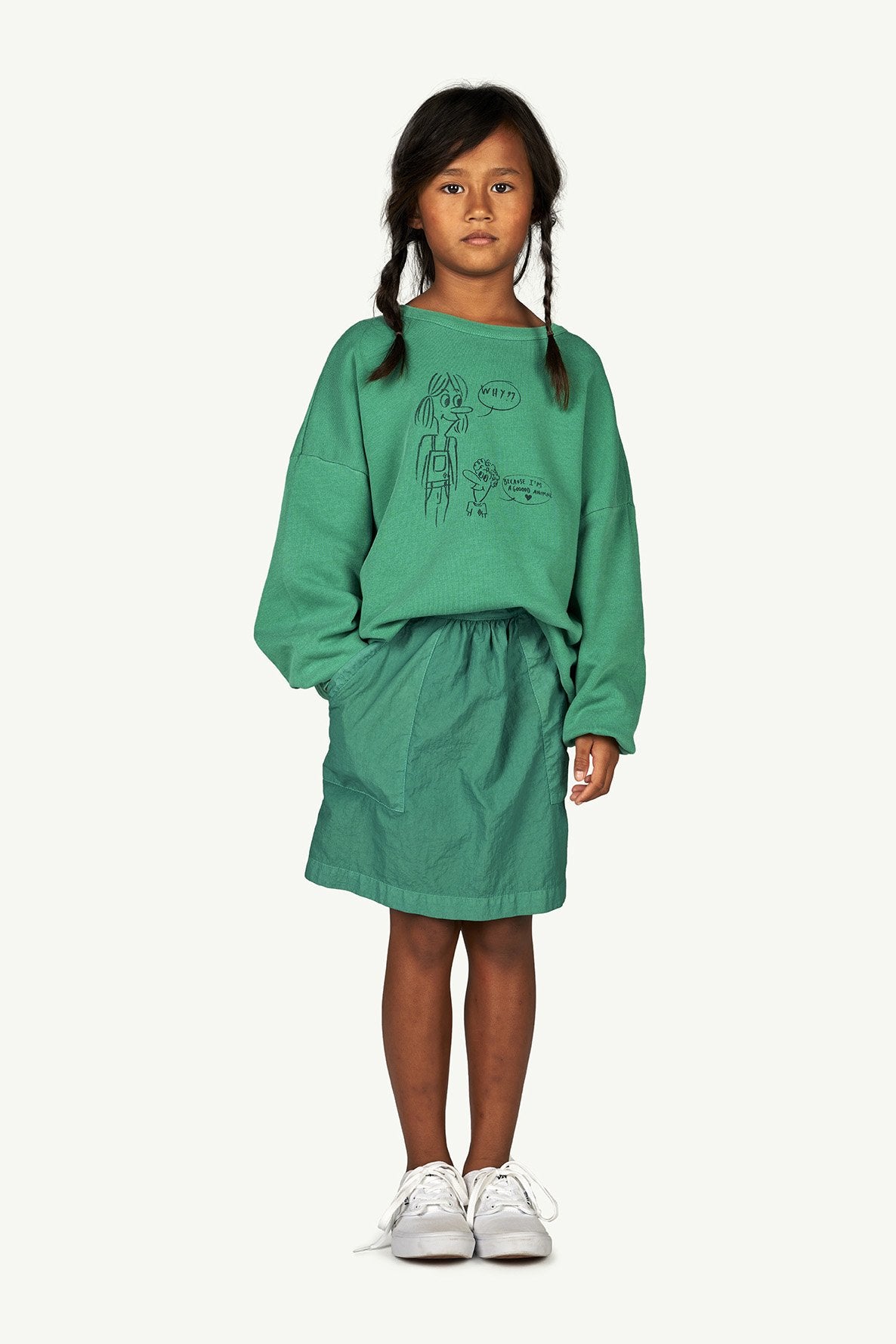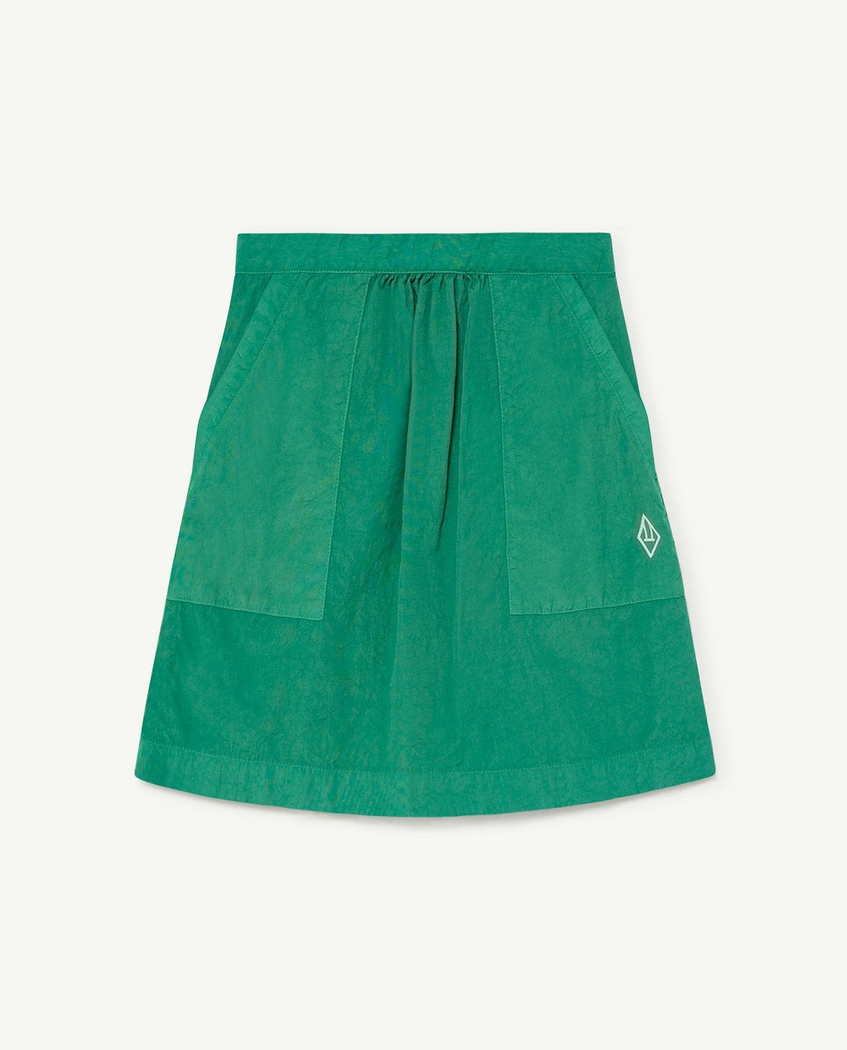 The Green Logo Bird Skirt features two front pockets and has a retro-inspired design. In a vibrant green featuring The Animals Observatory logo. The model's height is 129 cm and is wearing size 8 years.