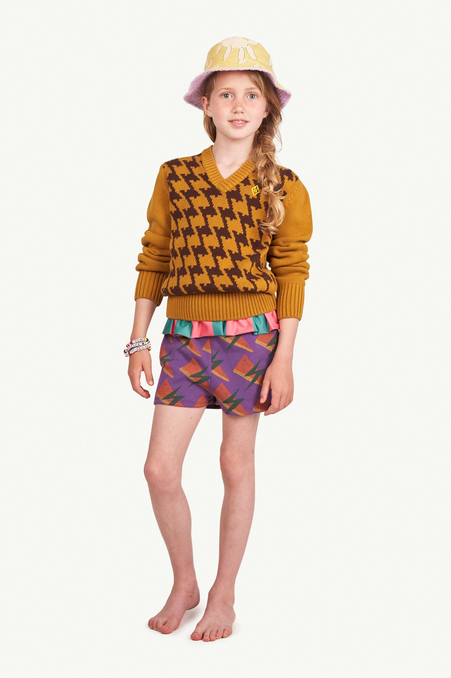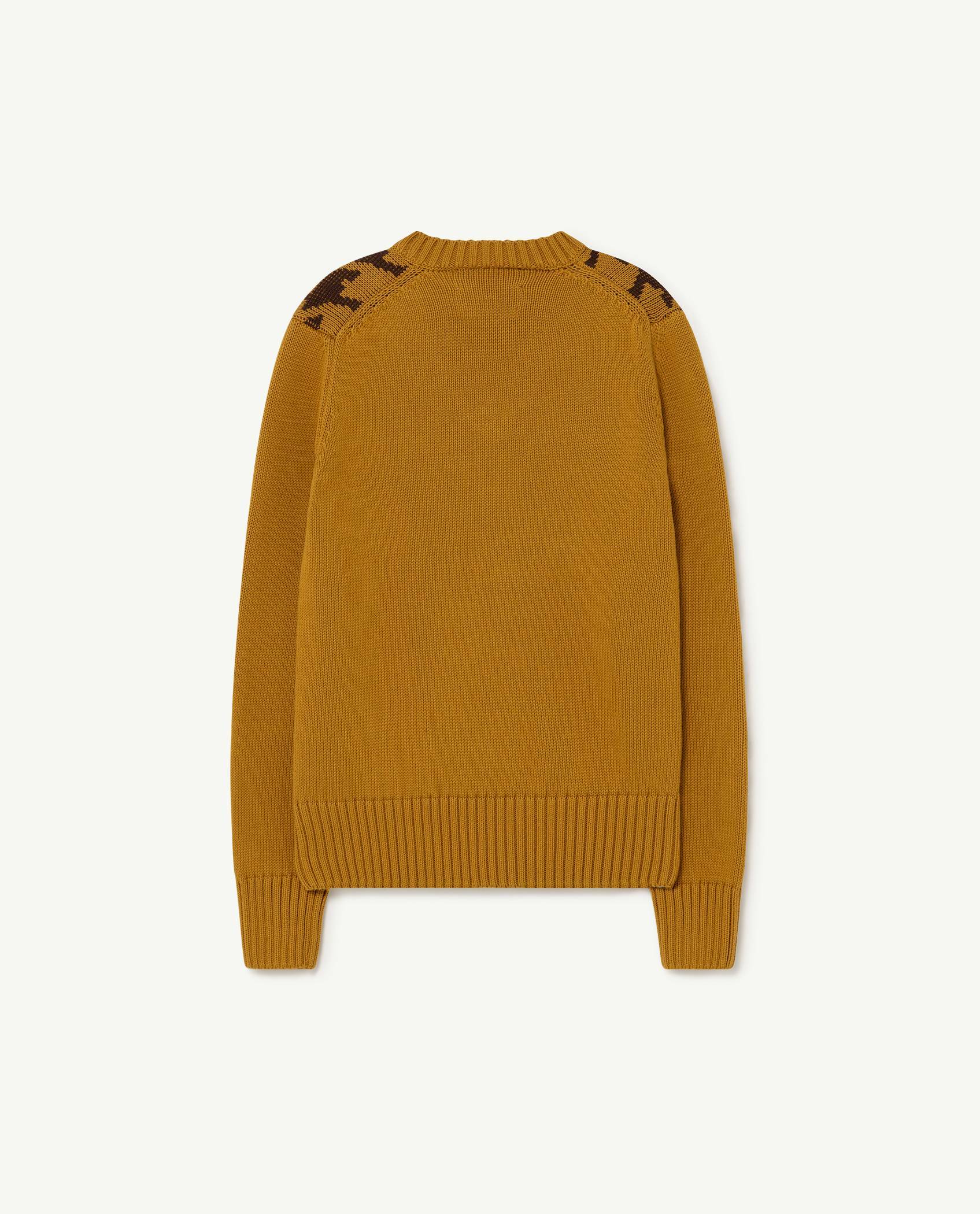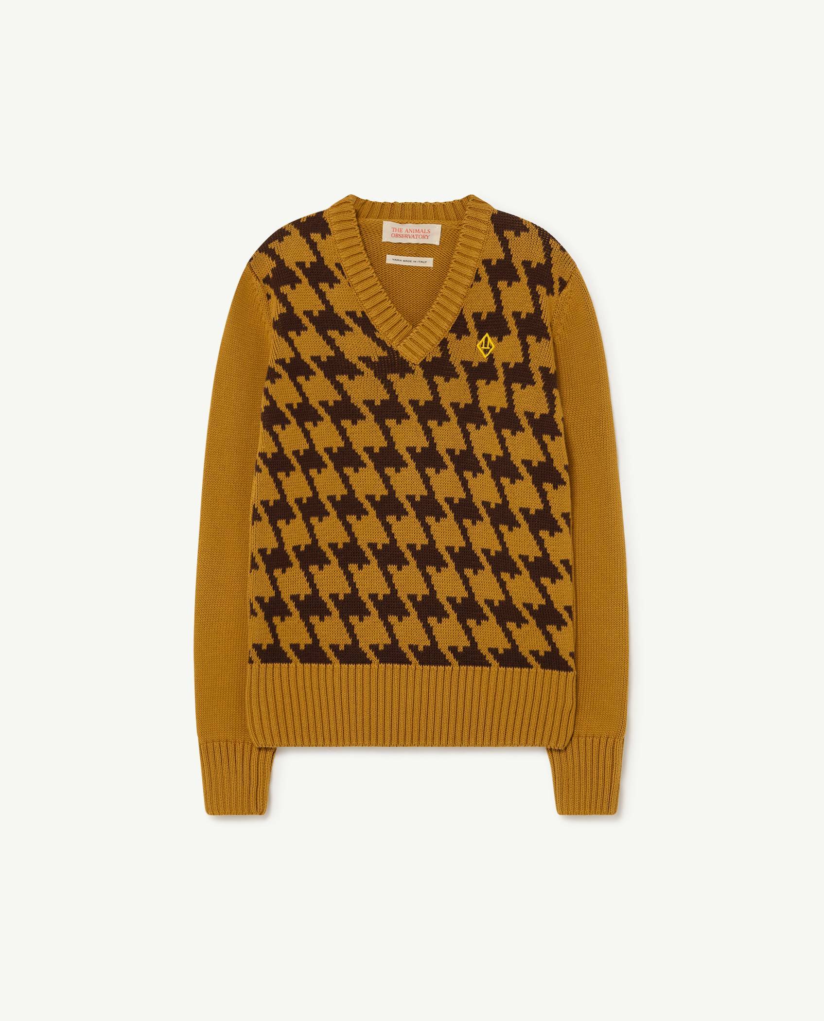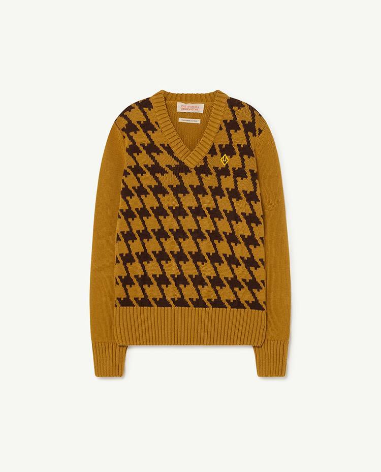 The Mustard Logo Toucan Sweater has a distinctly retro feel with its deep V-neck and sharp houndstooth print in a warm shade of mustard. The model's height is 132 cm and is wearing size 8 years.