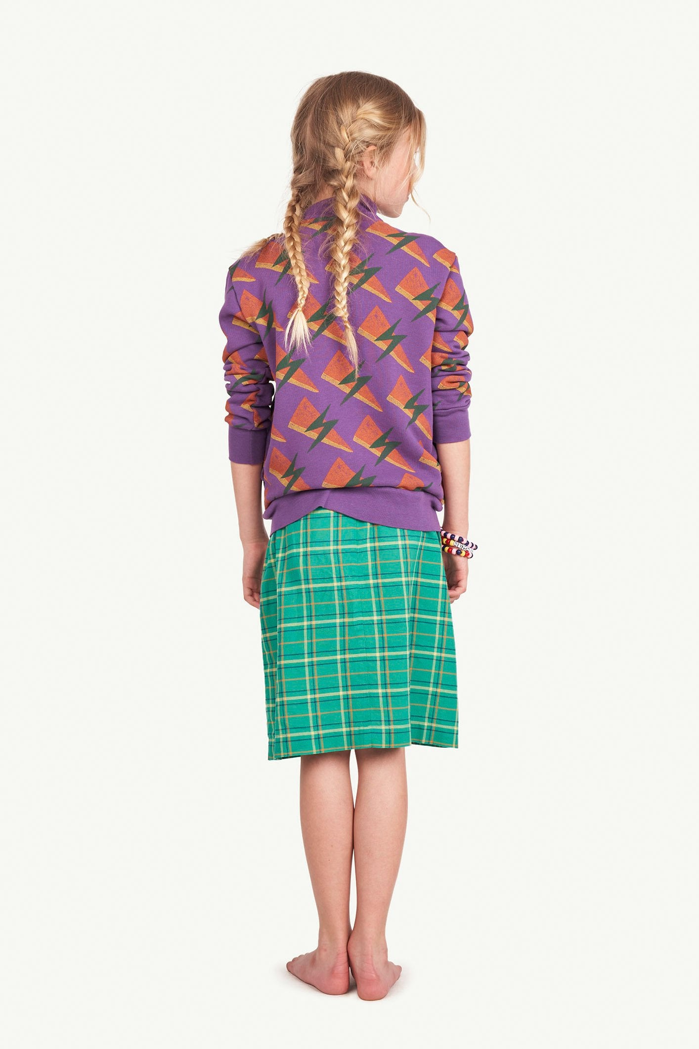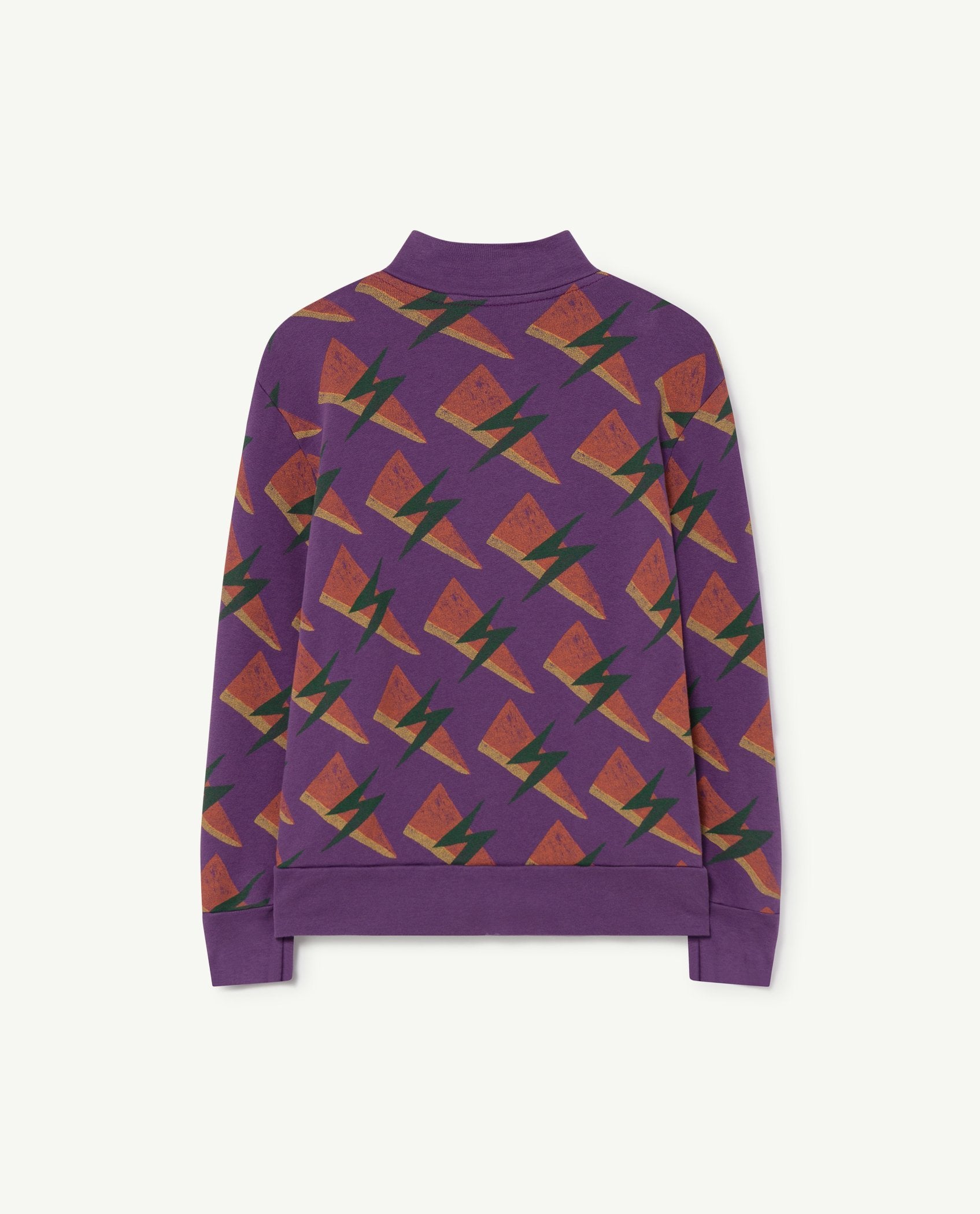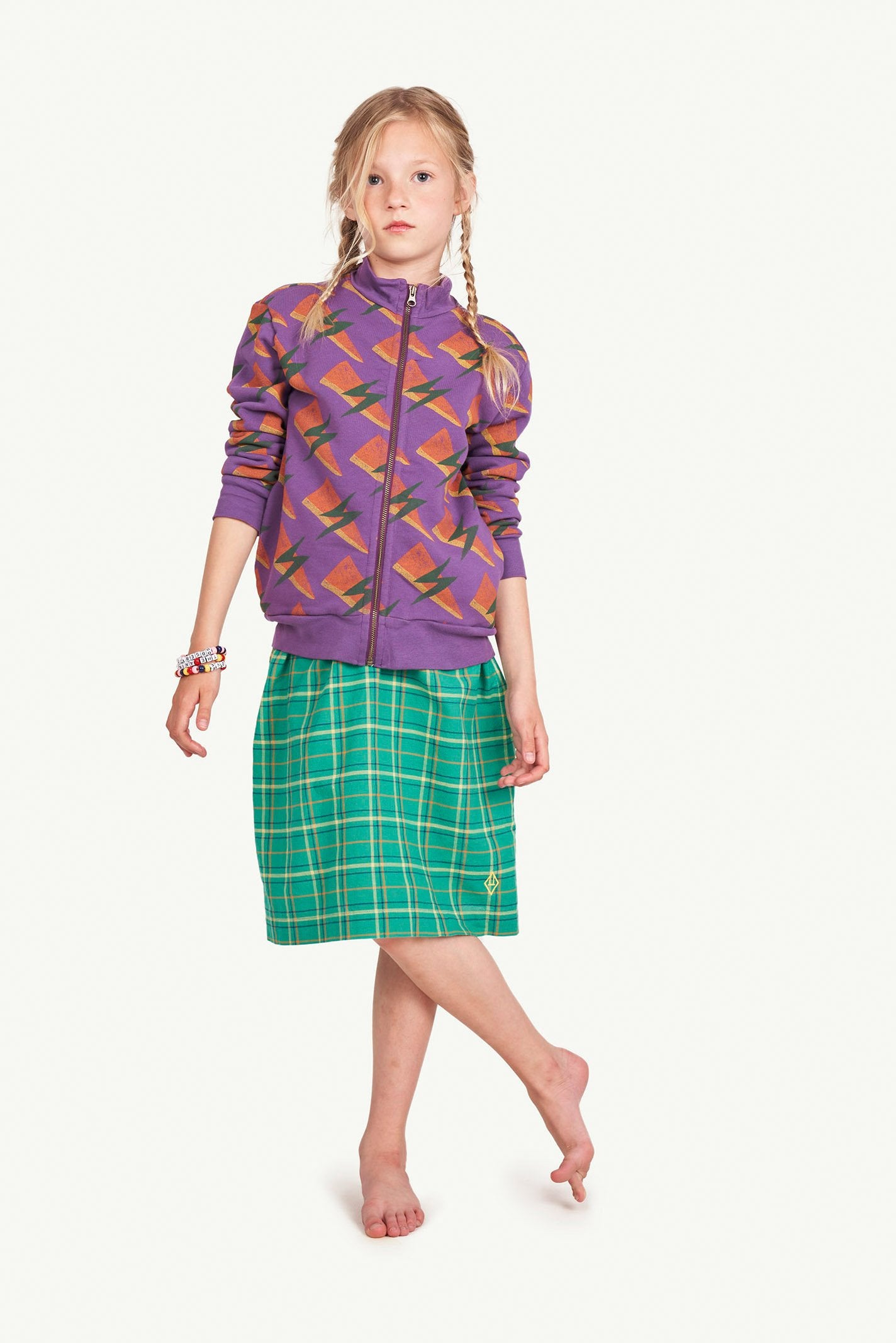The Purple Lightning Zebra Sweatshirt has a sporty look with a zip-up front and featuring a funky lightning pattern. The model's height is 129 cm and is wearing size 8 years.