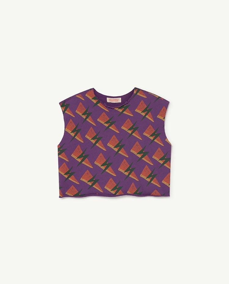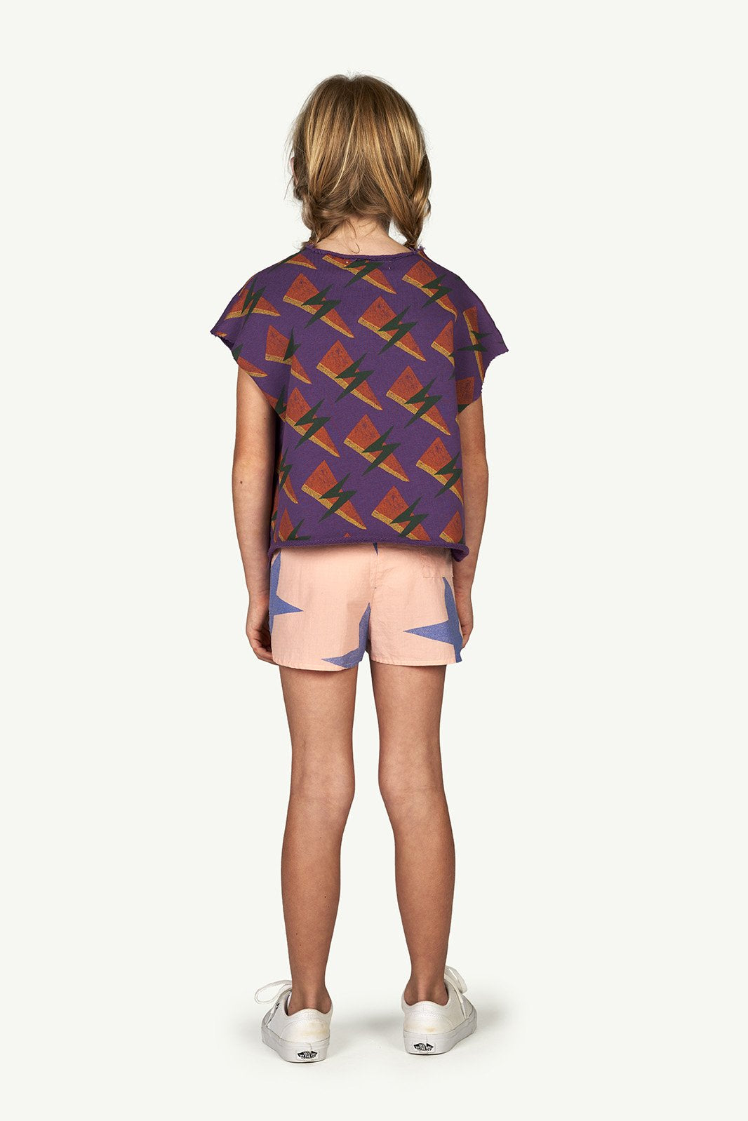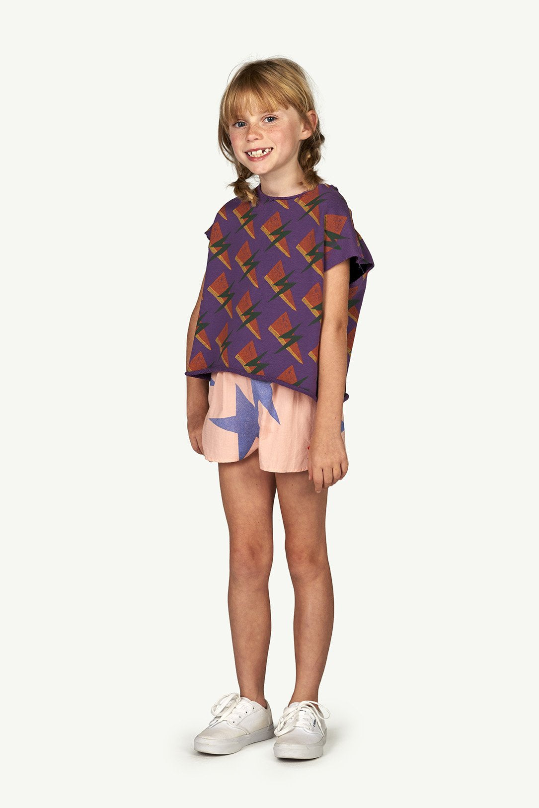 They'll be the coolest kid in town with the Purple Lightning Prawn T-Shirt with its cropped sleeves, round neck and urban-inspired design. Available exclusively on our online shop. The model's height is 126 cm and is wearing size 8 years.